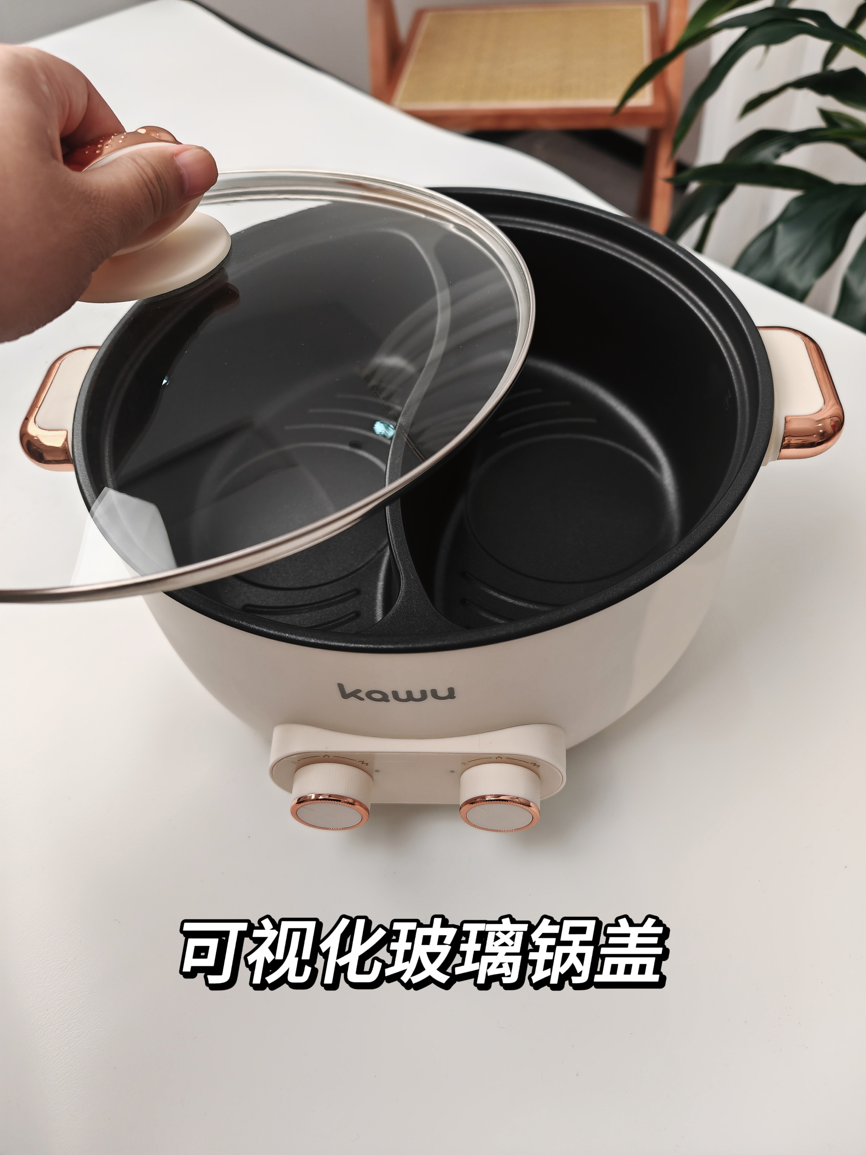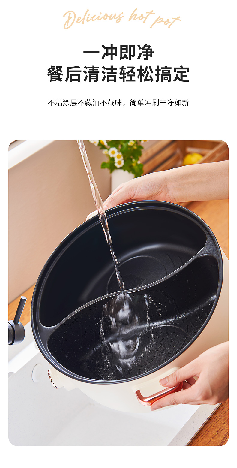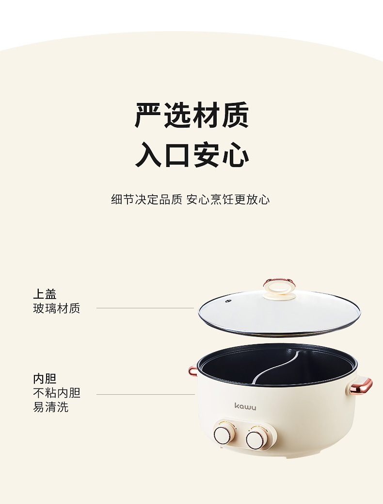 【详情】✅1600W功率,大火力热得快✅煎、炸、焖、炖、涮、煮完全没有问题✅可视玻璃锅盖,奶白色高颜值✅不粘涂层内胆,拒绝糊底✅独立双旋钮分区控制、两段火力调节、加深锅体设计