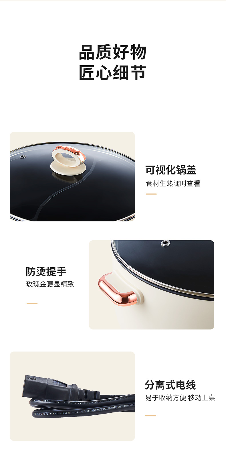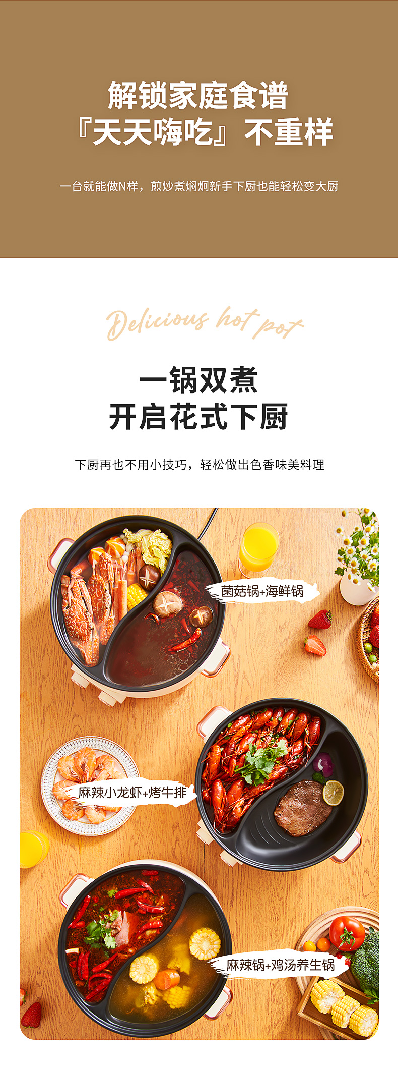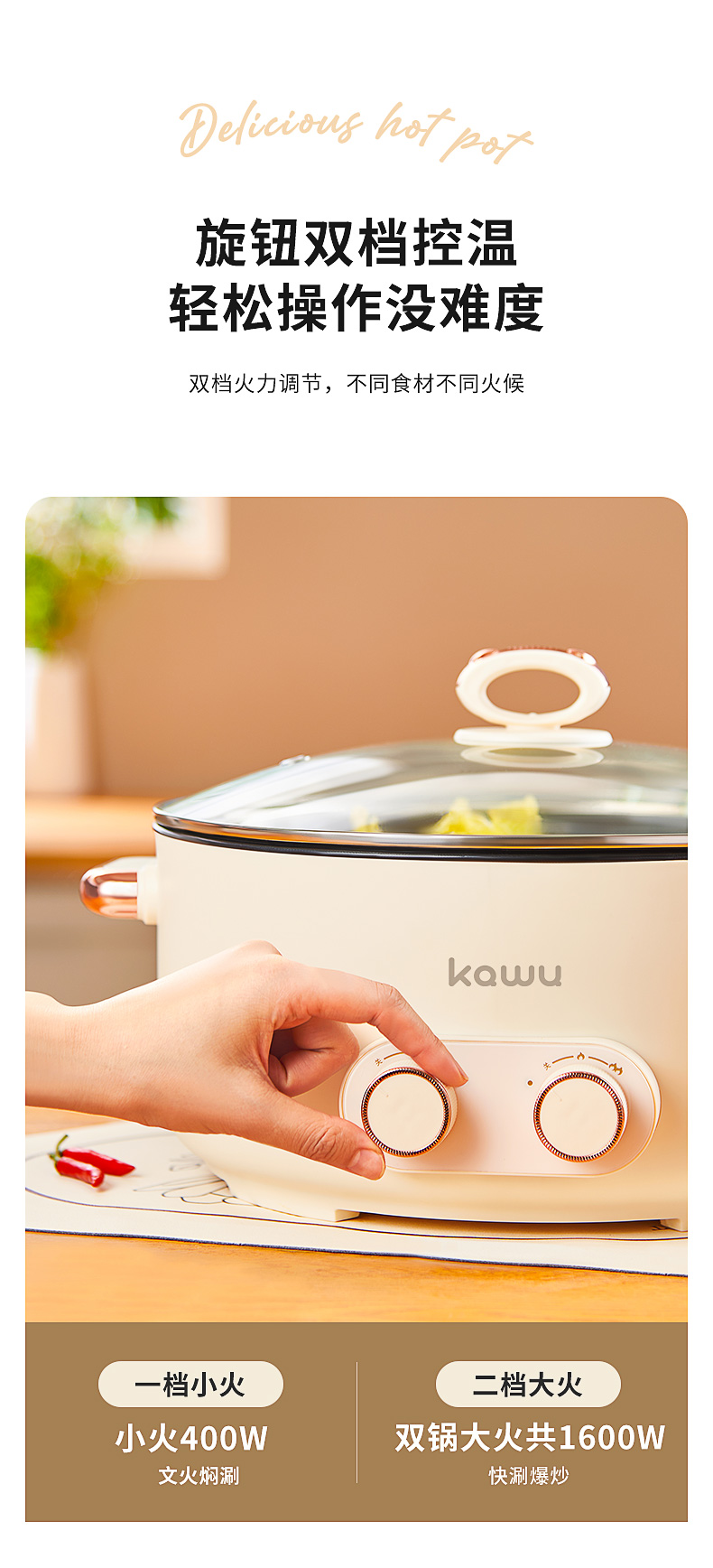 【详情】✅1600W功率,大火力热得快✅煎、炸、焖、炖、涮、煮完全没有问题✅可视玻璃锅盖,奶白色高颜值✅不粘涂层内胆,拒绝糊底✅独立双旋钮分区控制、两段火力调节、加深锅体设计
