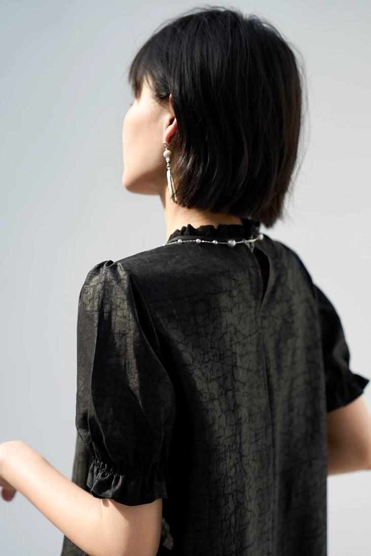 我们将领口木耳用了轻盈的乔其面料 ,即便贴着脖子也能感觉到柔软与顺滑,后面一粒扣可开,穿脱方便,更在转身之间不经意间流露出一丝小性感与别致。