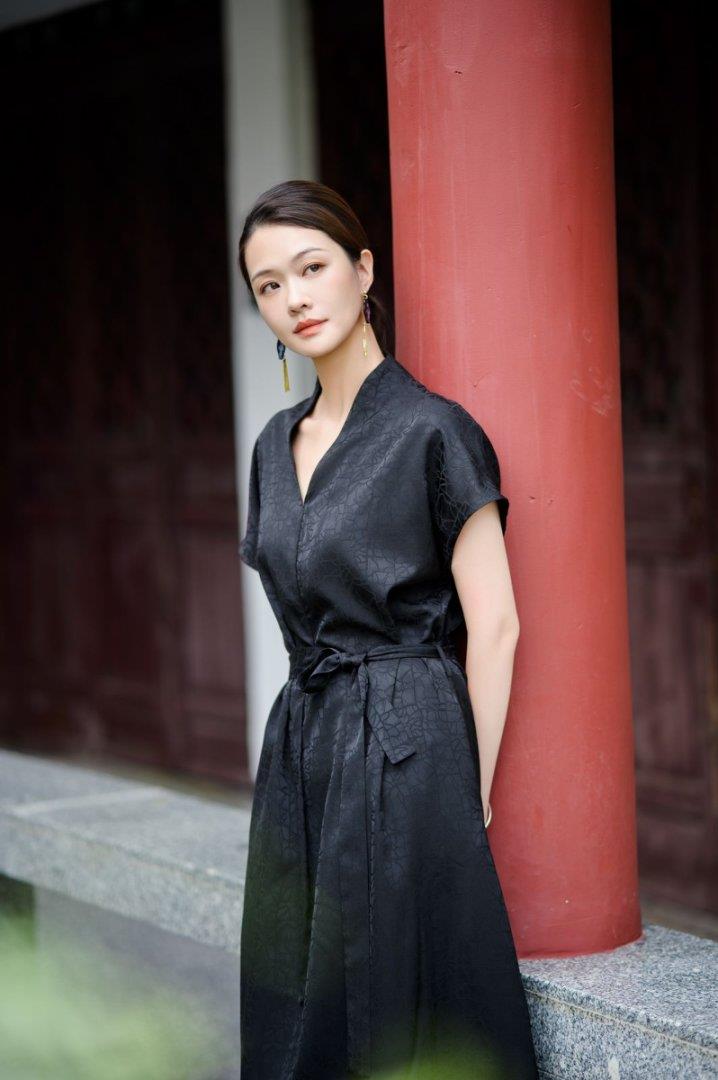 简约流畅的衣形灵动的质感,无形中注入一丝东方美感,属于香云纱的轻微的沙沙之声,在衣料间游走。