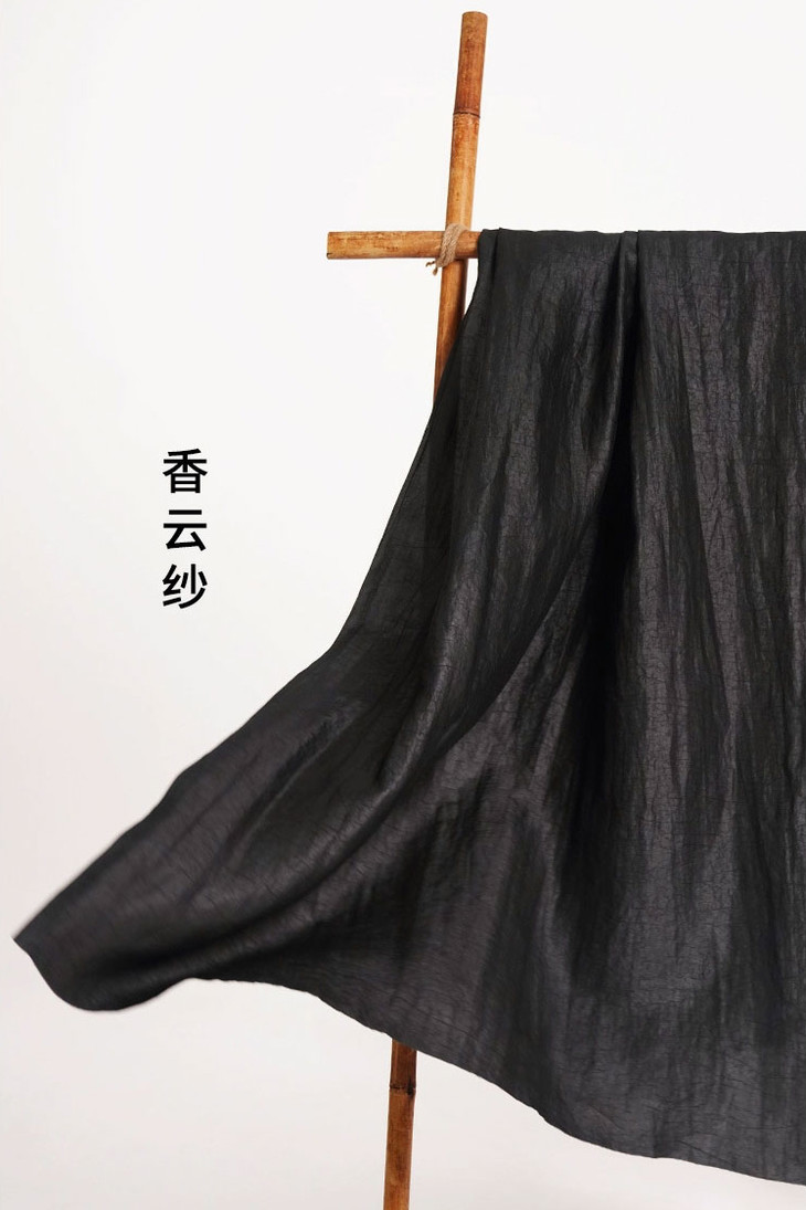 在存放一定时间,再拿到砂洗场进行砂洗而成的效果,所以面料触感也如香云纱一般舒爽亲肤。
