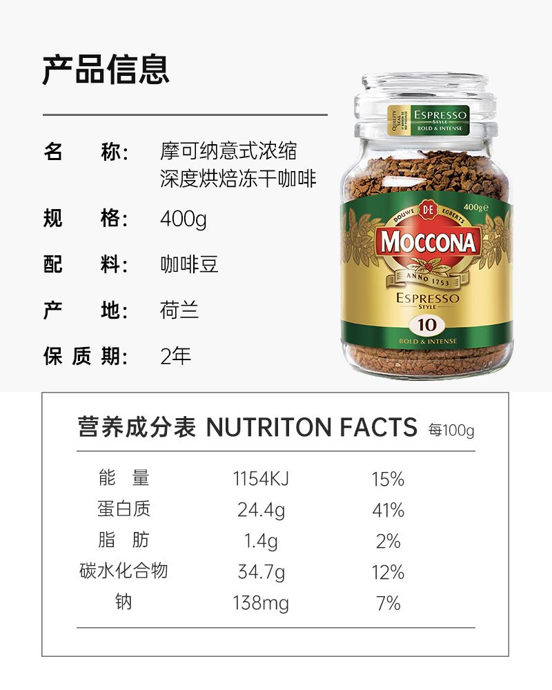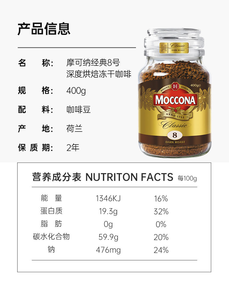 摩可纳经典8号深度烘焙 10号意式浓缩400g/罐 冻干速溶黑咖啡【保税进口】