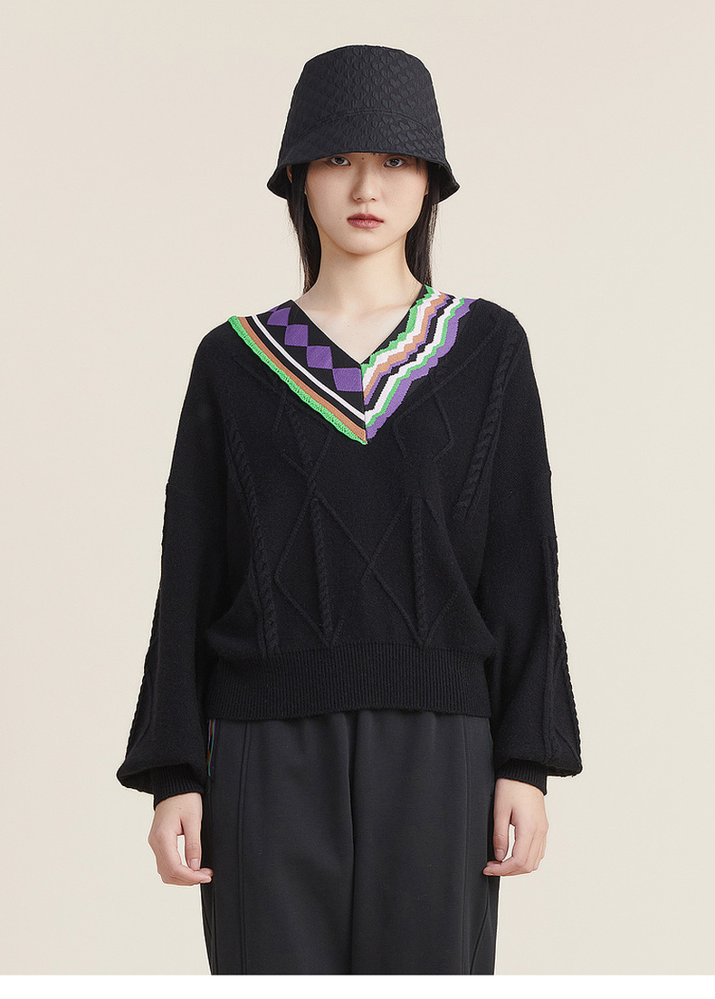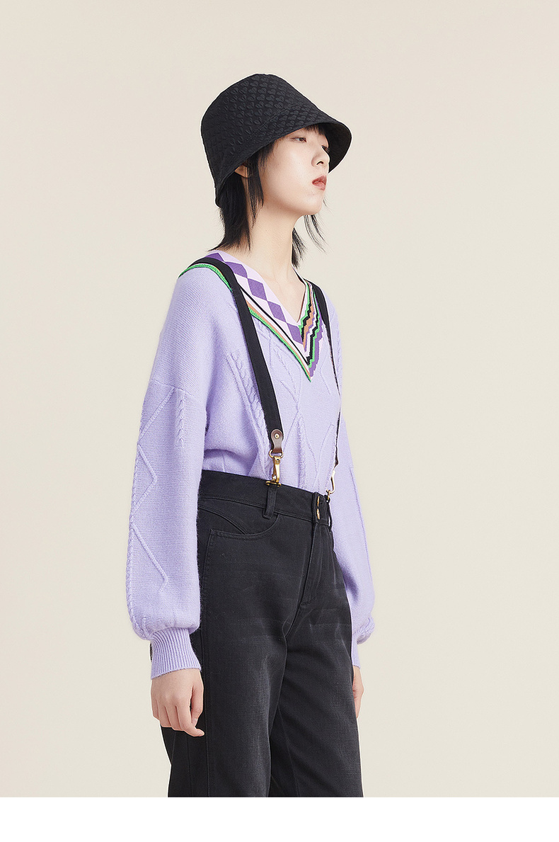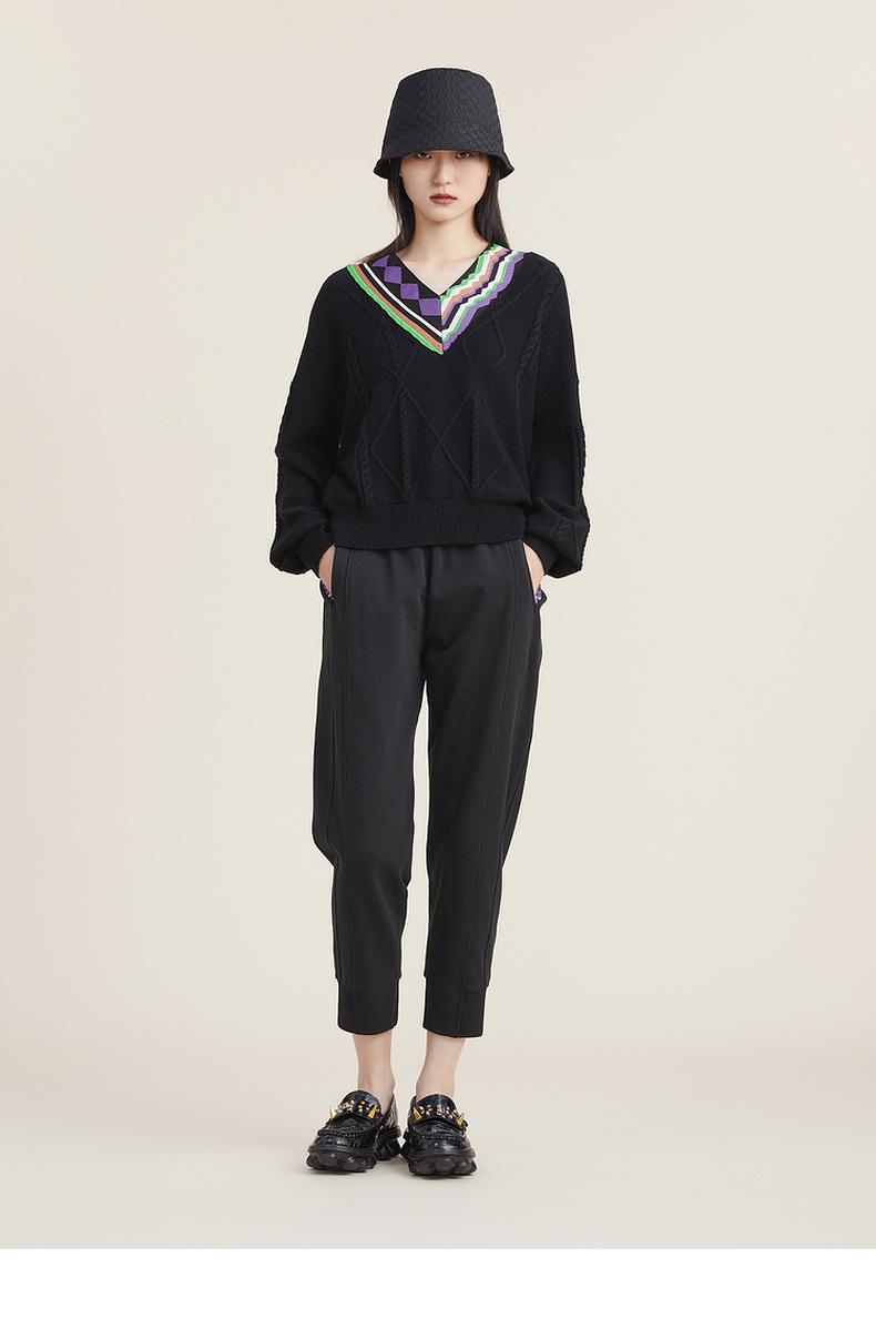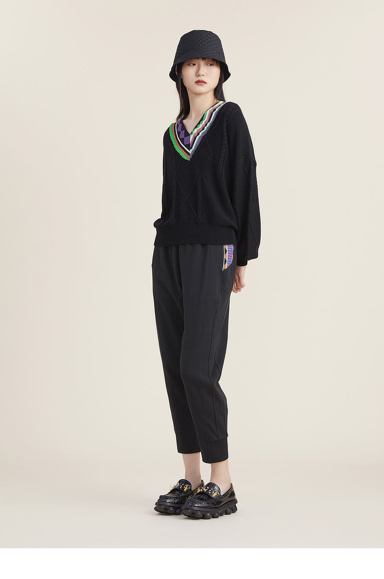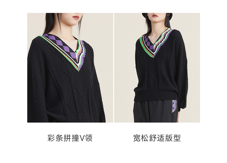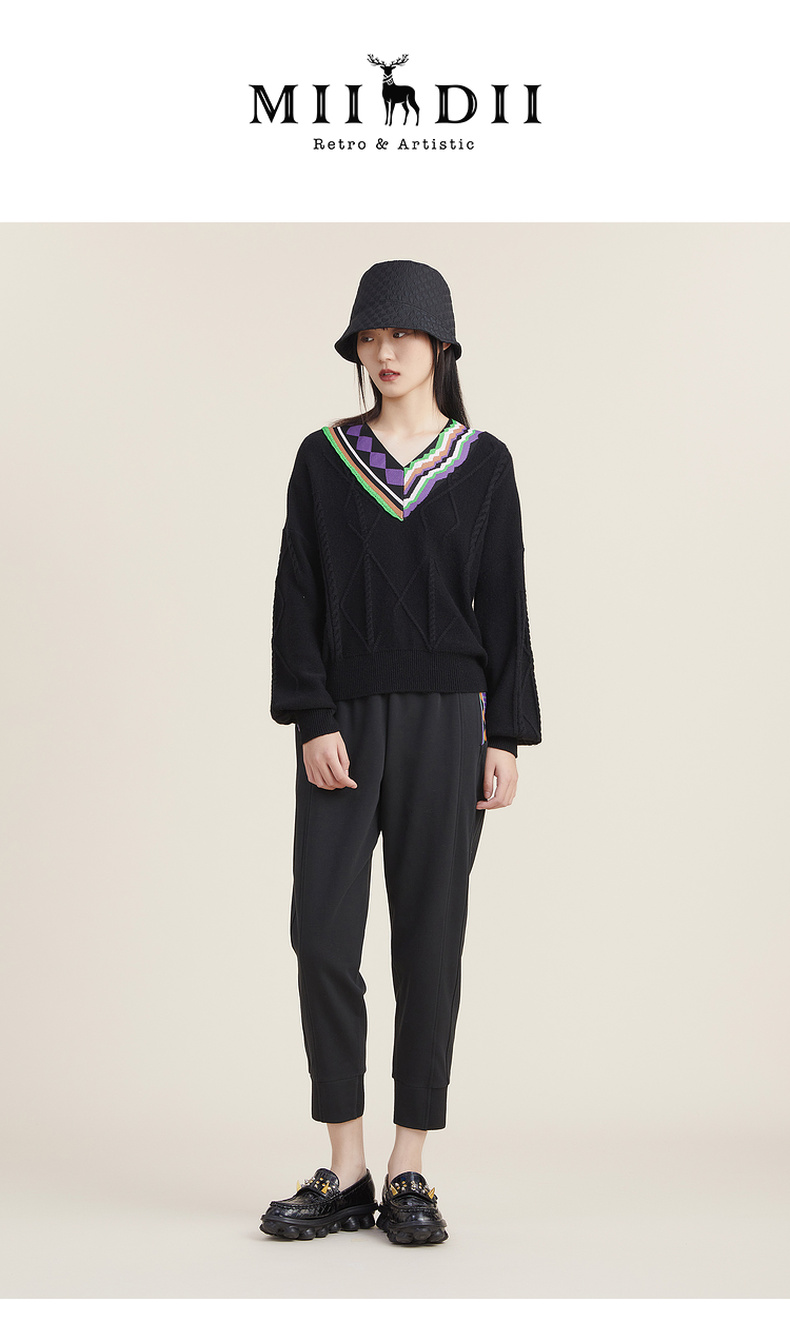 谜底2022秋新款复古V领宽松百搭时尚针织衫毛衫长袖女223MZ1378