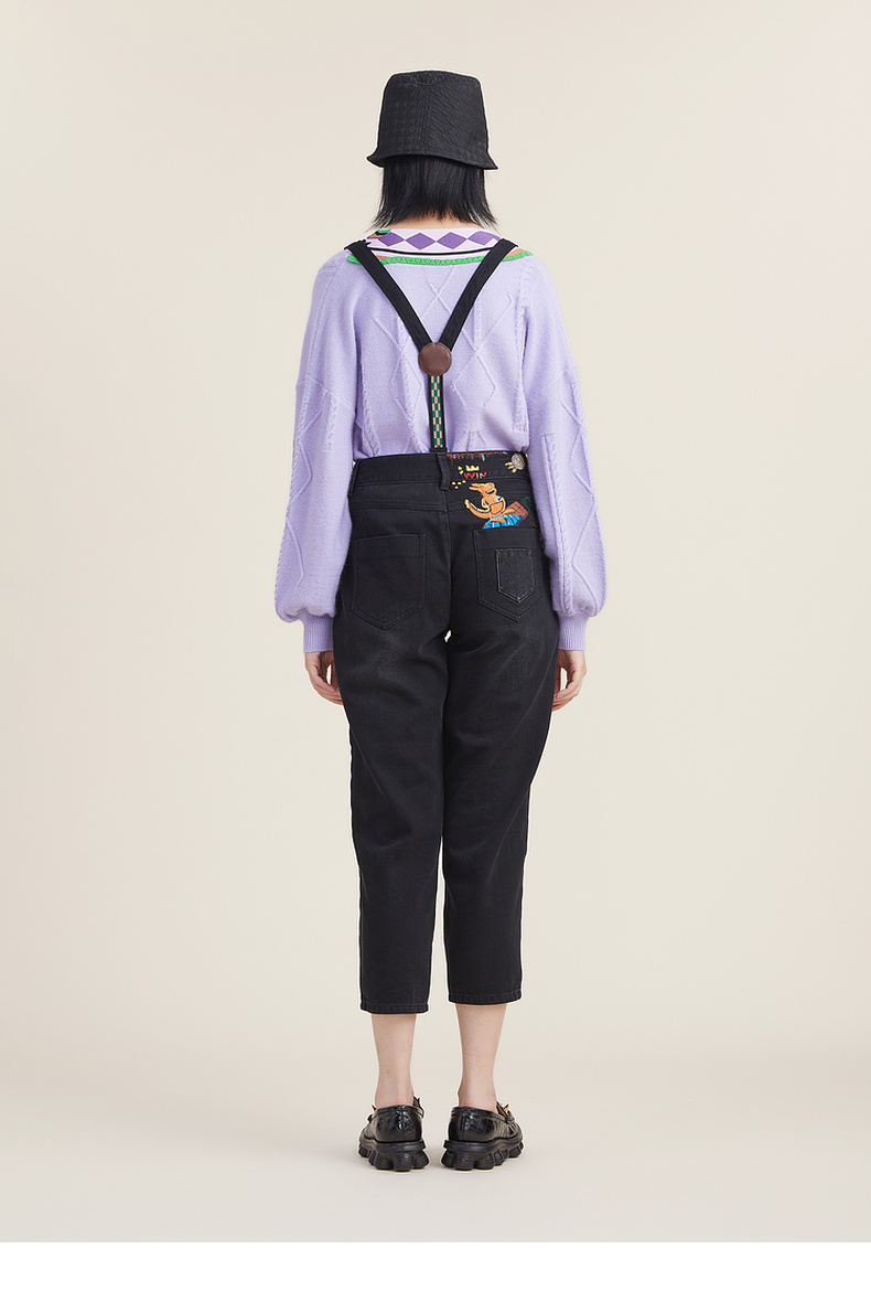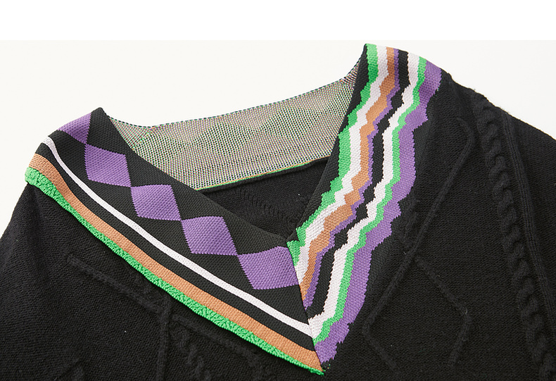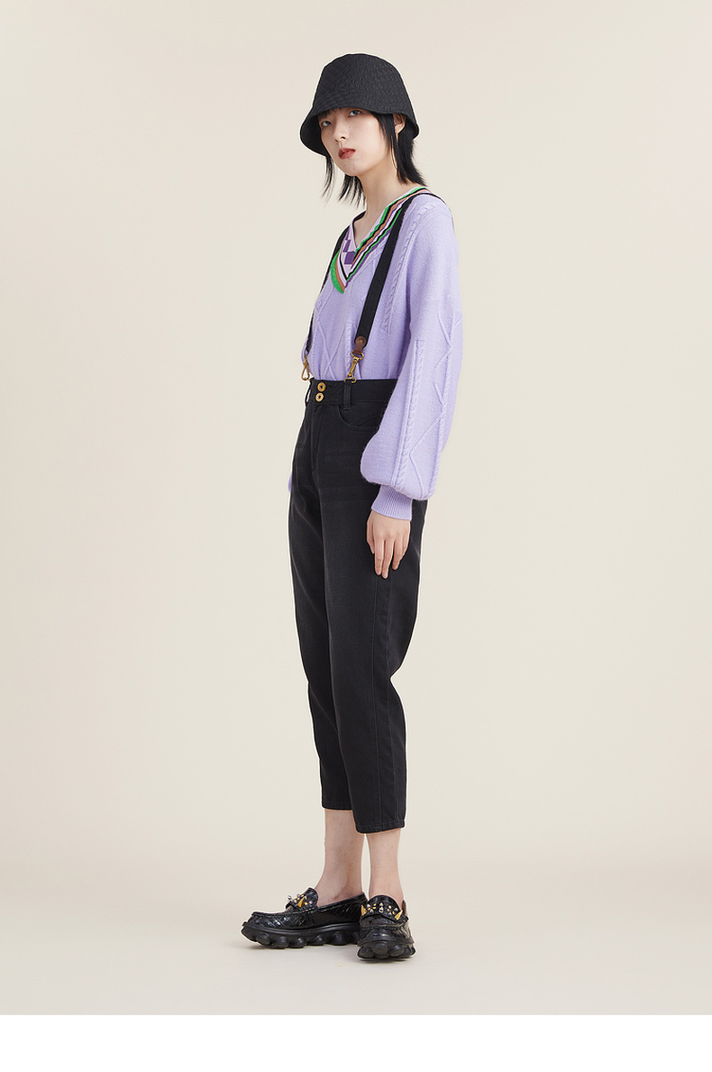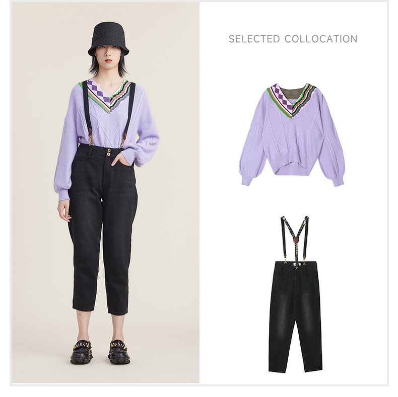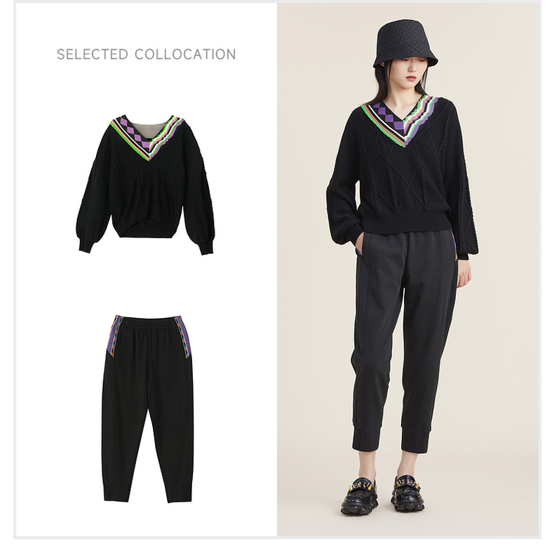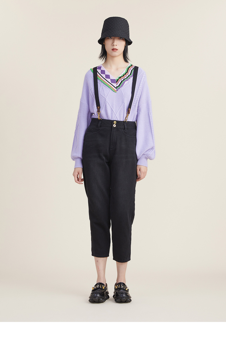 谜底2022秋新款复古V领宽松百搭时尚针织衫毛衫长袖女223MZ1378