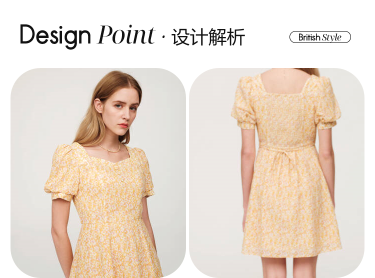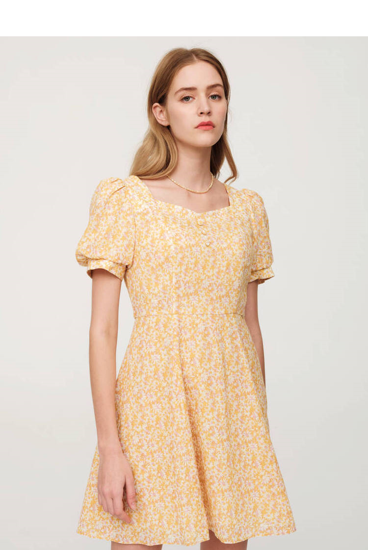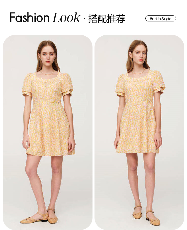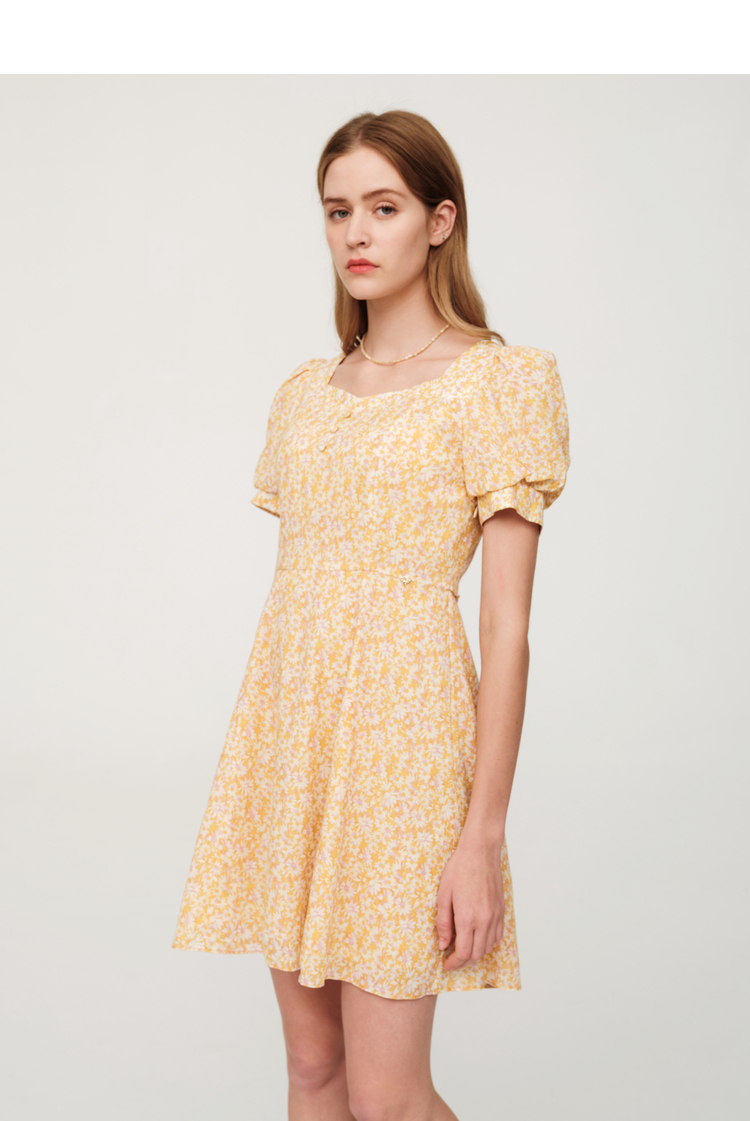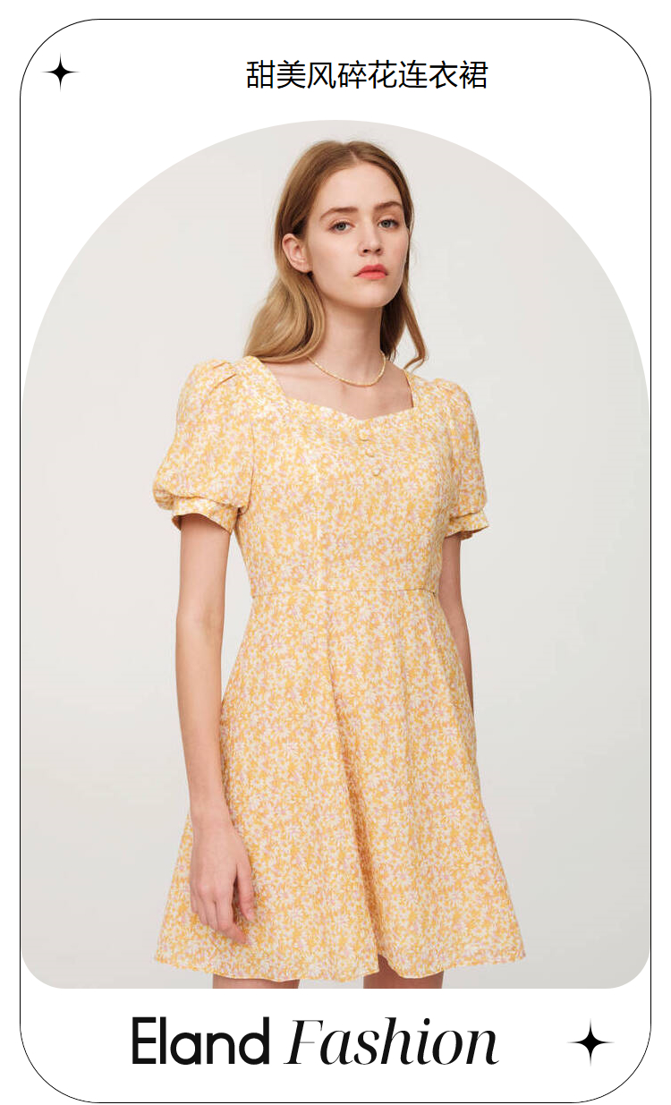 ELAND衣恋2022年春新款女士小众泡泡袖洋气肌理感短袖碎花连衣裙EEOWC25H2D