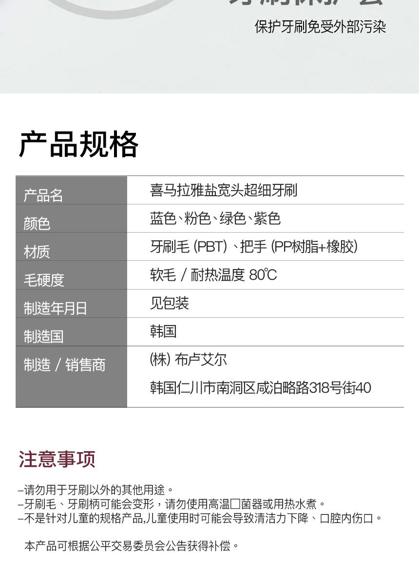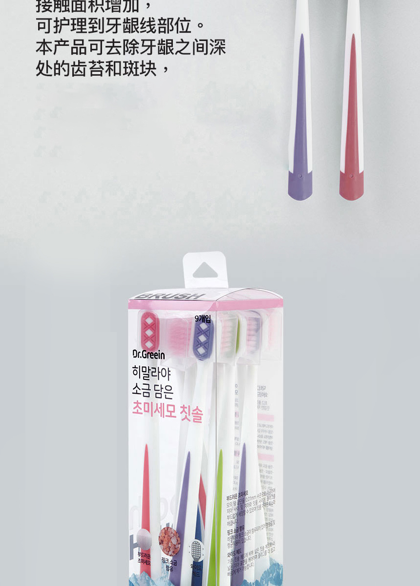 【品名】【超值2盒装】格芮茵 喜马拉雅盐宽头软毛牙刷 韩国进口 9支/盒 【规格】9支/盒 【产地】韩国 【发货包装】独立包装 【发货地】广州 【发货快递】圆通 【不发货区域】新疆、西藏、港澳台 【发货时效】48-72小时,周末节假日顺延 |