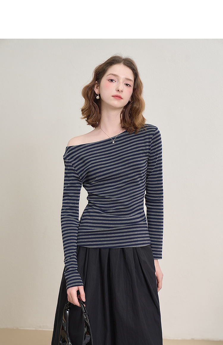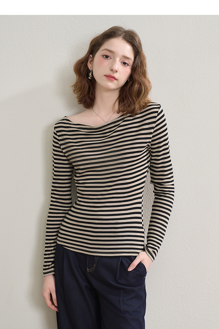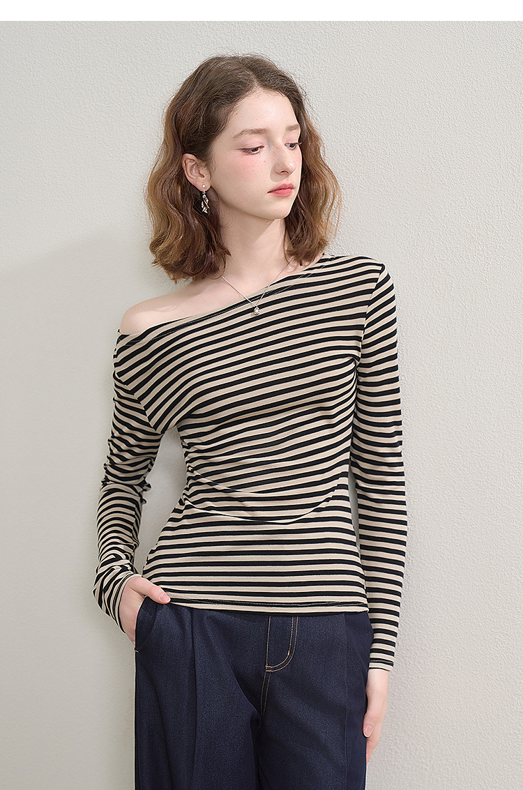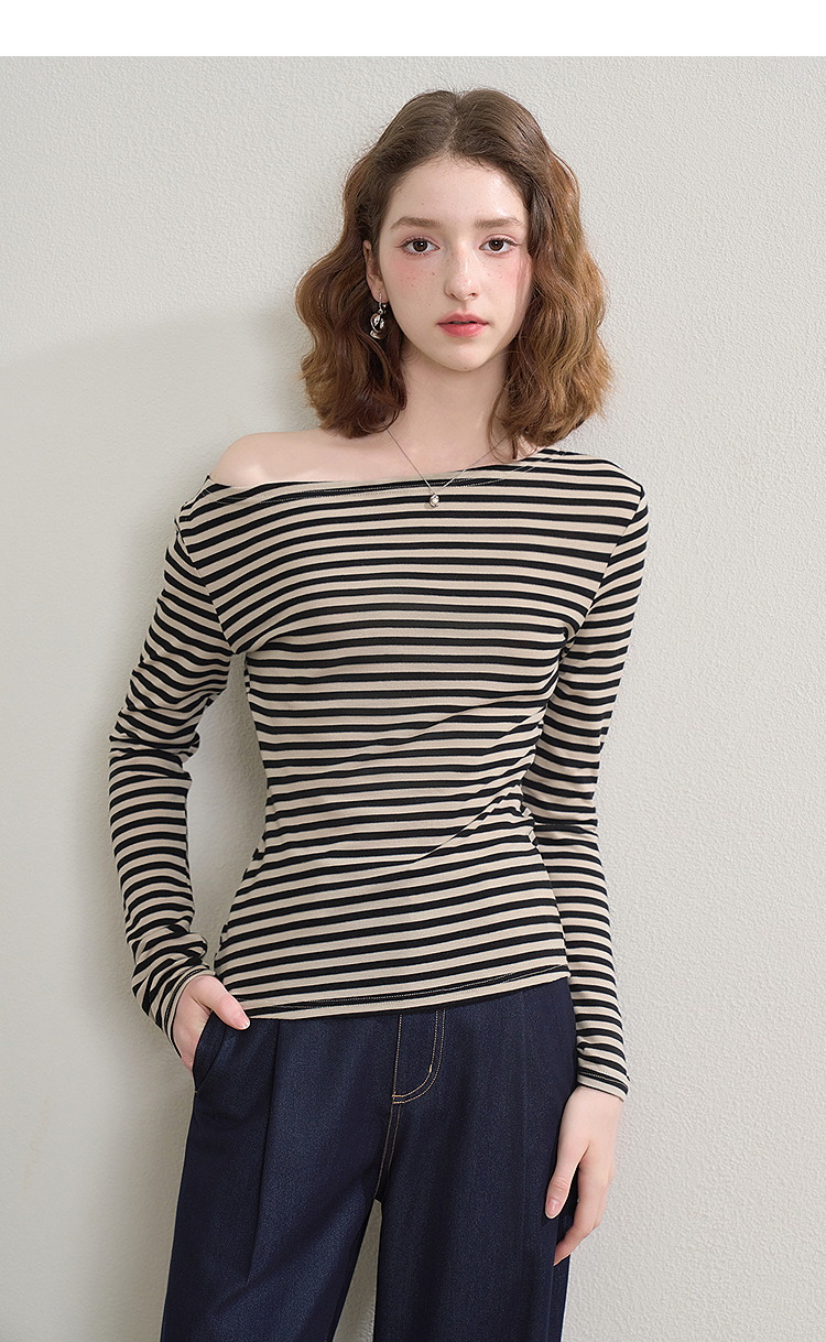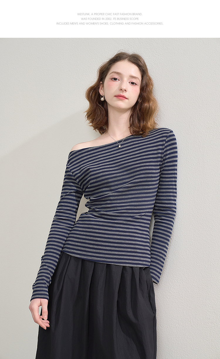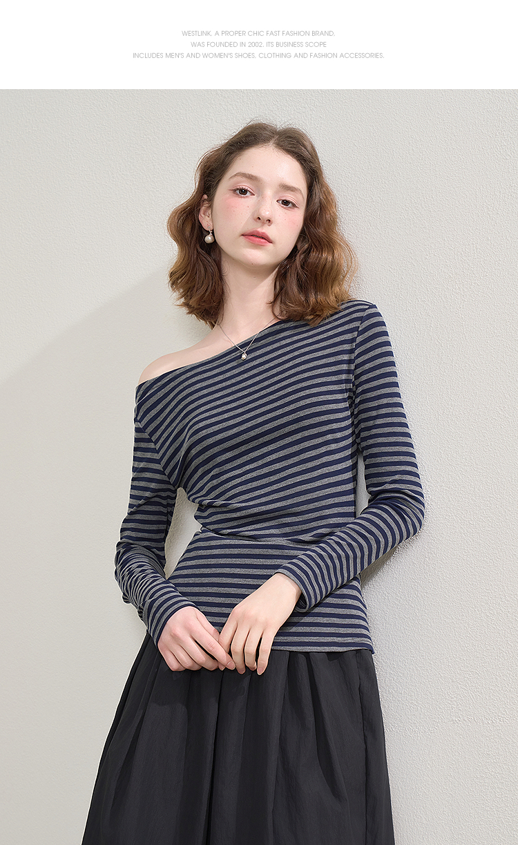 西遇韩系撞色条纹斜肩长袖T恤女秋季修身内搭打底衫上衣V2551140