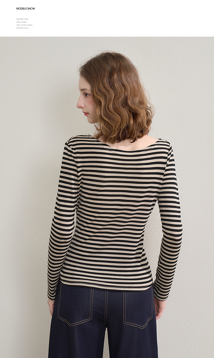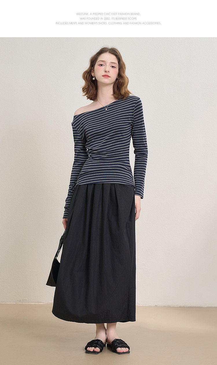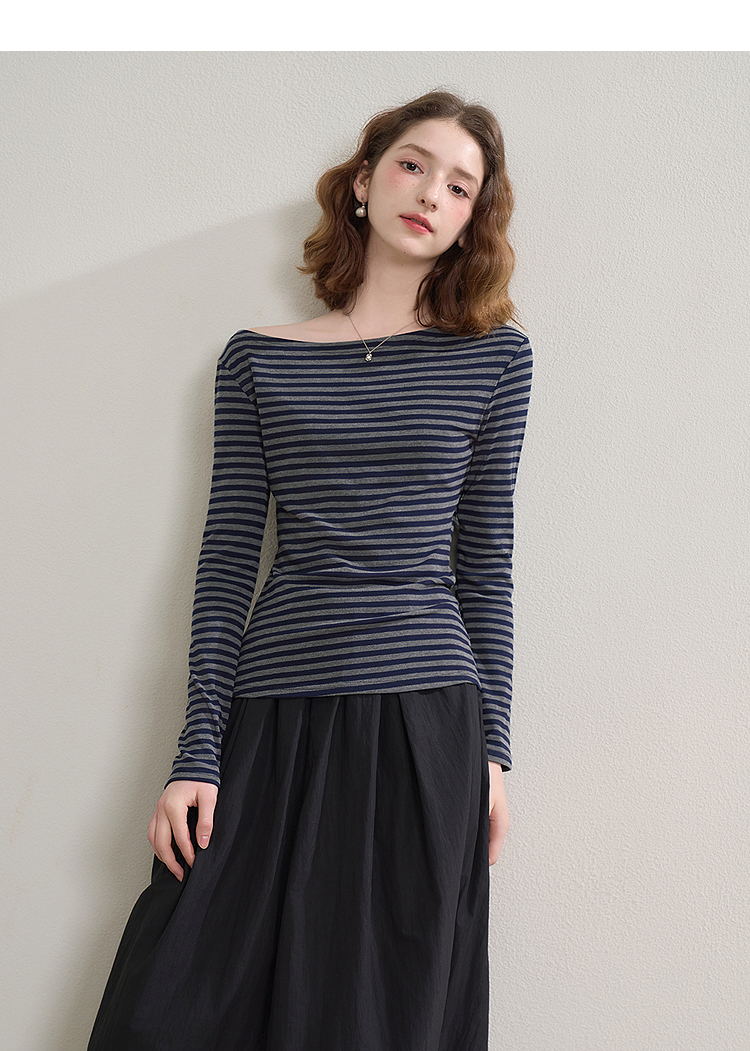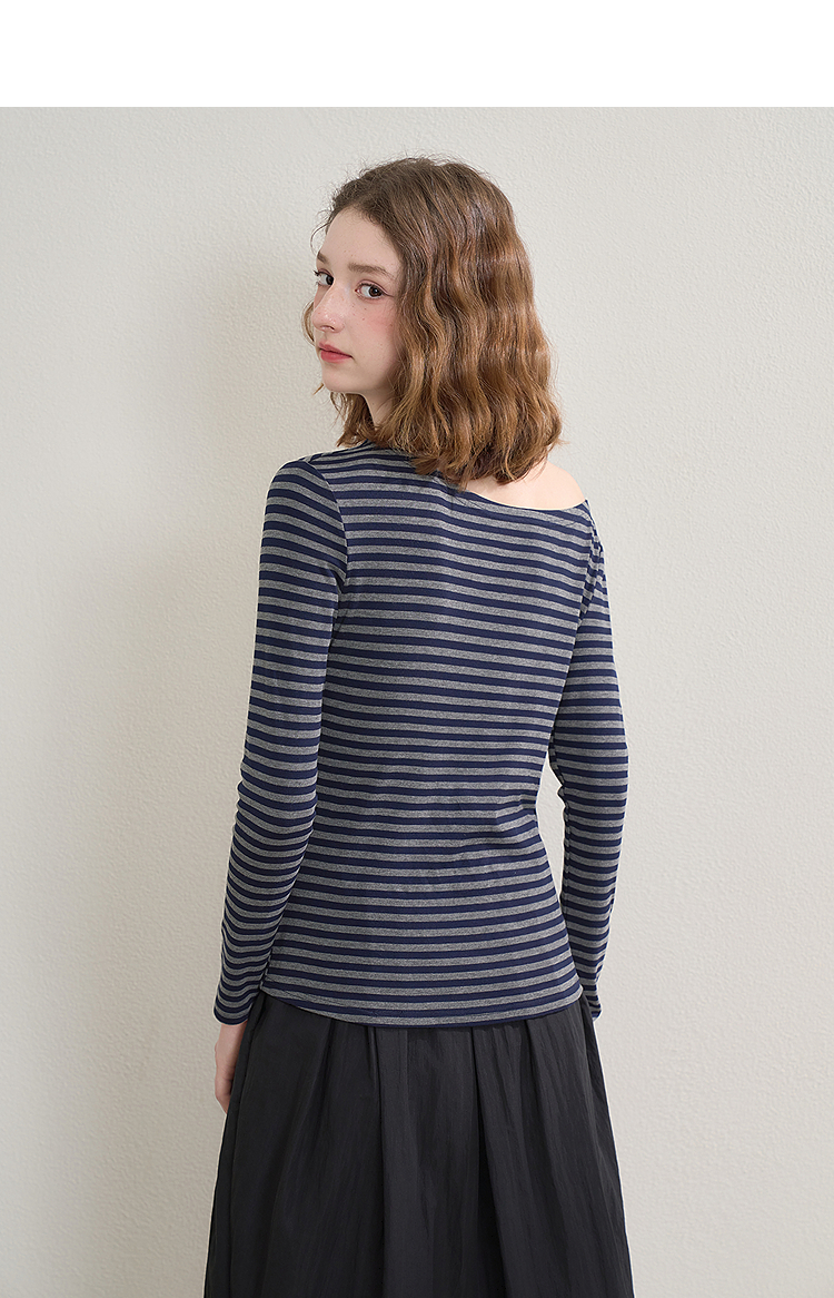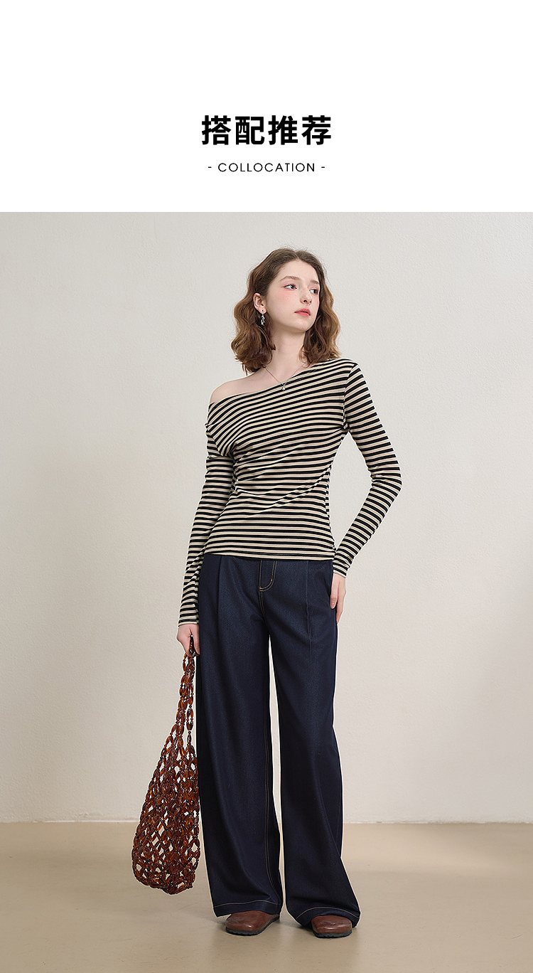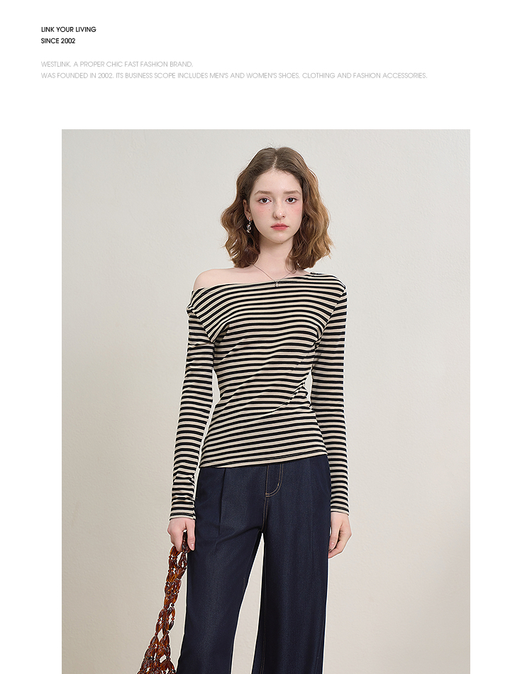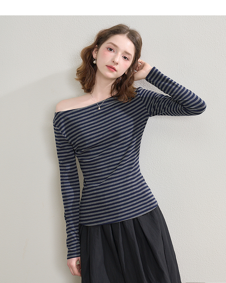 西遇韩系撞色条纹斜肩长袖T恤女秋季修身内搭打底衫上衣V2551140