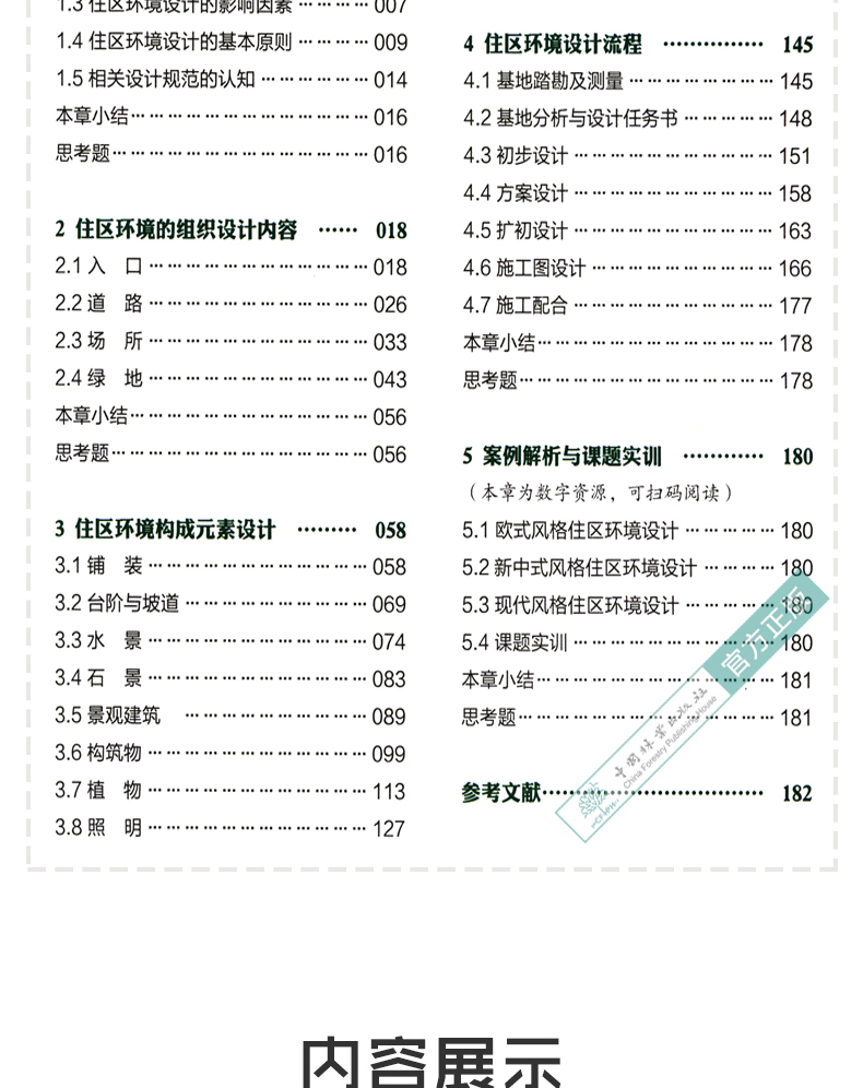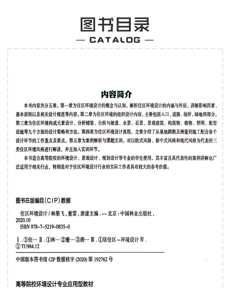 本书内容共分五章。第一章为住区环境设计的概念与认知,解析住区环境设计的内涵与外延,讲解影响因素、基本原则以及相关设计规范等内容。第二章为住区环境的组织设计内容,主要包括人口、道路、场所、绿地四部分。第三章为住区环境构成元素设计,分析铺装、台阶与坡道、水景、石景、景观建筑、构筑物、植物、照明、配套设施等九个方面的设计策略和方法。第四章为住区环境设计流程,主要介绍了从基地踏勘及测量到施工配合各个设计环节的工作重点及要点。第五章为案例解析与课题实训,对以欧式风格、新中式风格和现代风格为代表的三类住区环境风格进行解读,并且加入实训环节。 本书适合高等院校的环境设计、景观设计、规划设计等专业的学生使用,其丰富且具代表性的案例讲解也广泛适用于相关行业,特别是对于住区环境设计行业的实际工作者具有较大的参考价值。