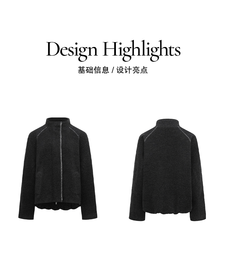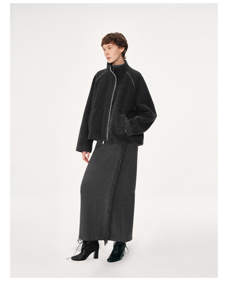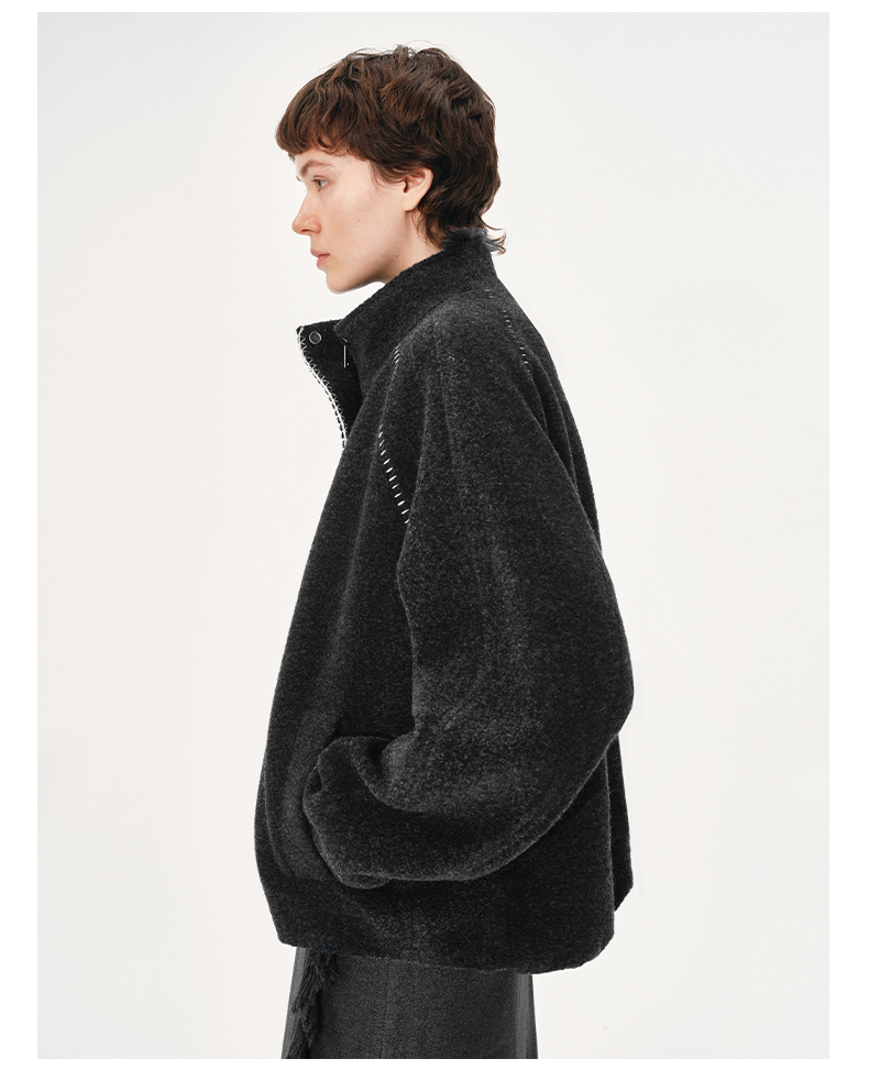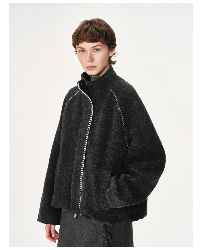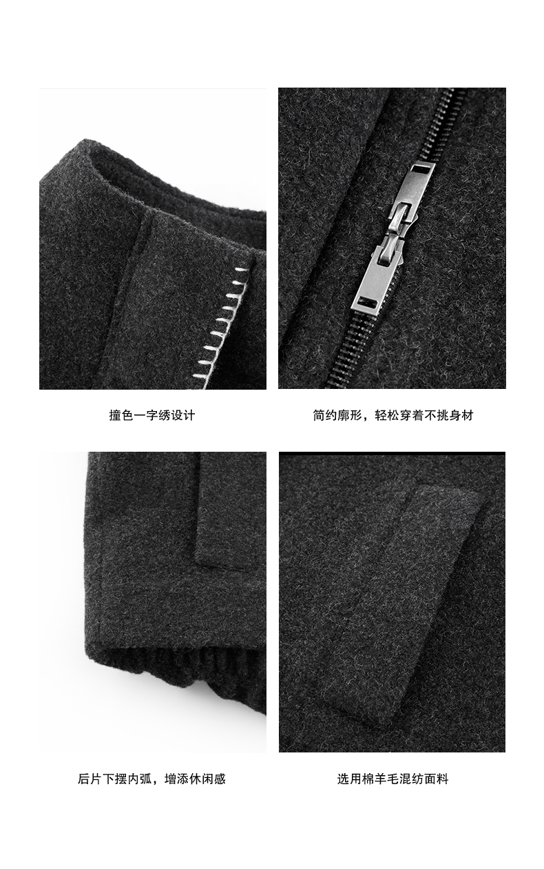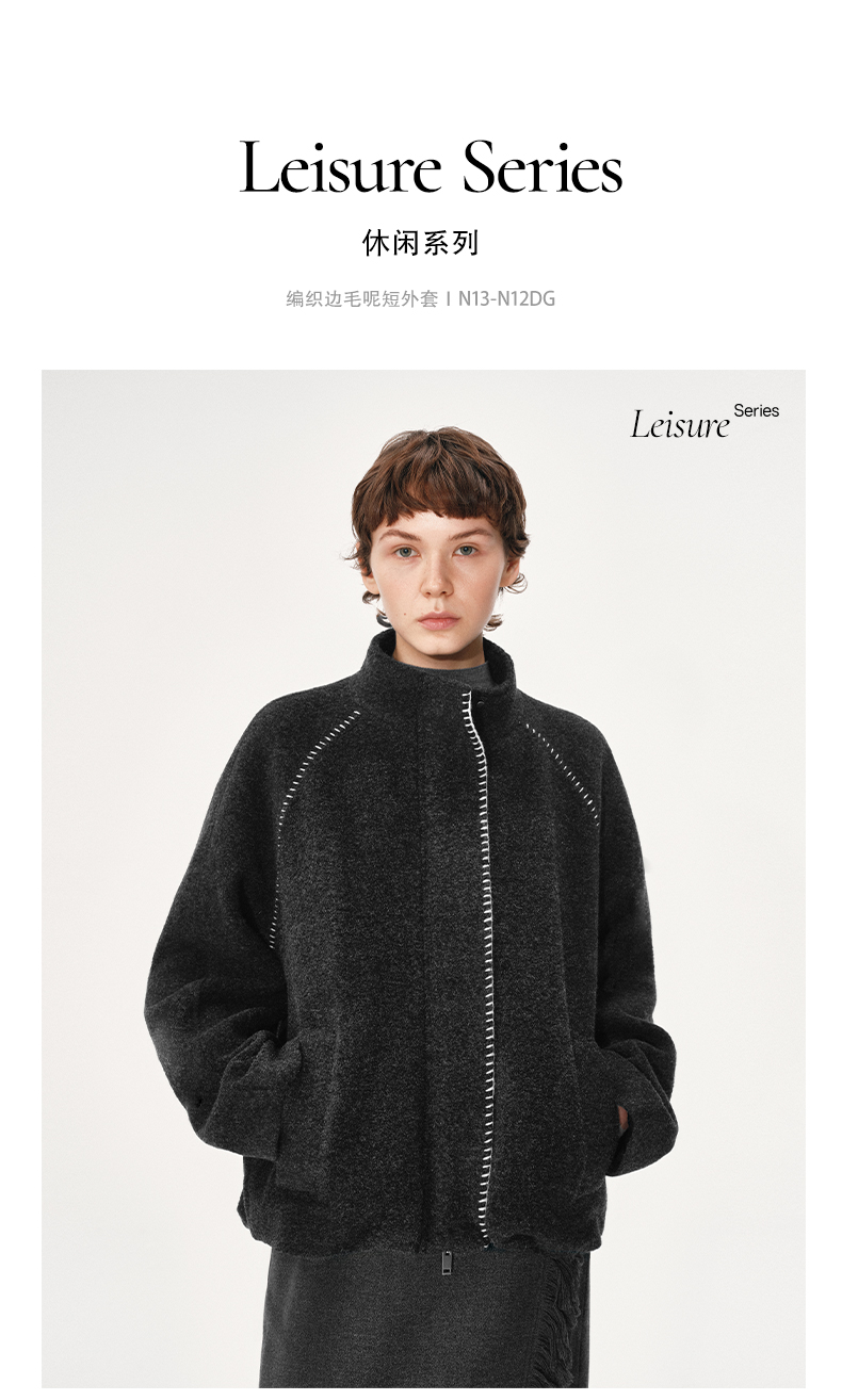 NUTH羊毛混纺撞色编织边宽松廓形毛呢外套女 深灰色(发货时间同步天猫)