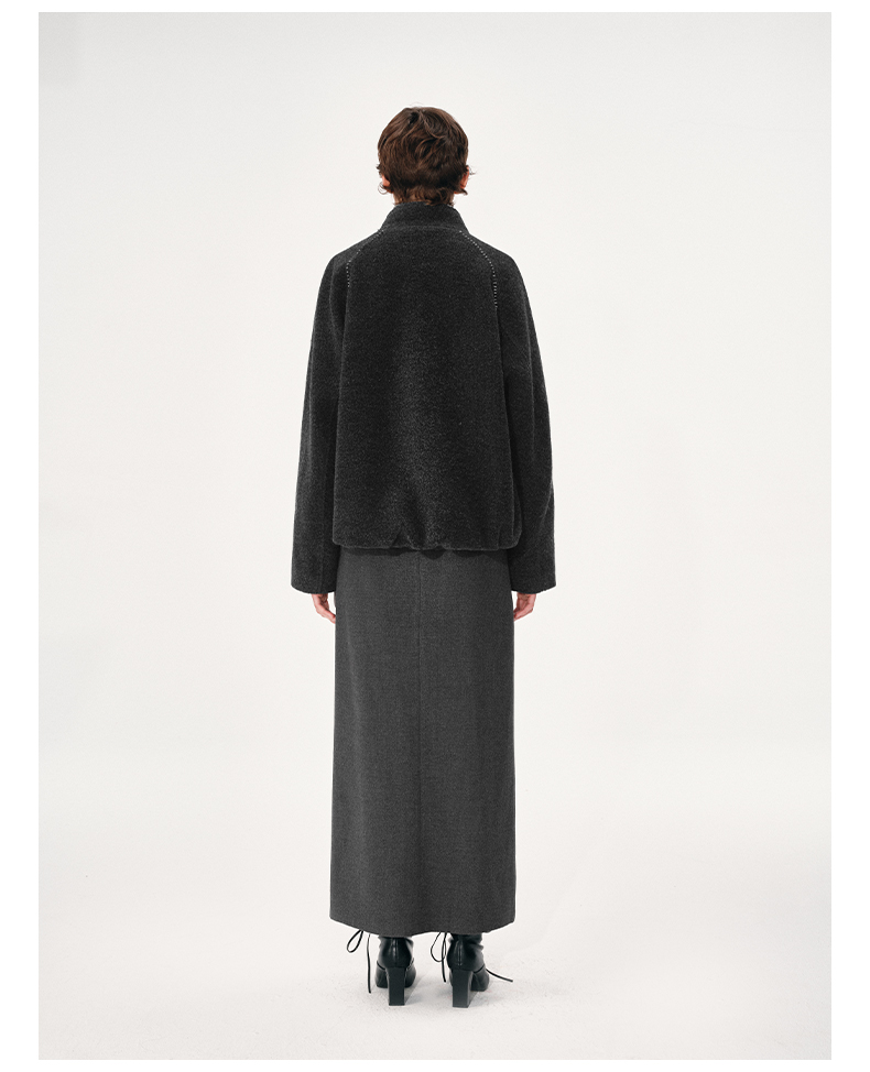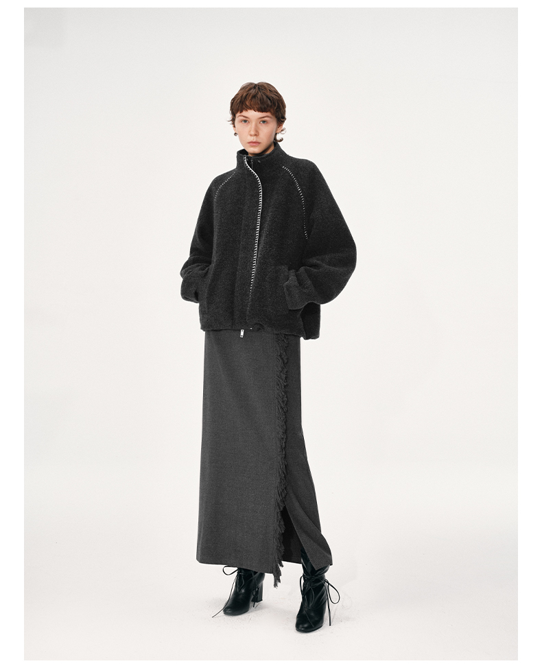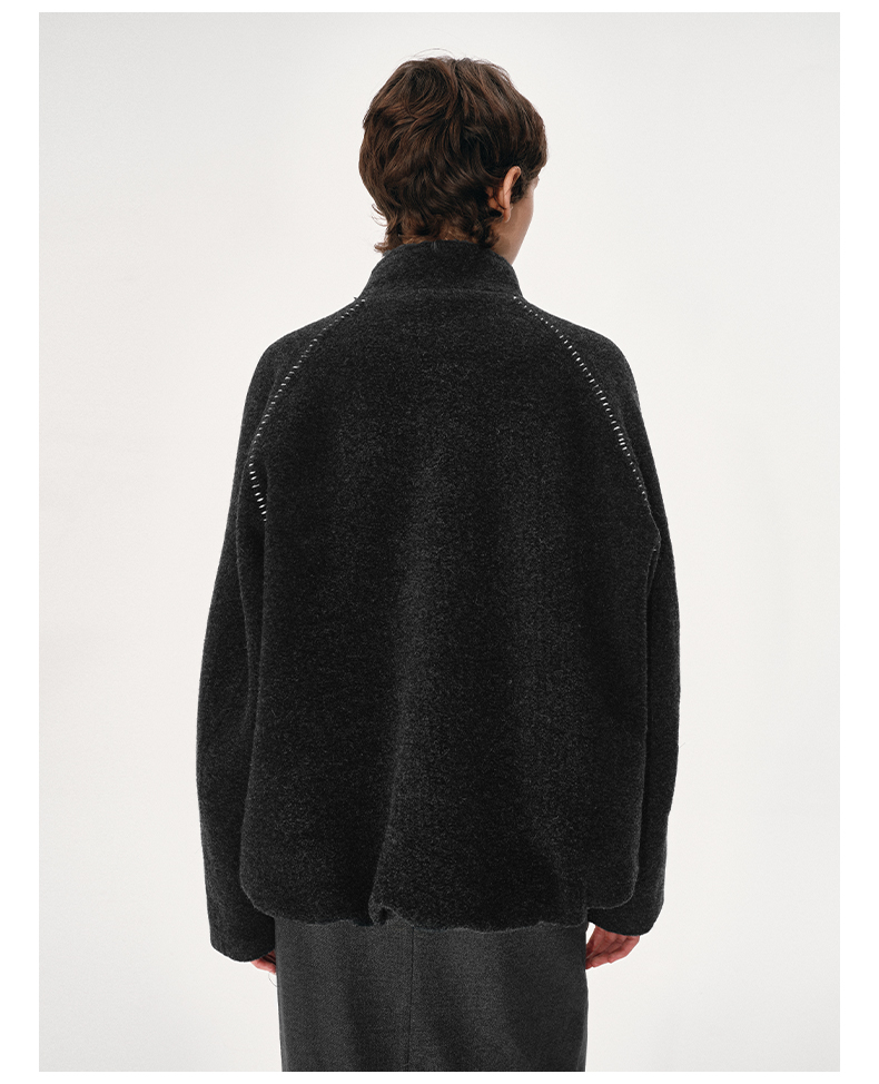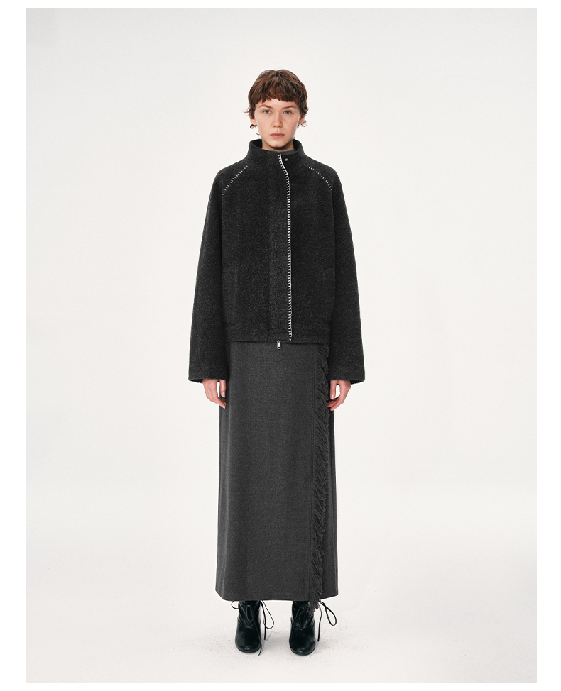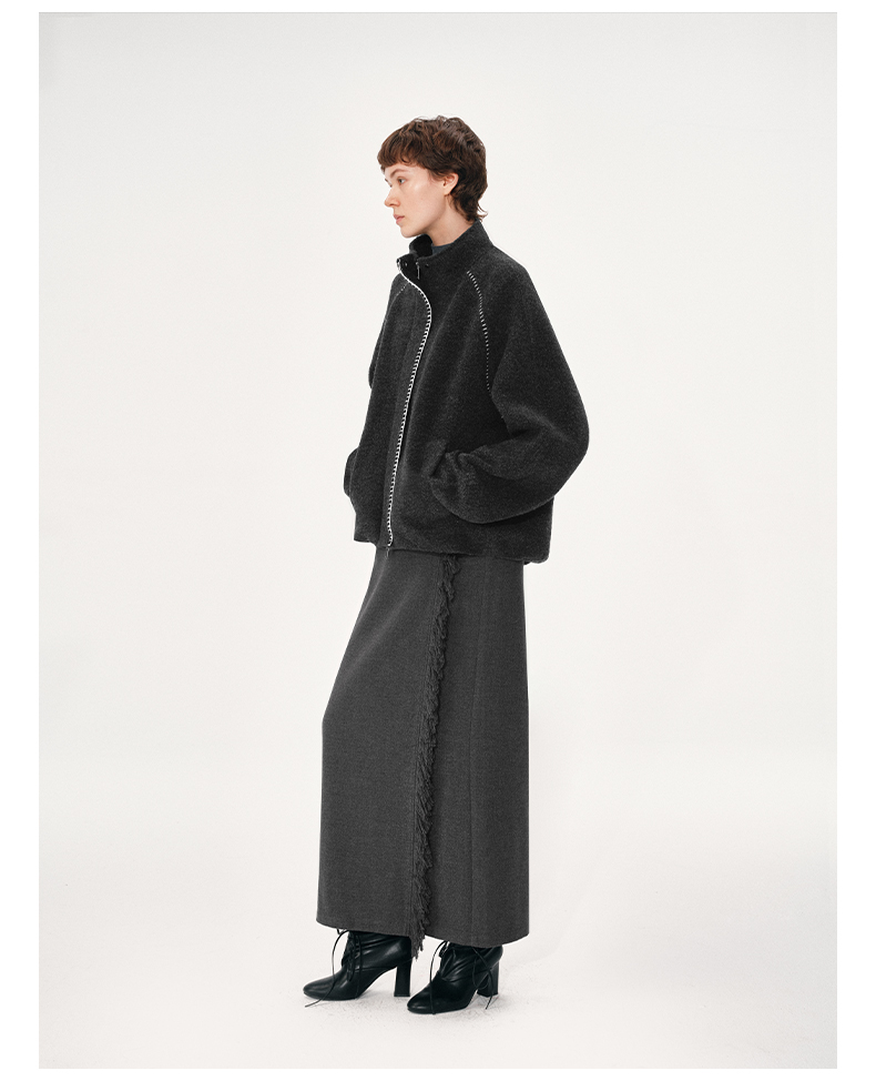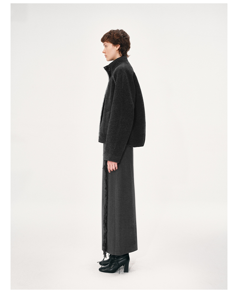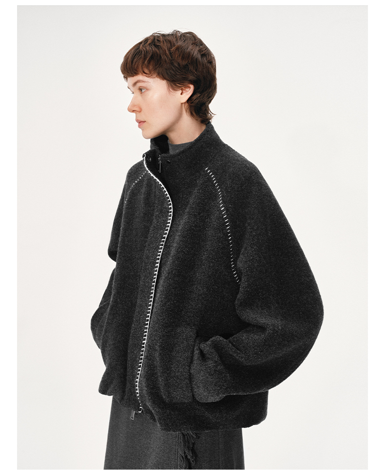 NUTH羊毛混纺撞色编织边宽松廓形毛呢外套女 深灰色(发货时间同步天猫)