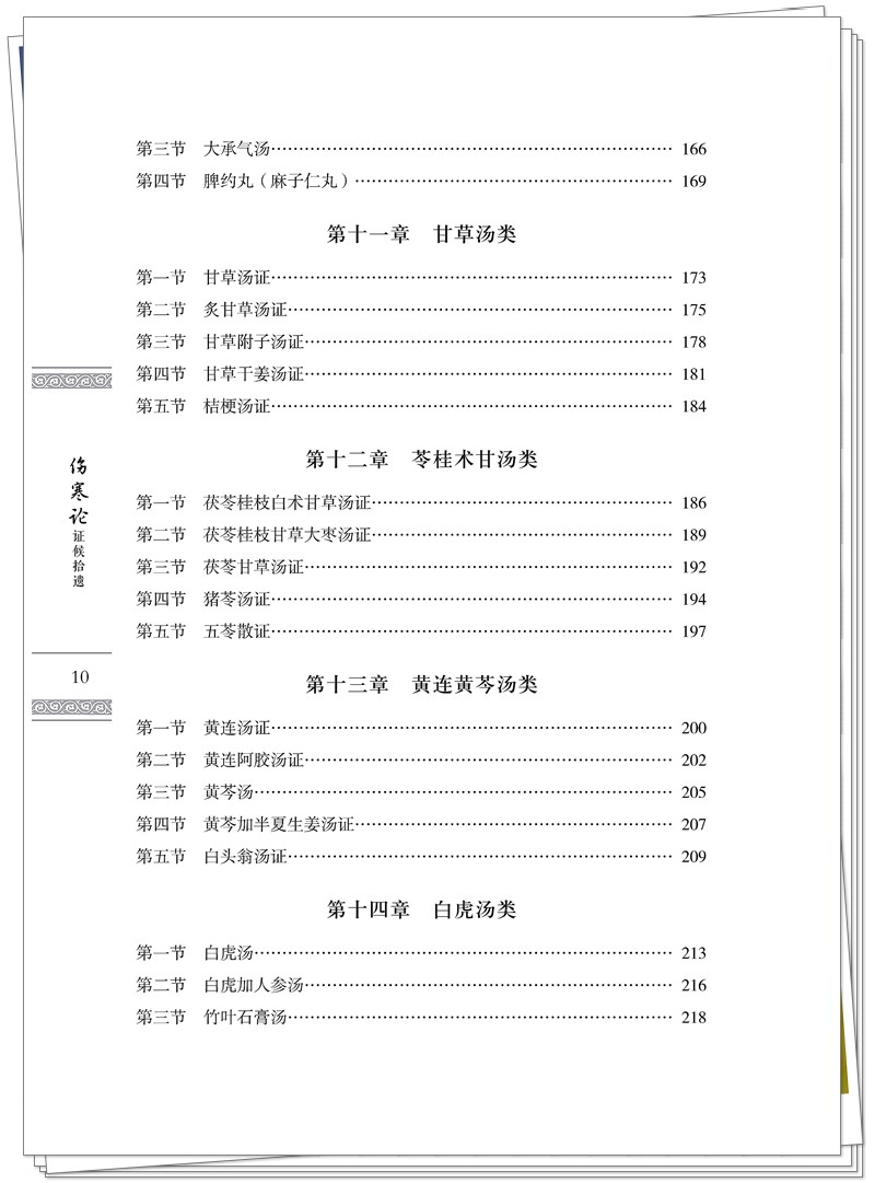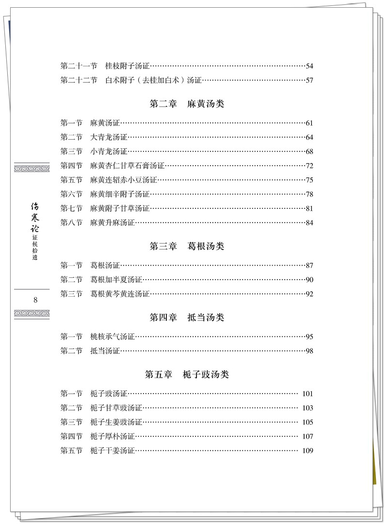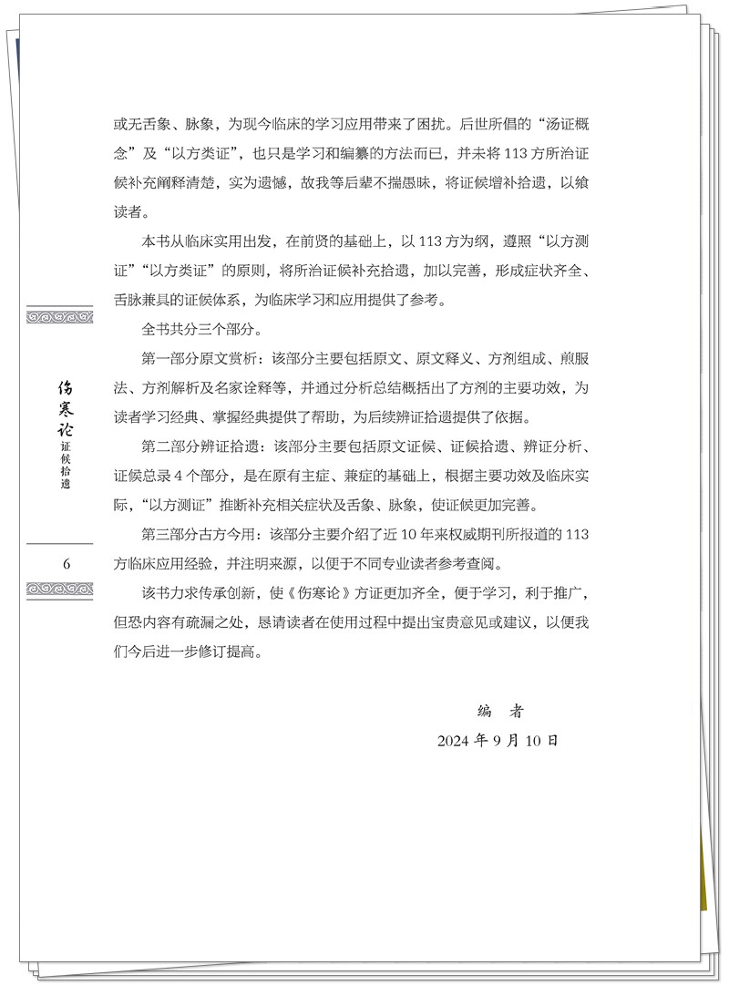 《伤寒论》证候所述大多不全,或以一症概之,或以或然症出现,或无舌象、脉象,为现今临床学习应用带来了困扰。本书从临床实用及需求出发,在前贤的基础上,以113方为纲,遵照“以方测证”“以方类证”的原则,将所治证候补充拾遗,加以完善,形成症状齐全,舌脉兼具的证候体系,为临床学习和应用提供参考。全书分为3个部分。第一部分原文赏析:主要介绍原文、方剂组成、煎服法及名家注释等,并通过分析总结概括出主要功效,为辨证拾遗提供依据。第二部分辨证拾遗:主要是在原有主症、兼症的基础上,根据主要功效,“以方测证”推断补充相关症状及舌象、脉象,使证候更加完善。第三部分古方今用:主要介绍113方在近十年的临床应用经验,并注明来源,便于读者查阅。