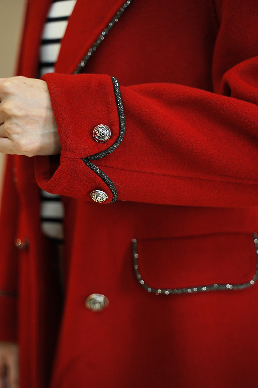 袖口以及口袋盖周围同样做了亮丝织带贴边的处理,