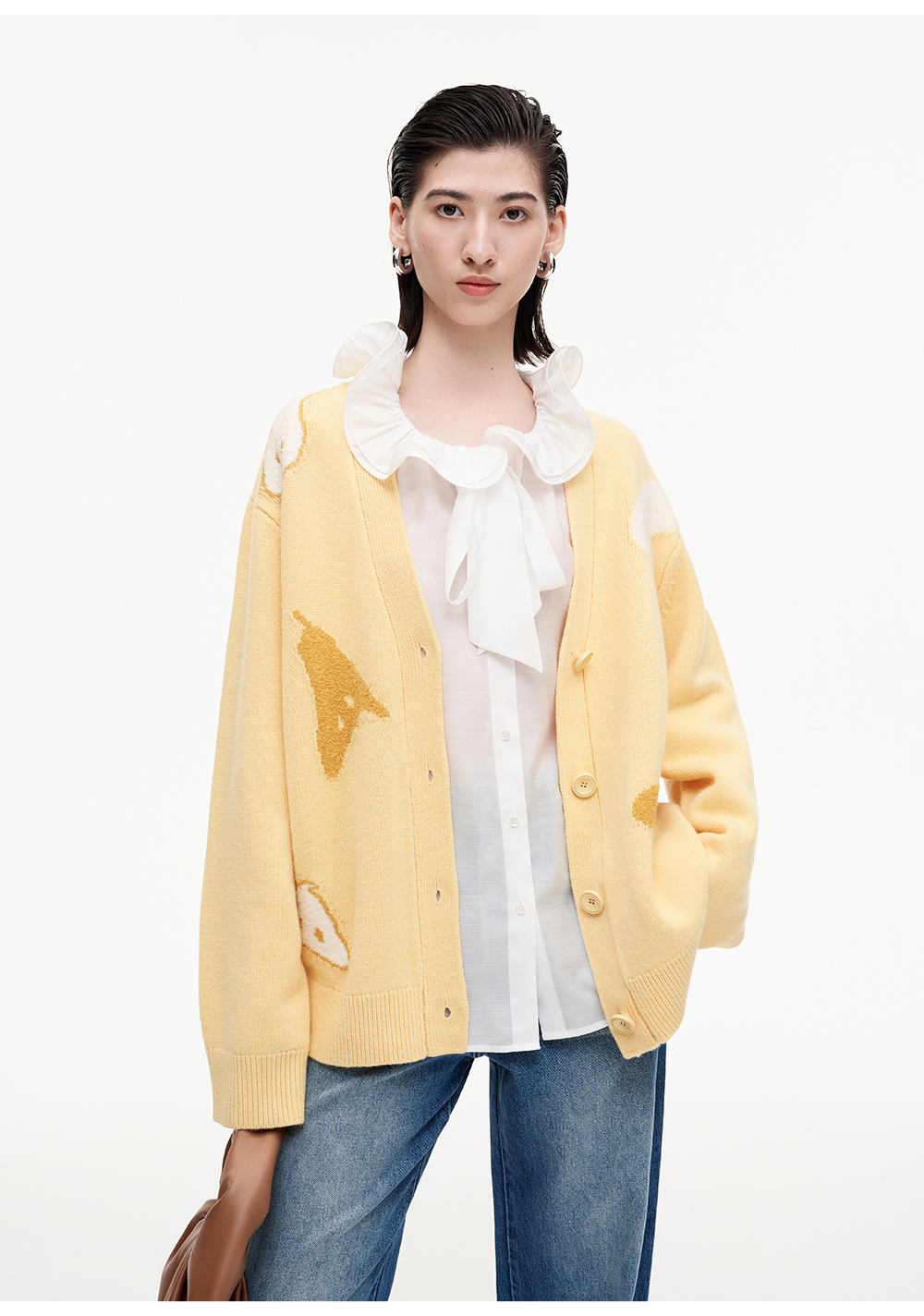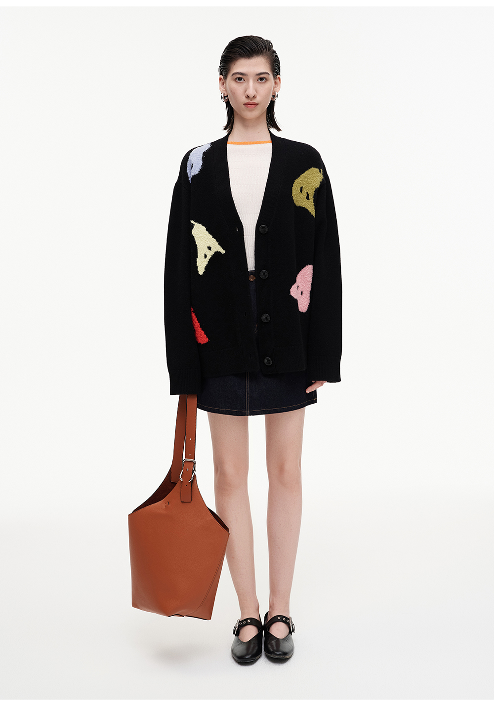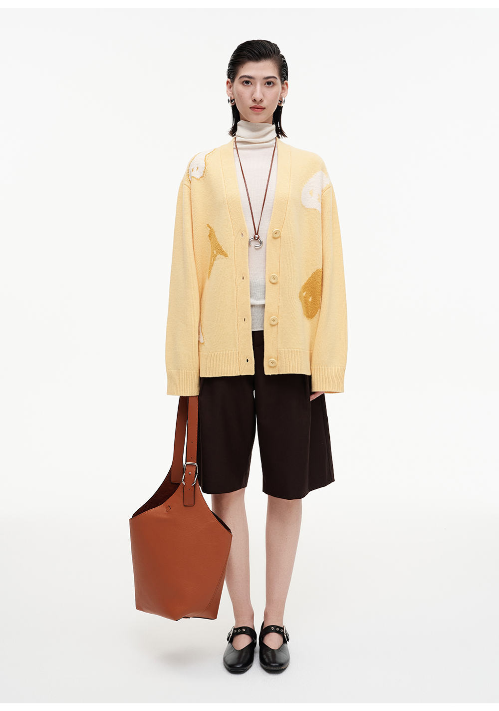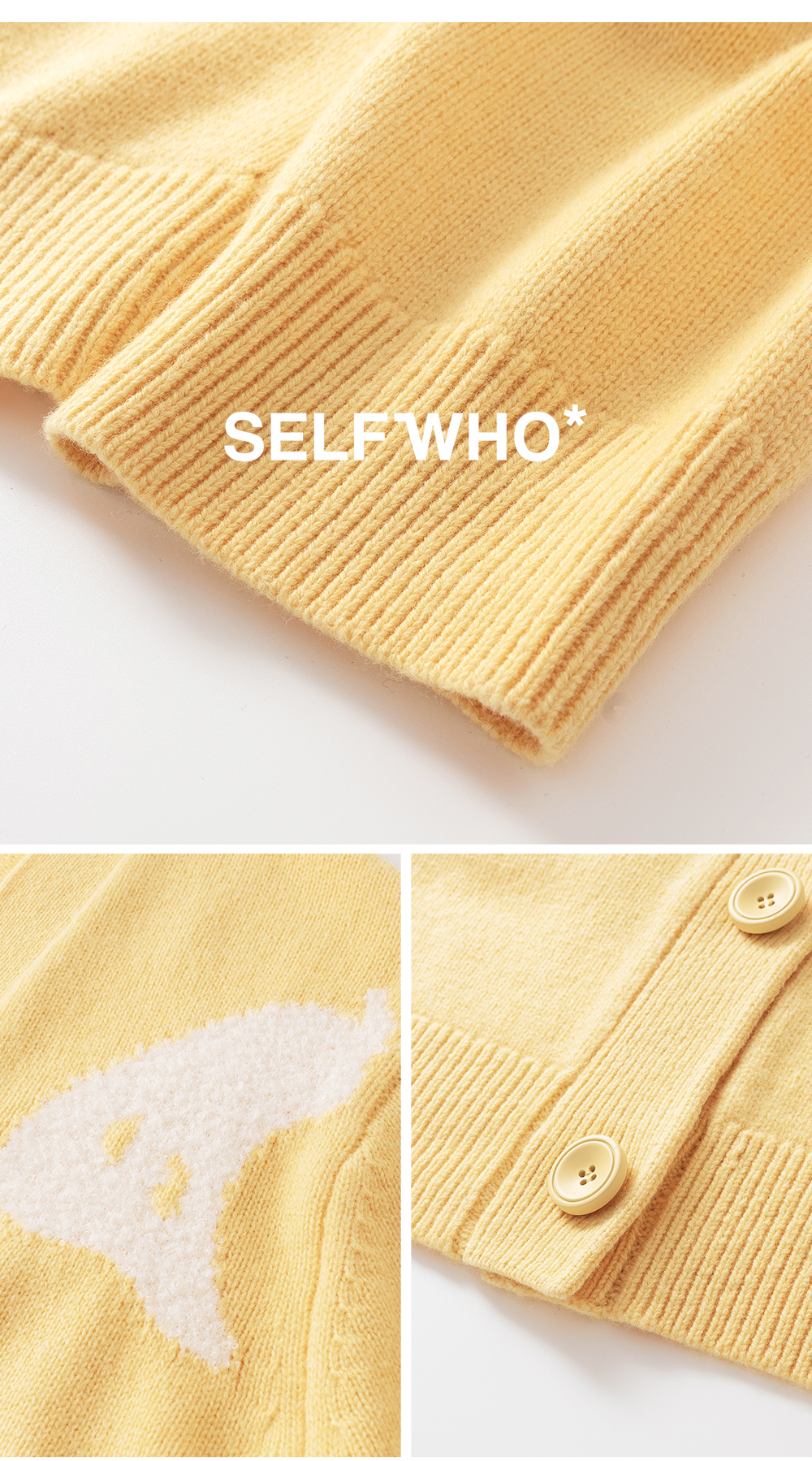 SELFWHO羊毛混纺梨子花型针织开衫女2025秋季新款V领保暖毛衣外套