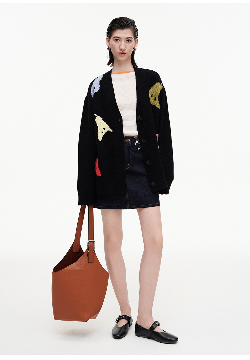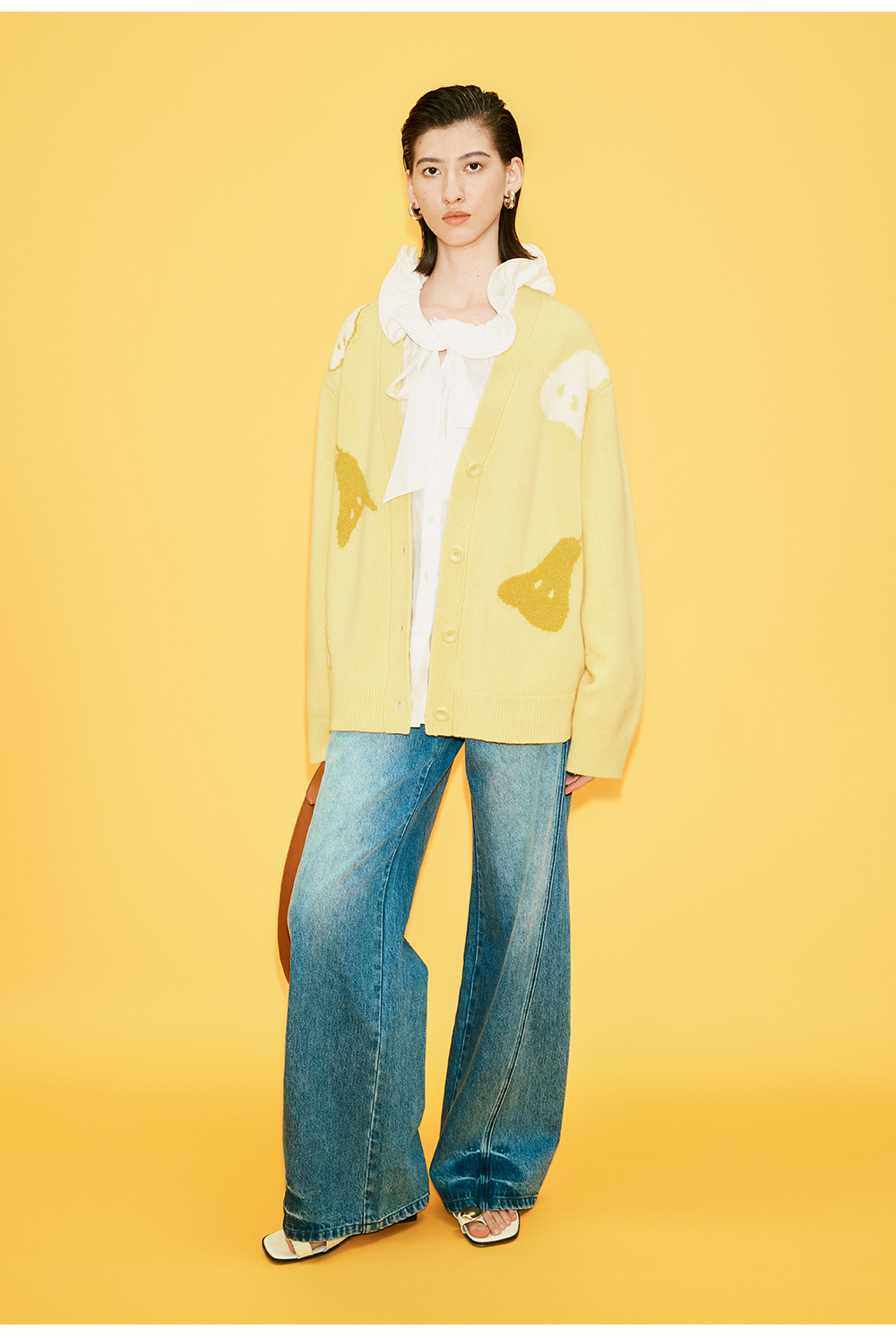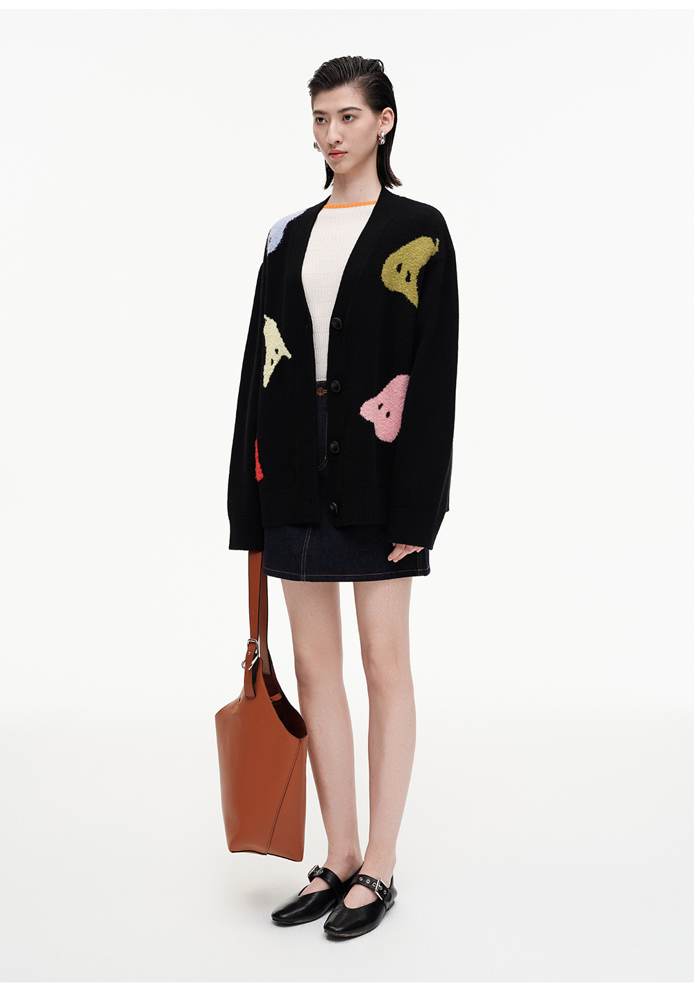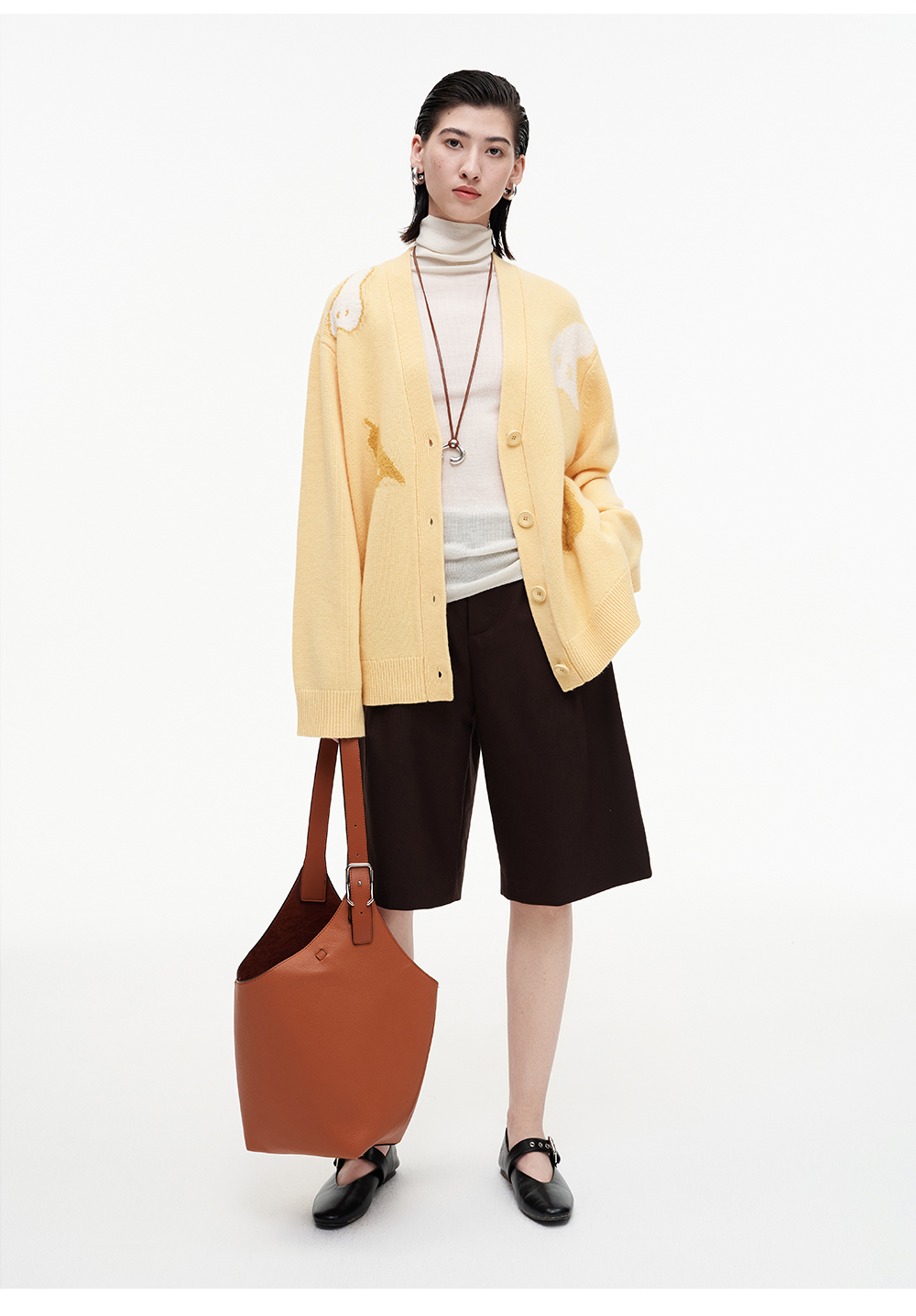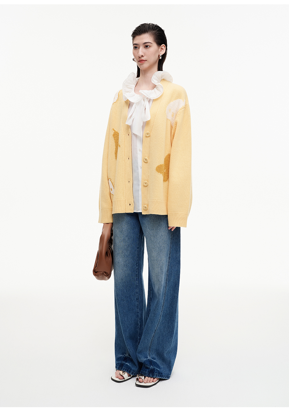 SELFWHO羊毛混纺梨子花型针织开衫女2025秋季新款V领保暖毛衣外套