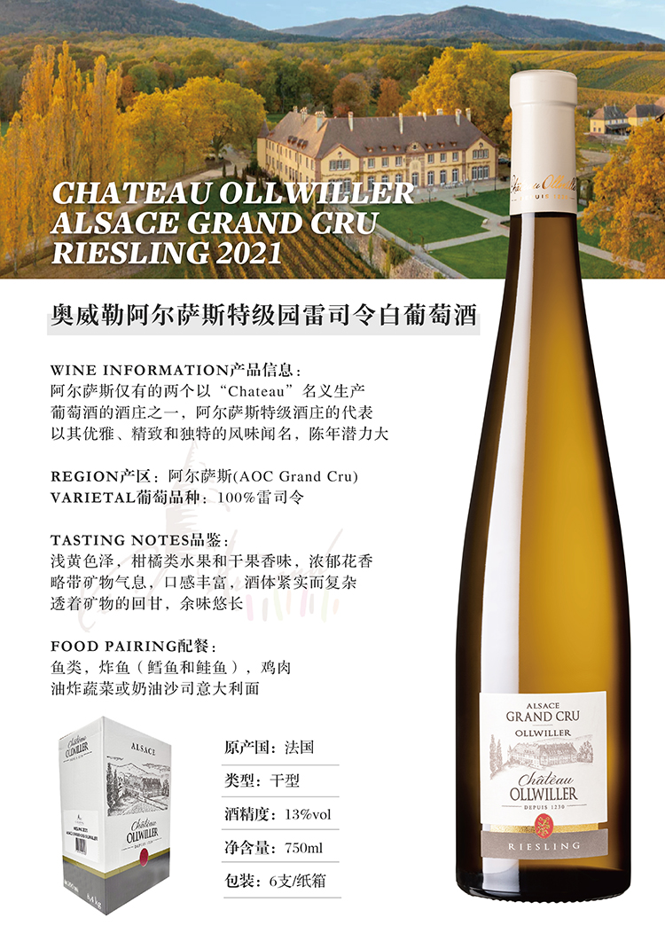 奥威勒阿尔萨斯特级园雷司令白葡萄酒750ml*6瓶