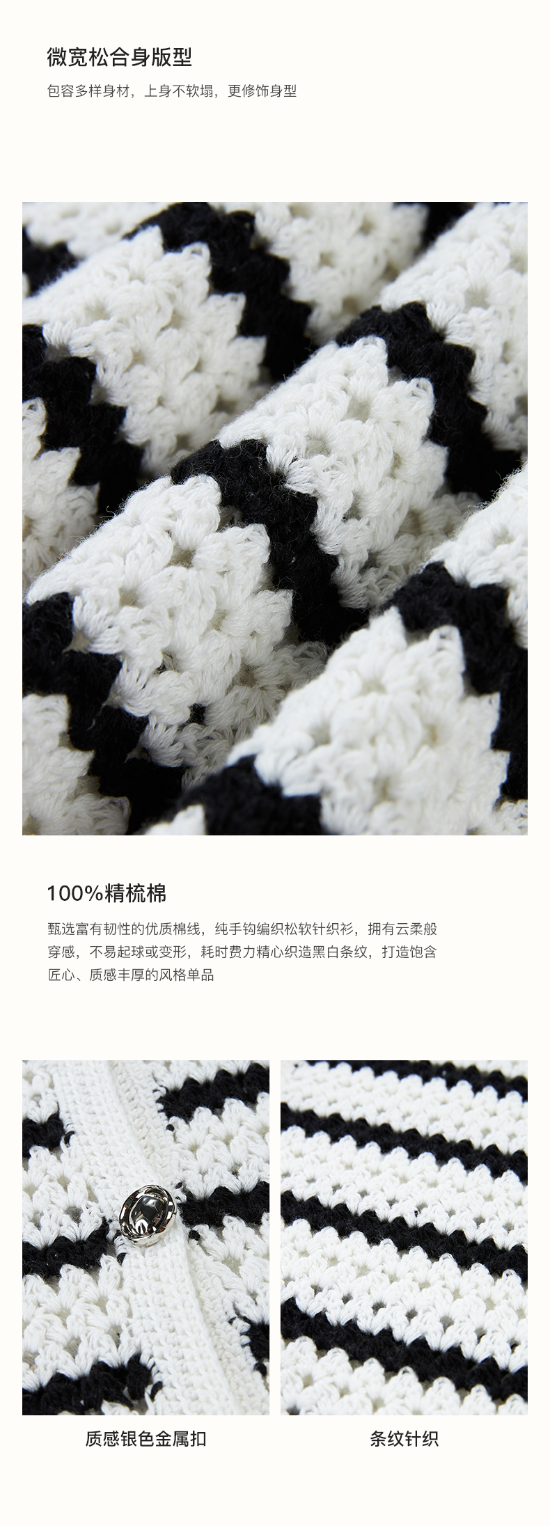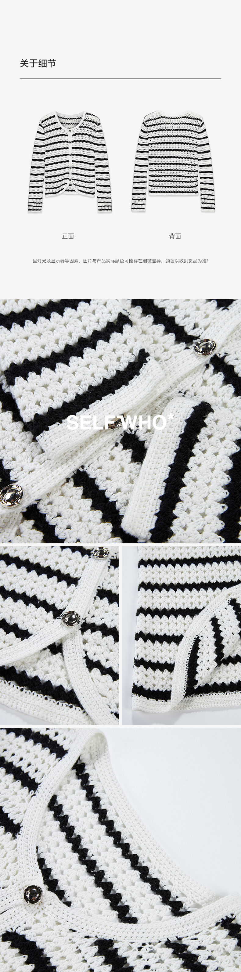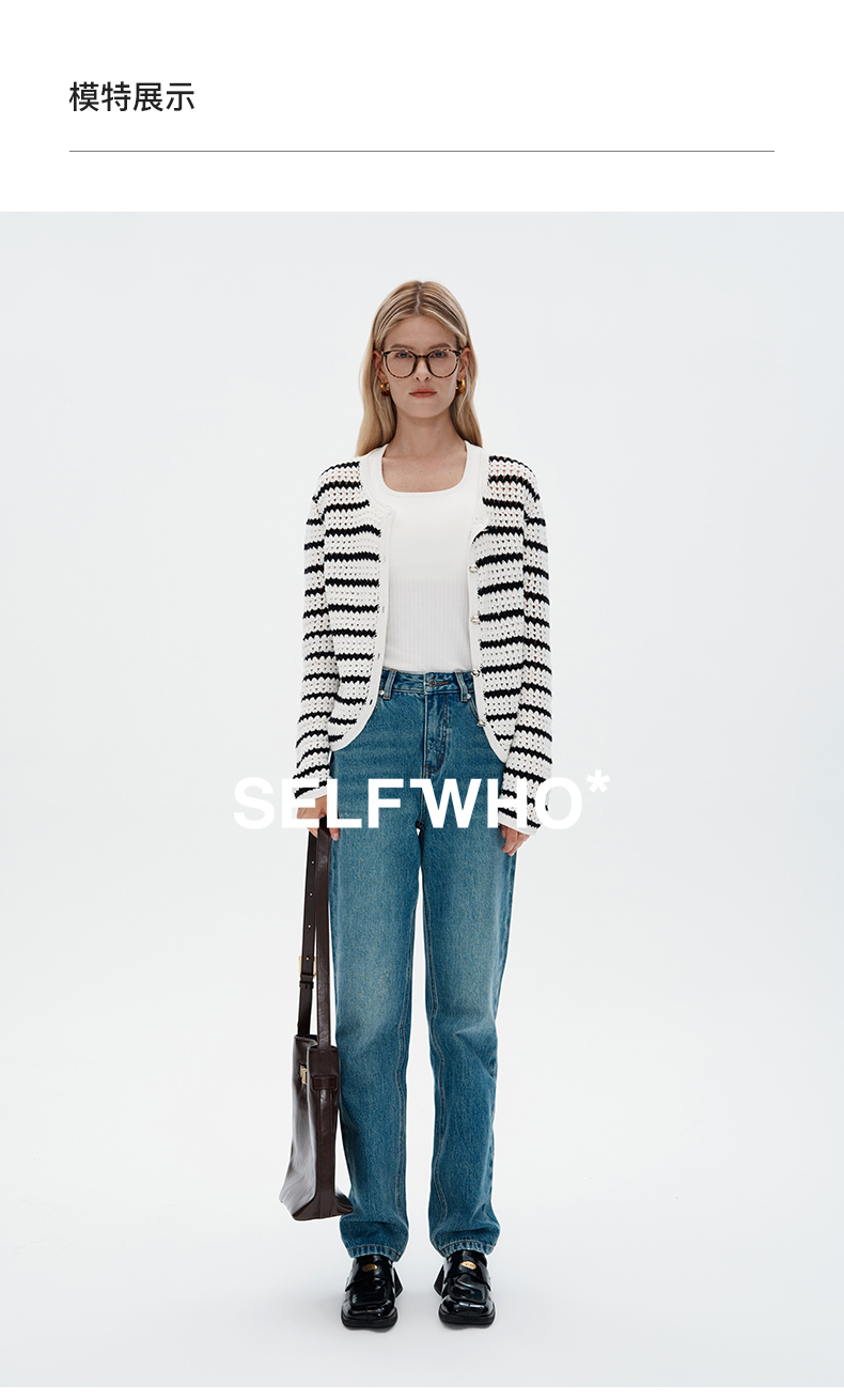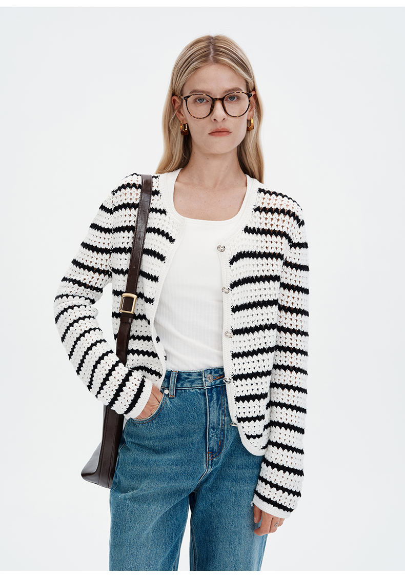 SELFWHO纯手工纯棉黑白条纹针织开衫女秋季2024新款法式慵懒上衣