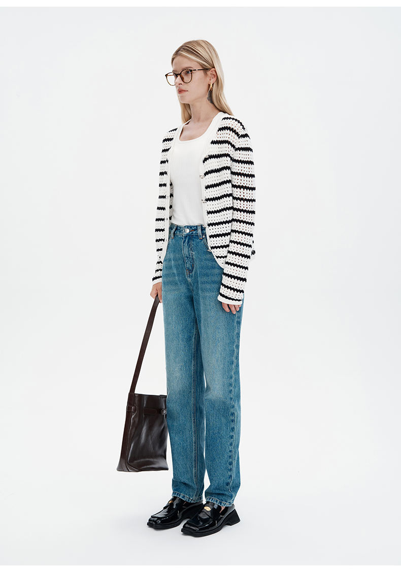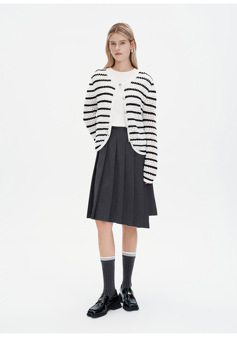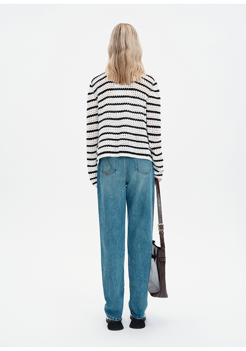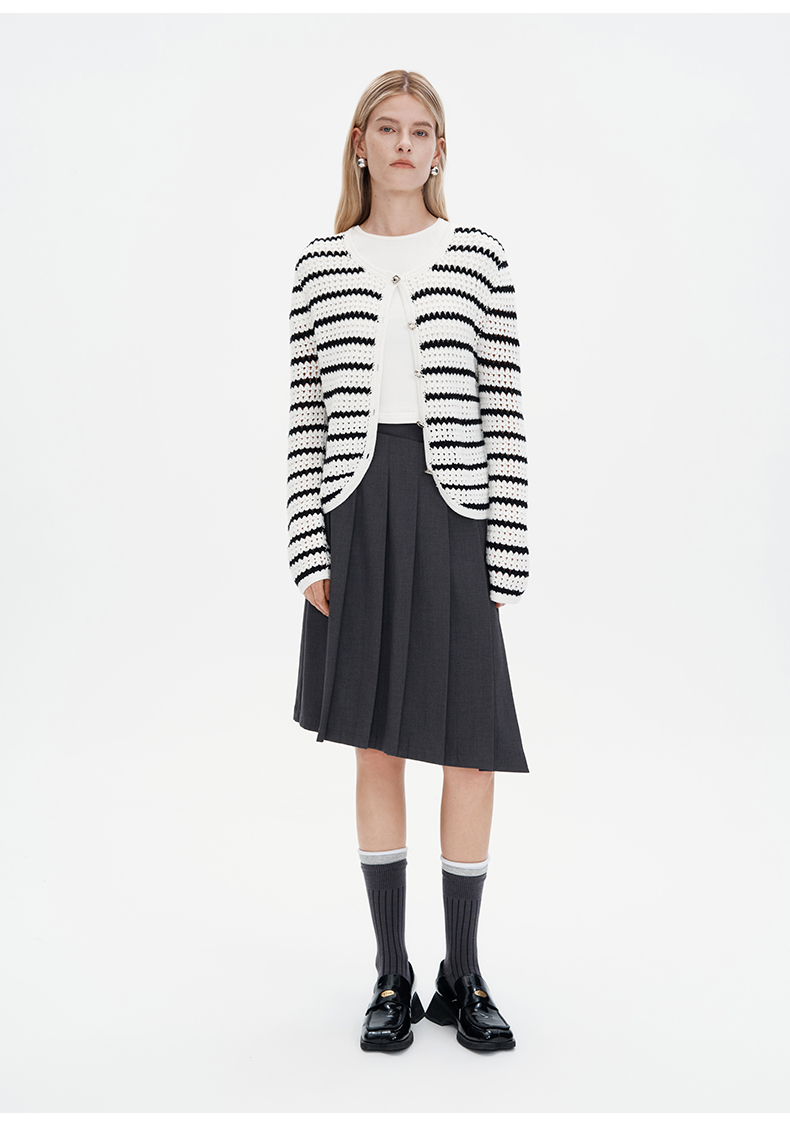 SELFWHO纯手工纯棉黑白条纹针织开衫女秋季2024新款法式慵懒上衣