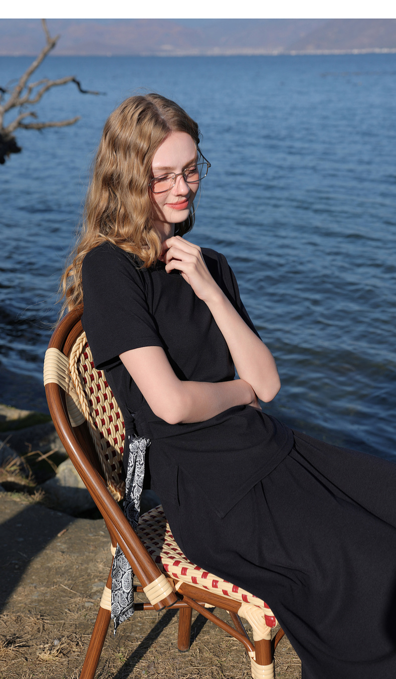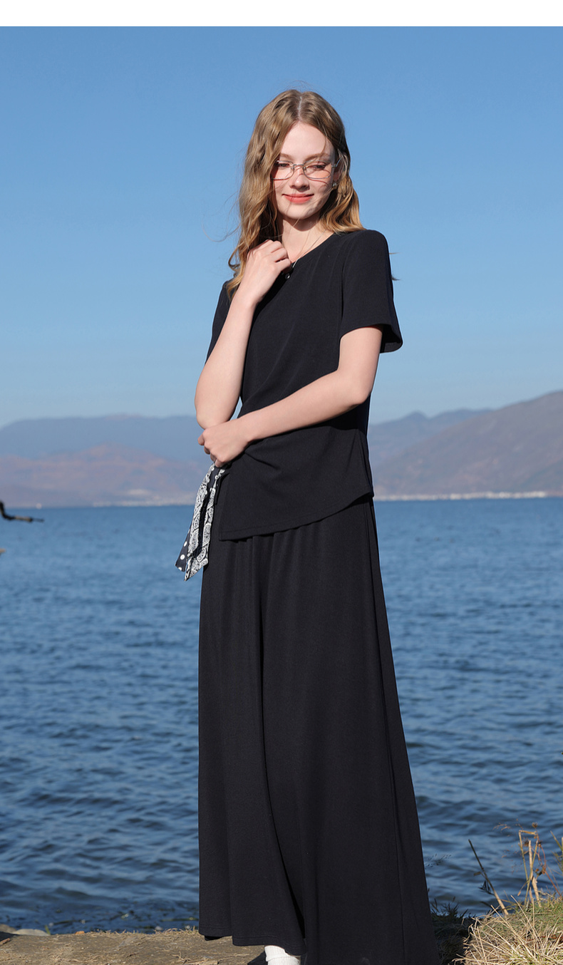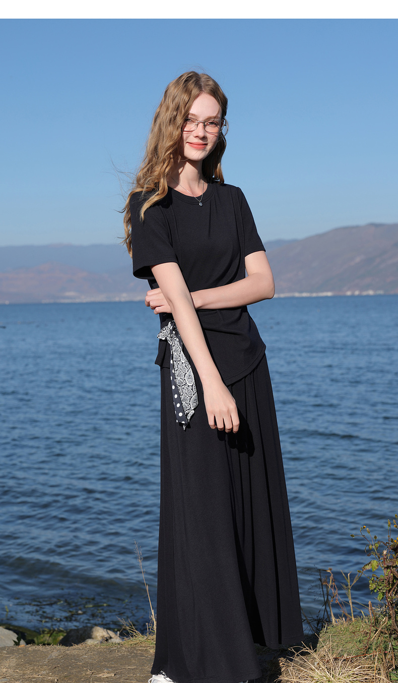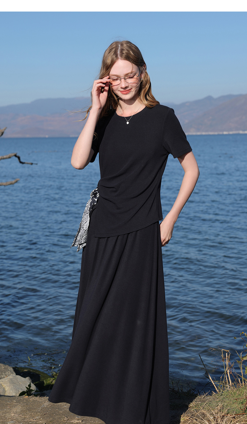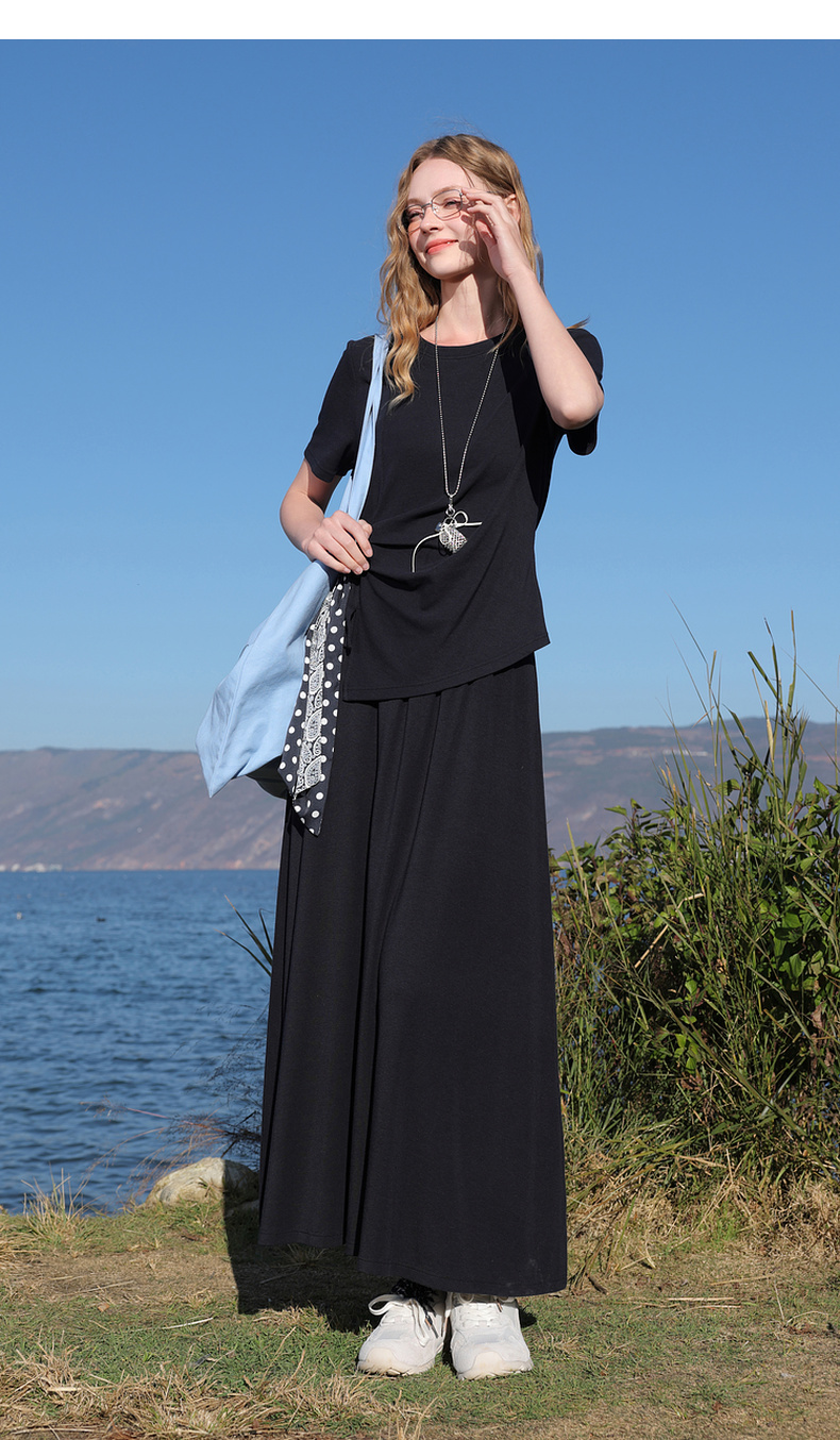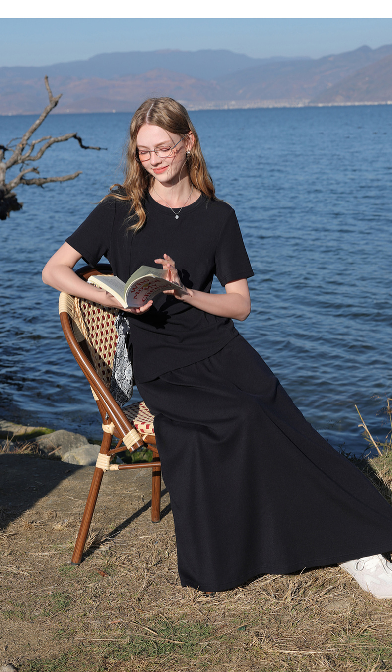 三彩2026春季新款慵懒T恤套装套头衫上衣半身裙长裙两件套M