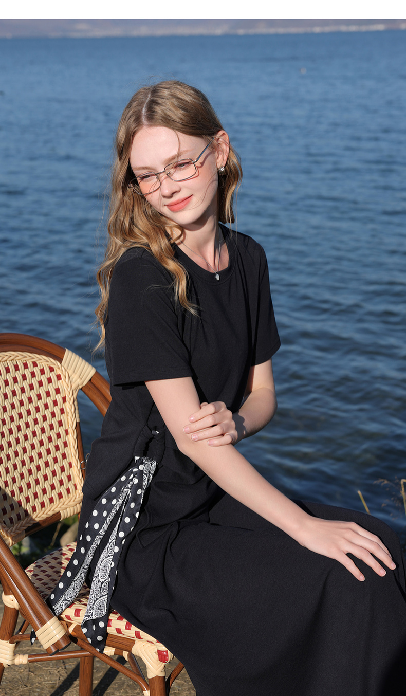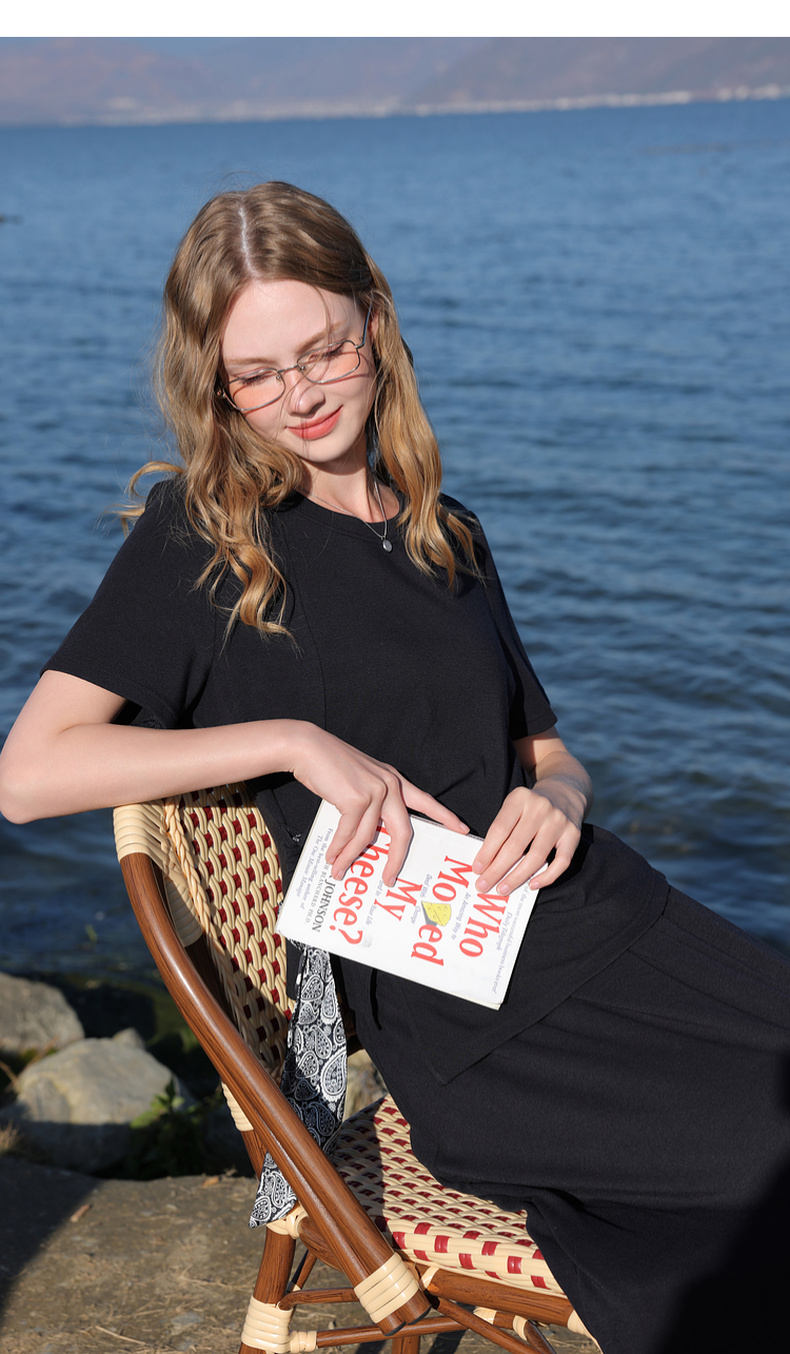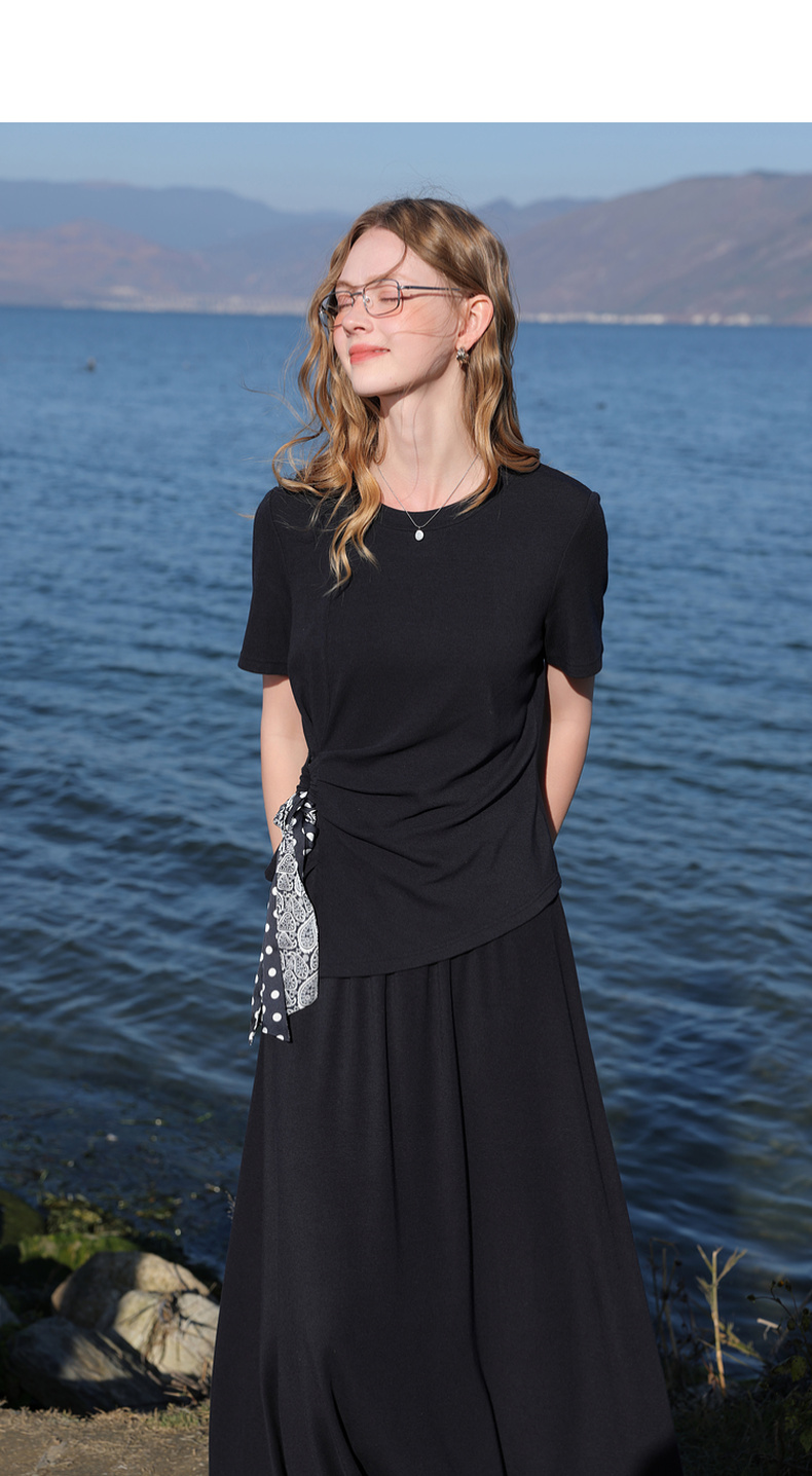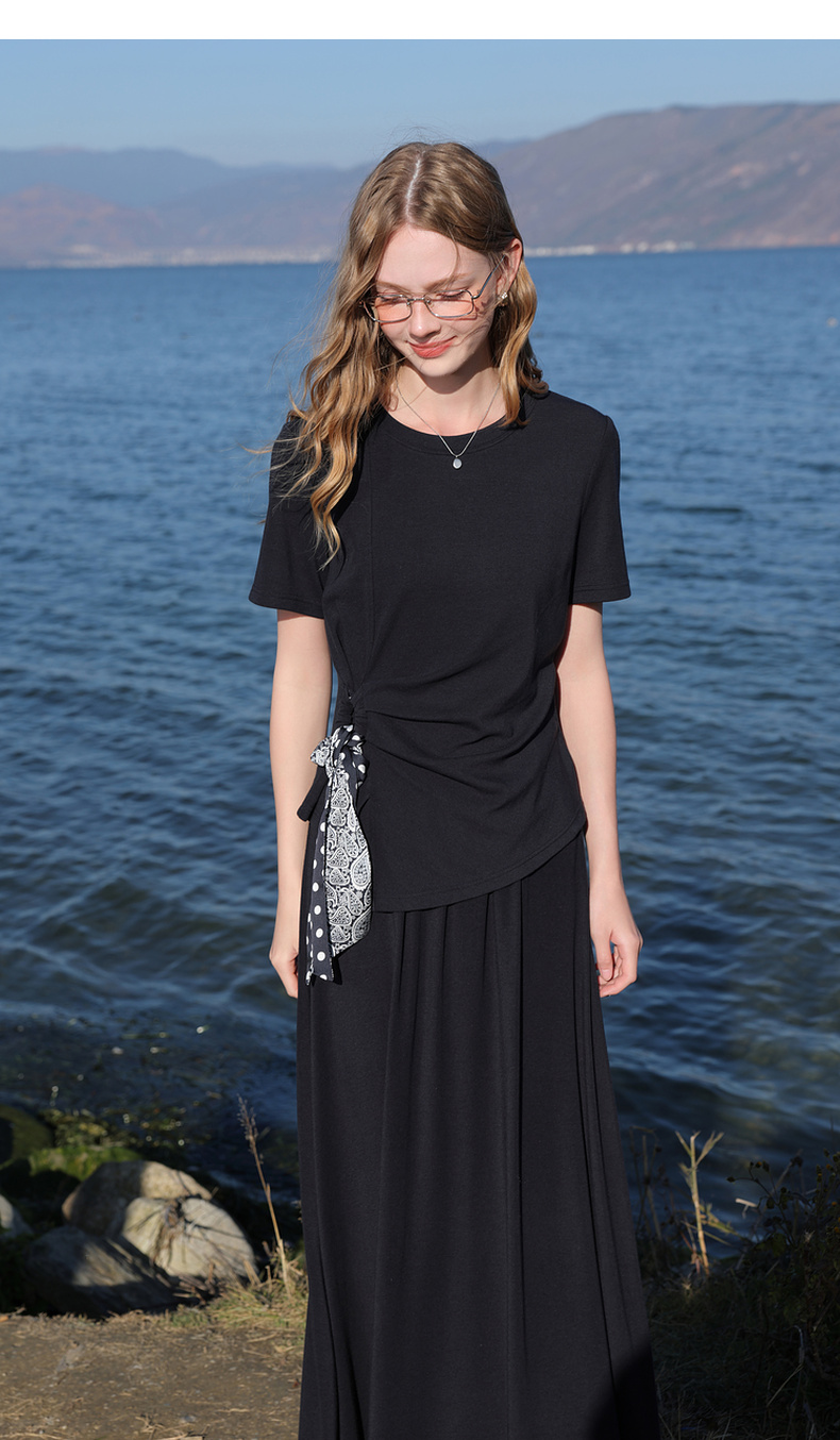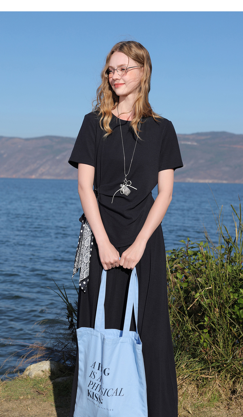 三彩2026春季新款慵懒T恤套装套头衫上衣半身裙长裙两件套M