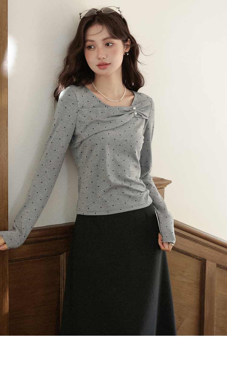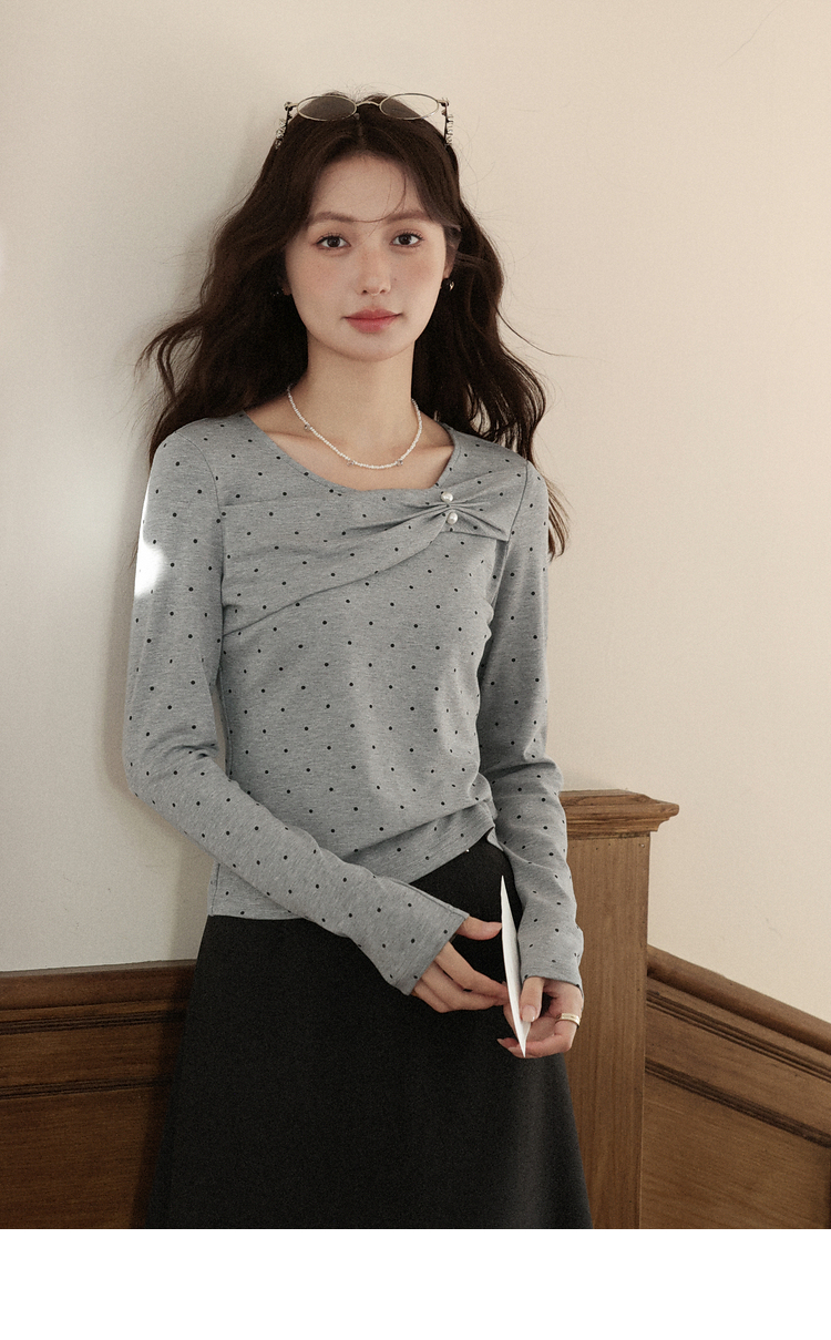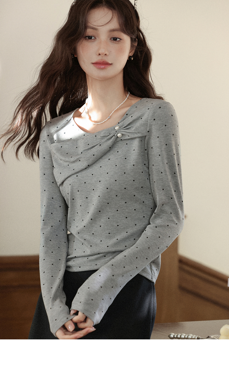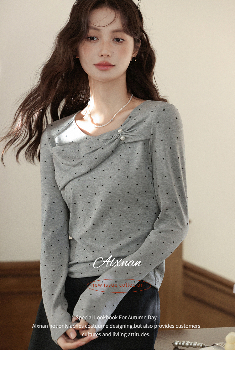 鹿向南「霜糖软云」波点灰色长袖T恤女早秋新款高级法式洋气上衣