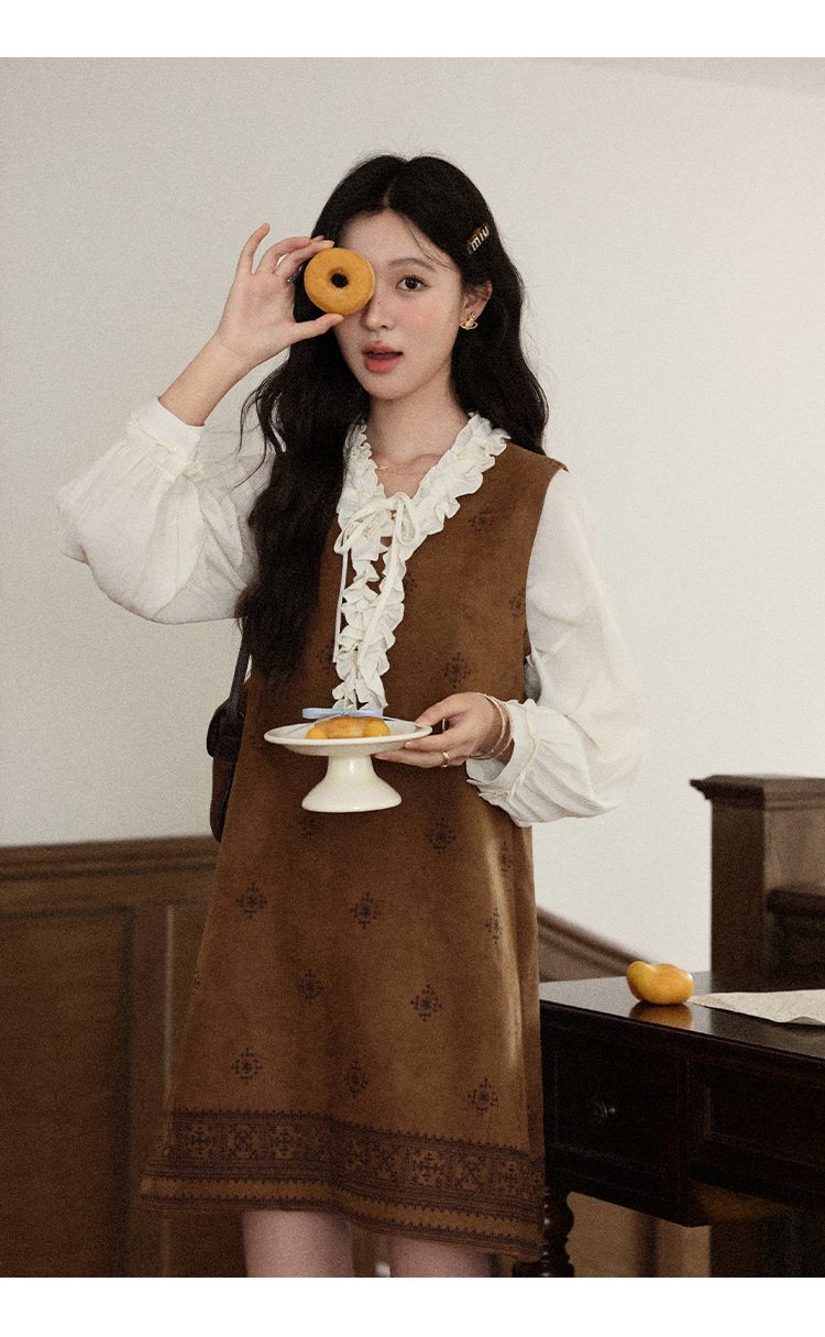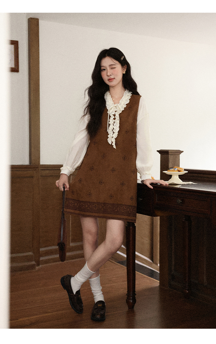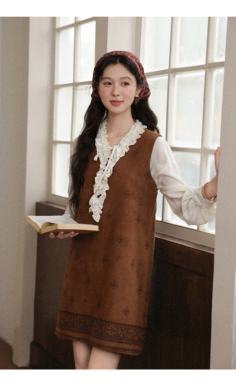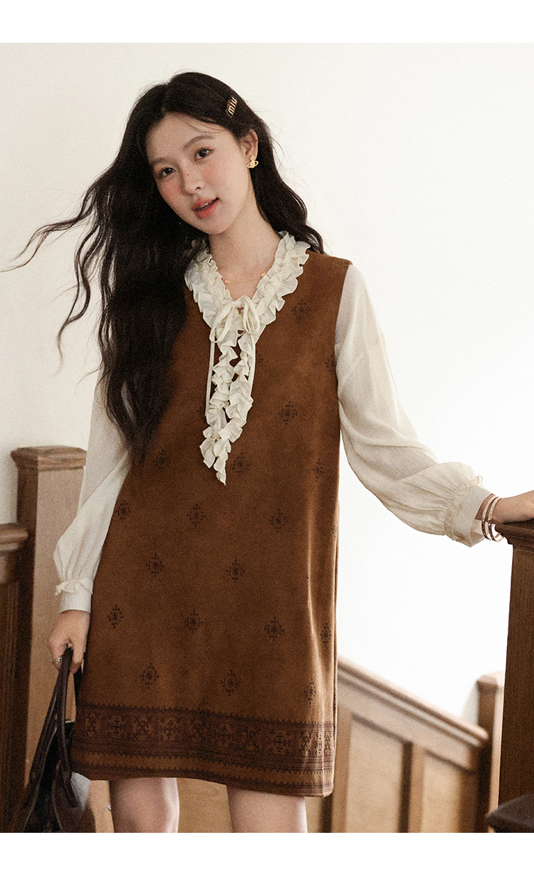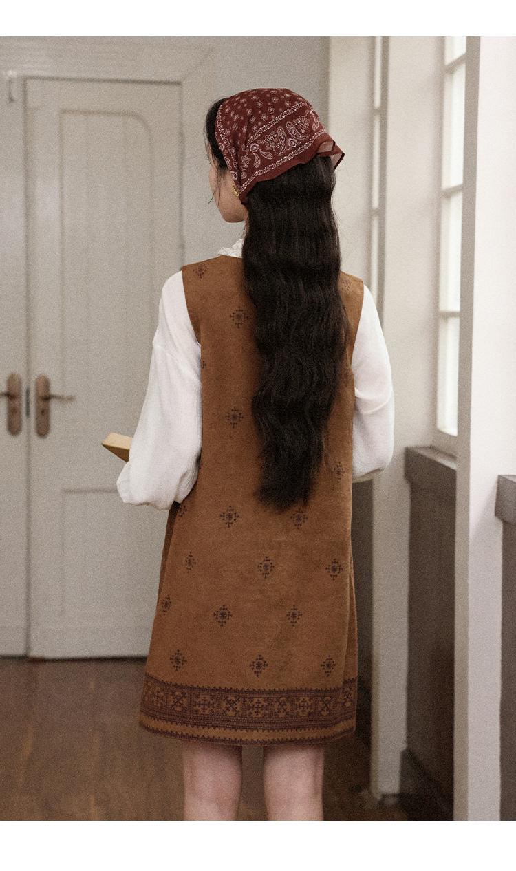 鹿向南「文艺庄园」波西米亚风连衣裙女秋新款无袖短款咖色背心裙