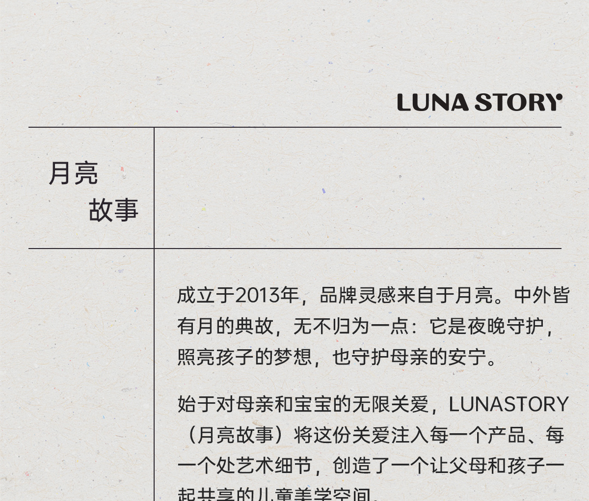 Lunastory是2017年全新推出的母婴用品高端品牌,致力于维护孩子的安全与健康。以父母之心,开发多种母婴用品,目标是让客户只用Lunastory就能打造出温馨的儿童房。