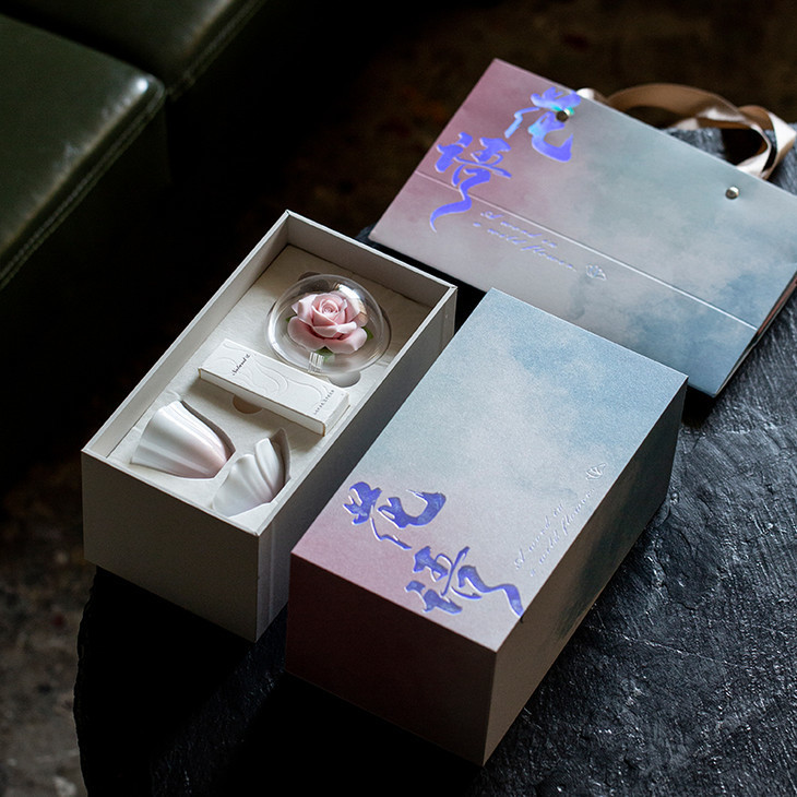 每一款礼盒都包含一套主人杯碟、一朵永生瓷玫瑰和一瓶香薰精油。