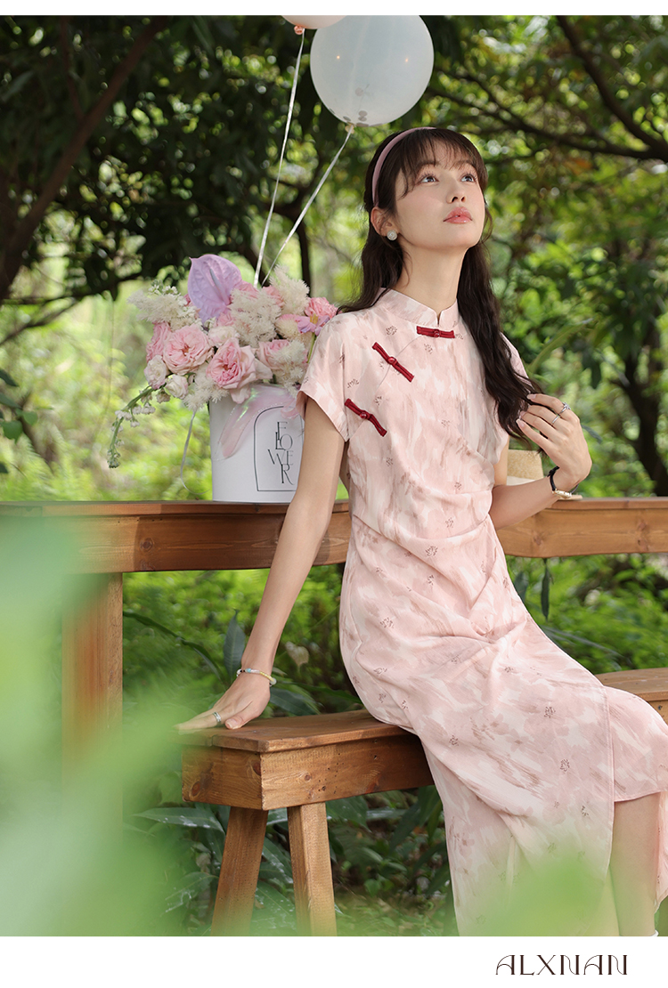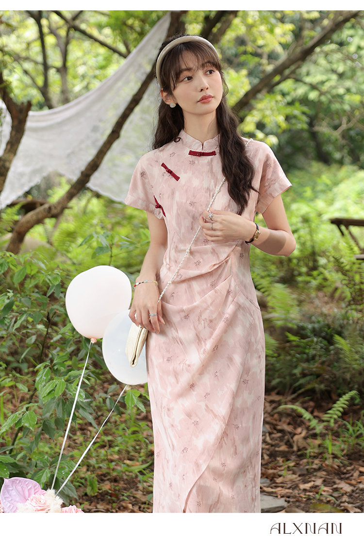 【65折秒杀】鹿向南《叶语风吟》新中式粉色连衣裙女夏新款收腰开叉长裙LXN29982