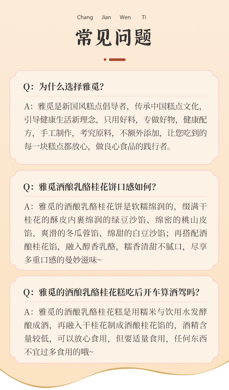 【品牌】:雅觅 【品名】:雅觅酒酿乳酪桂花糕 【规格】:320g(40g*8枚) 【产地】:河北邯郸 【生产日期】:现做现发 【保质期】:60天 【发货地】:河北邯郸 【发货时间】:72小时 【发货物流】:中通/邮政/京东/顺丰随机发 【不发货地区】:新疆,西藏,青海,海南,云南、港澳台以及快递物流异常网点 【售后时间】:24小时内 【售后规则】: 1.请当面验收快递,如发现快递严重破损,请勿签收;若不影响食用,可签收后24小时内拍照(运单号、内容物)反馈客服赔付相应损失。 2.出单号之后不支持拦截、修改地址 3.如因个人原因造成的延误,损坏、变质等问题,不在售后范围. 4. 个人口味喜好问题,不在售后范围内。 5.团购产品,非产品质量问题,不接受7天无理由退换,质量问题24小时内反馈!敬请谅解!