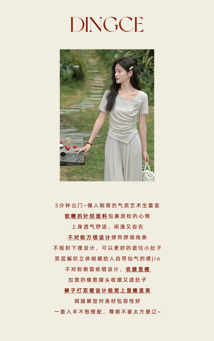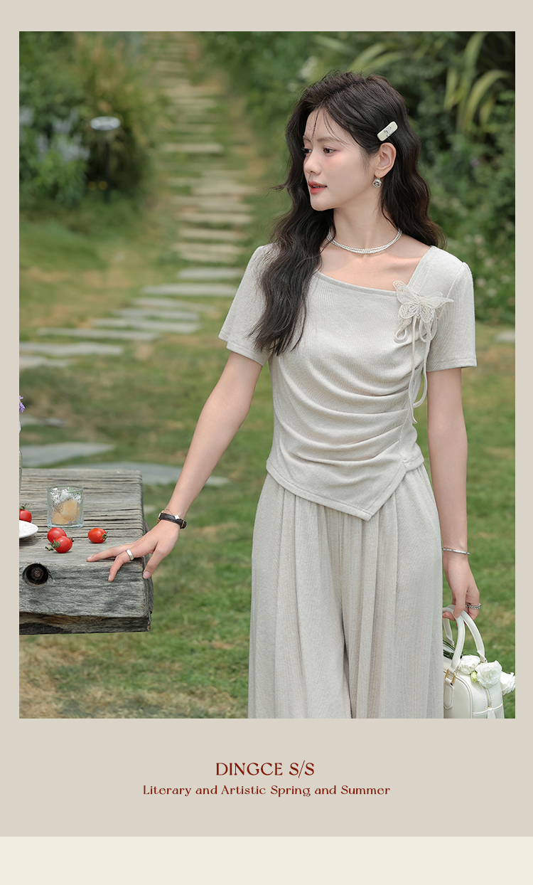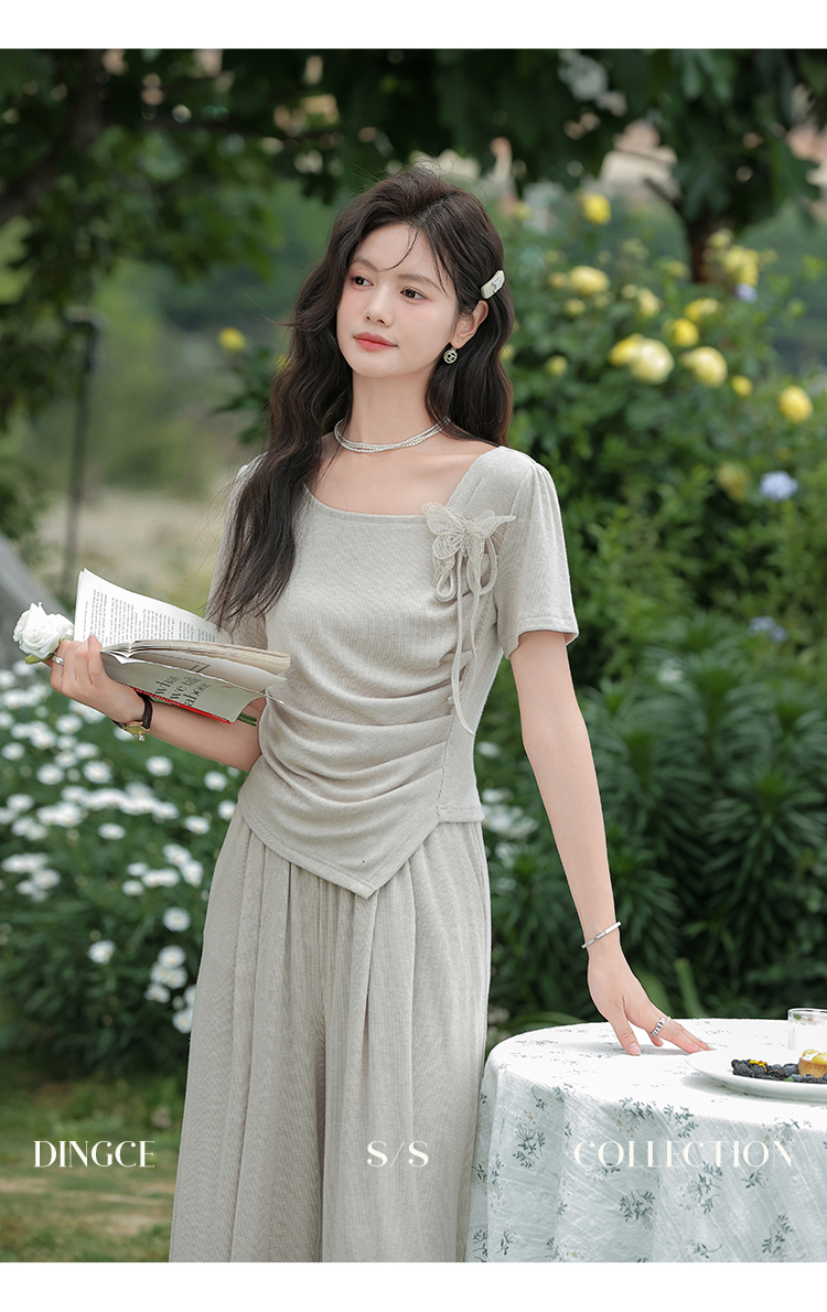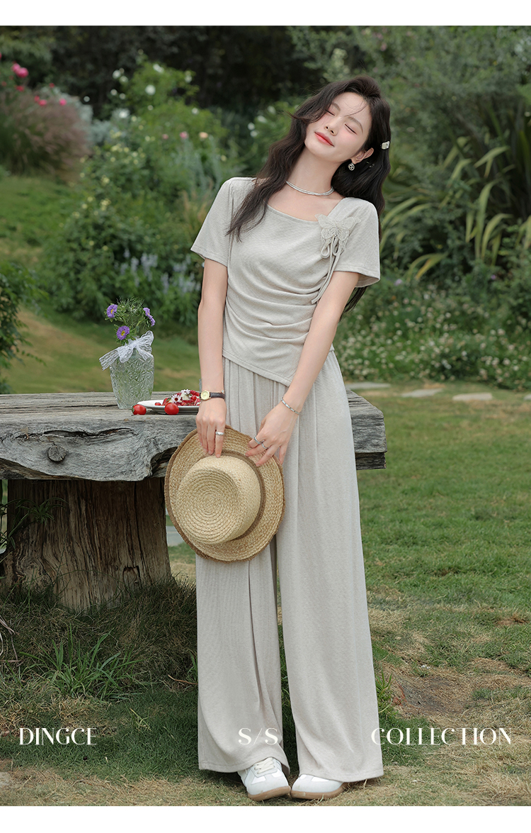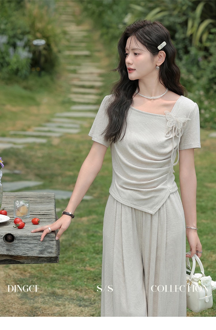 鹿向南 小个子「灰夜迷迭」法式不规则T恤套装夏季上衣休闲裤两件套