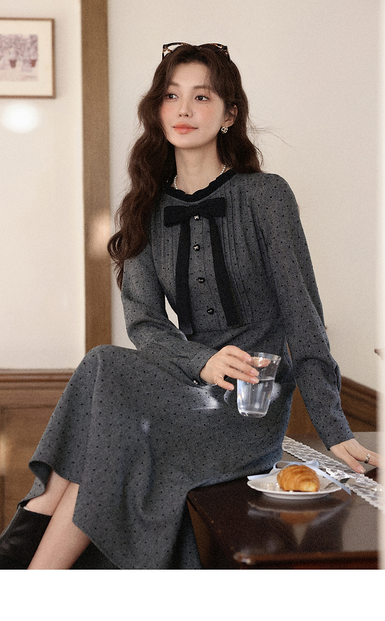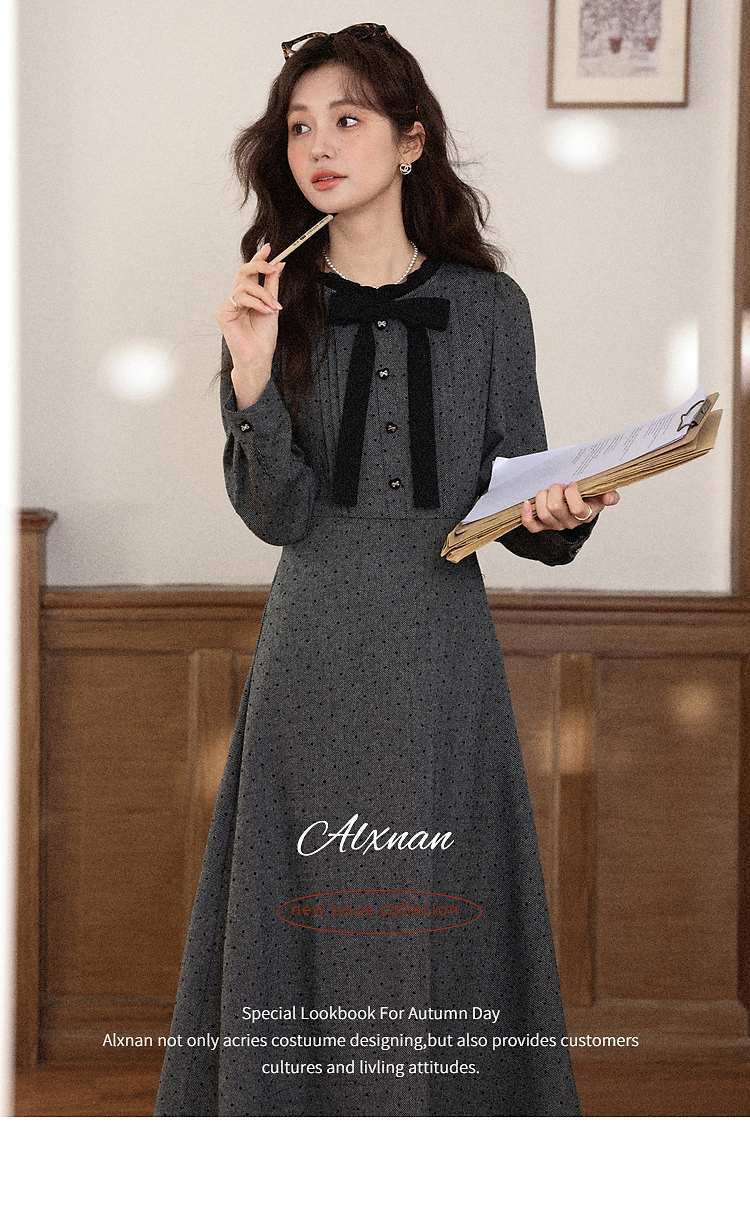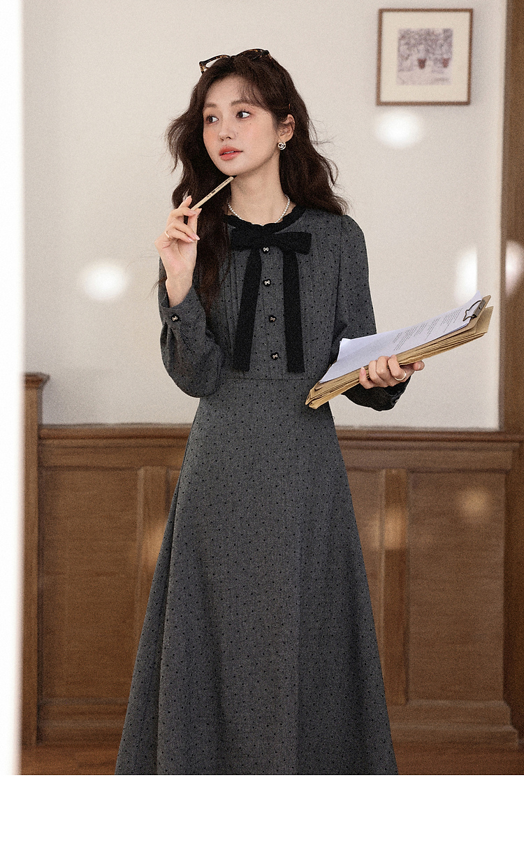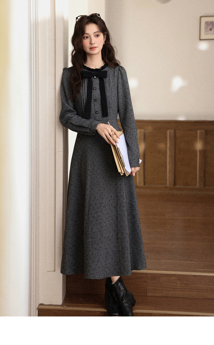 鹿向南「冬雾千金」灰色长袖连衣裙秋冬新款氛围感高腰显瘦裙子女