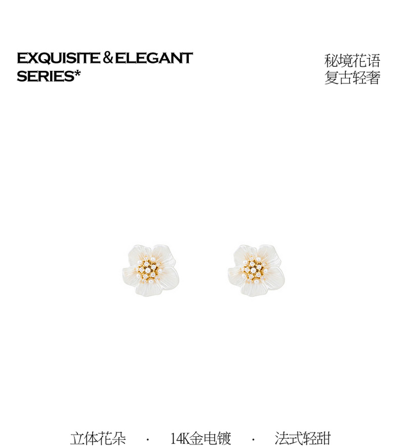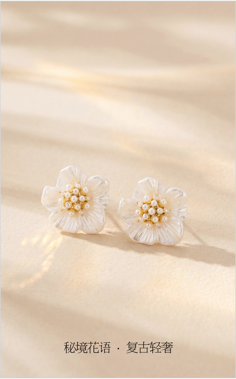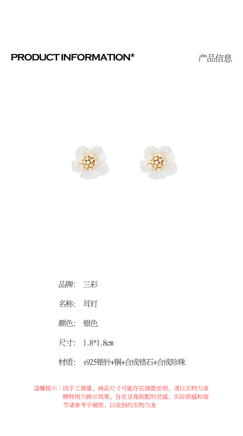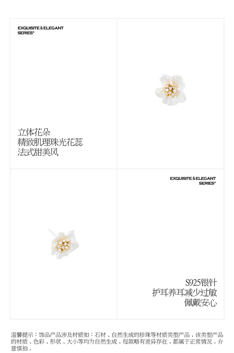 三彩2026新款立体肌理花瓣花朵耳钉S925银针法式复古轻奢珍珠