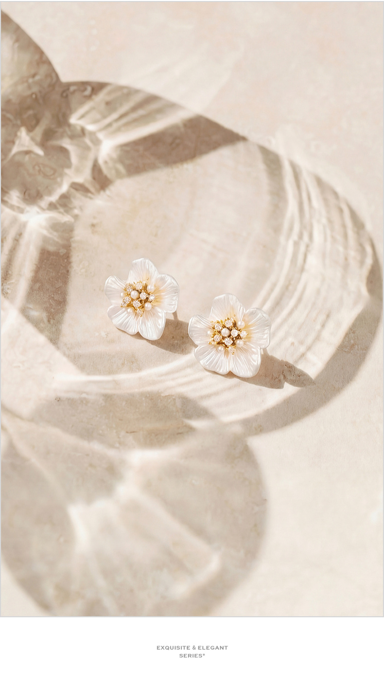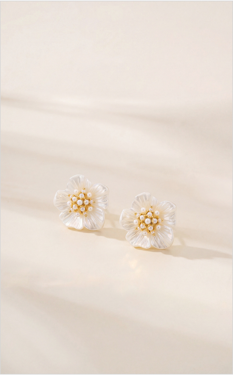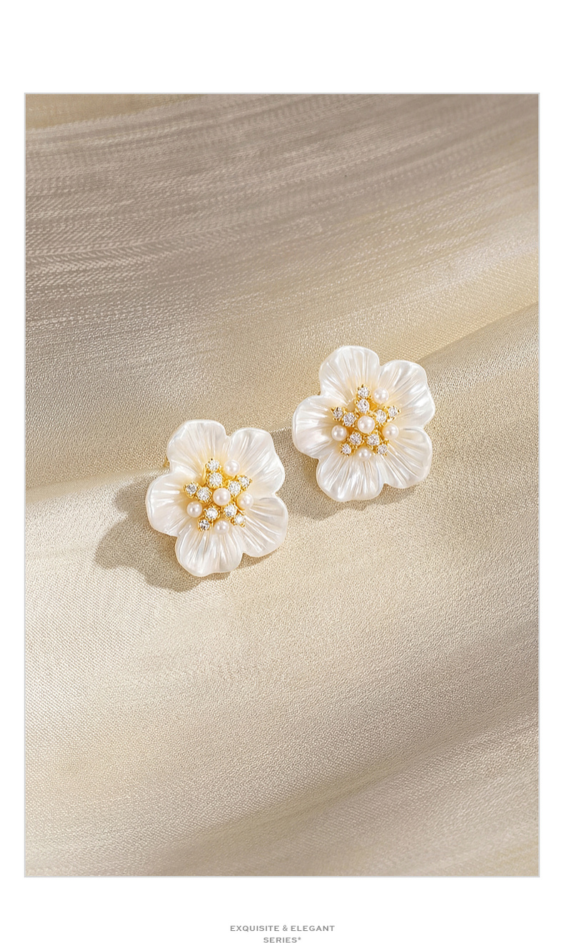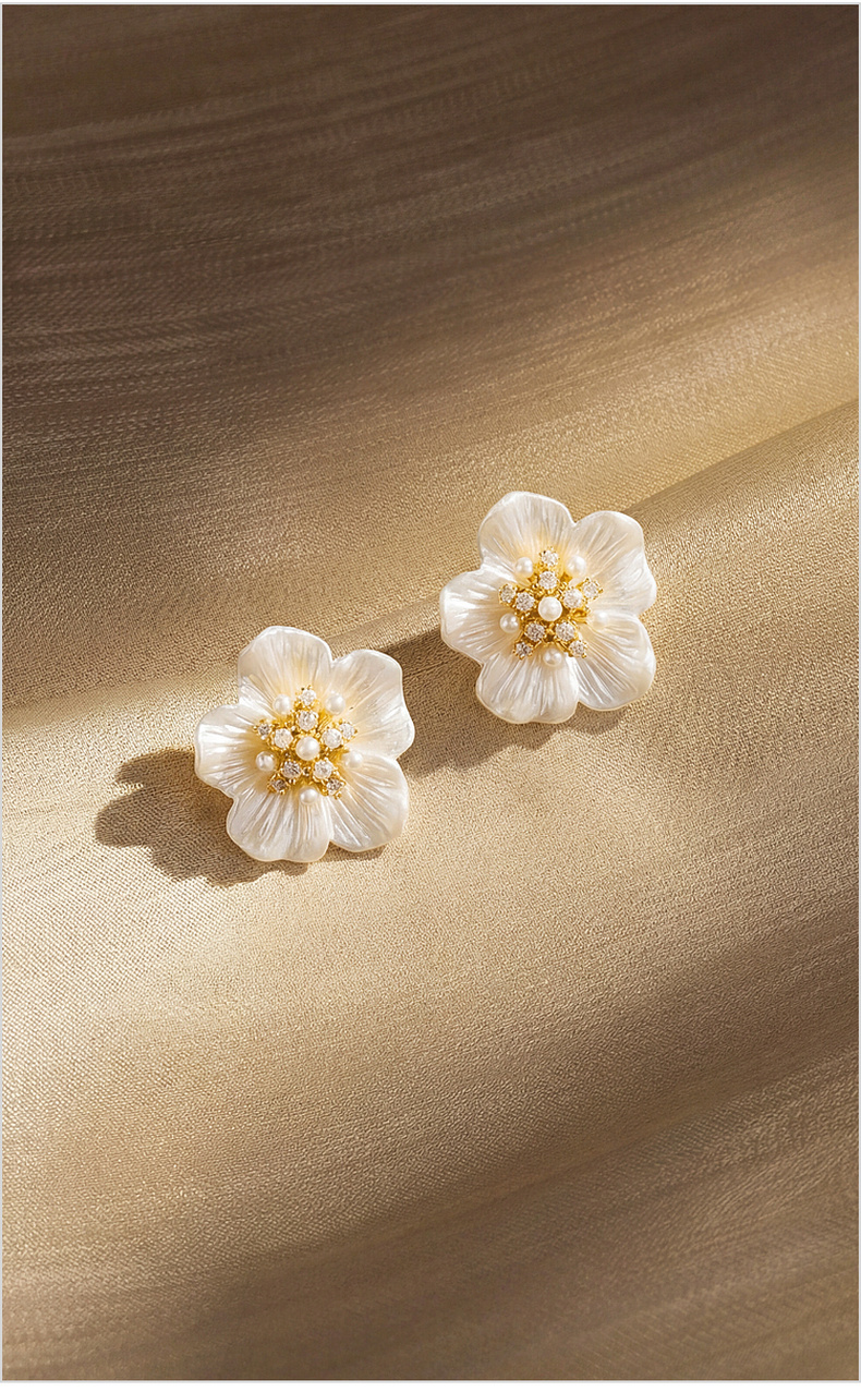三彩2026新款立体肌理花瓣花朵耳钉S925银针法式复古轻奢珍珠