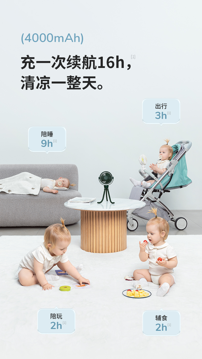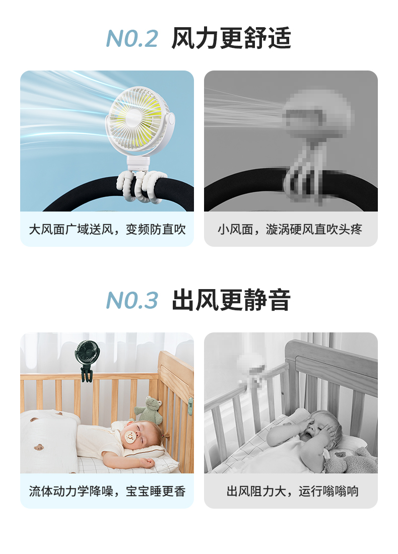 几素【母婴专研】婴儿车风扇小型宝宝推车柔风小风扇便携充电学生宿舍儿童迷你床上夹式防夹手bb车专用变频睡眠风+四档调节+720°旋转出风