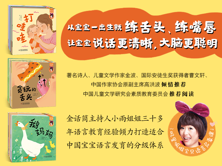 小雨姐姐为孩子讲了三十多年的故事,她陪伴了无数孩子的成长,也从孩子的成长中找到了中国语言艺术的发展动力。她用半生的语言教育经验,结合0-3岁语言发育目标和要求,为中国宝宝打造了这套《叽里呱啦宝贝语言启蒙课》,从说话表达、语言训练、语言艺术等角度对语言运用进行科学分级,让孩子在愉快的绘本阅读中开展语言游戏,在语言游戏中激发语言功能健康发展,体会语言艺术的魅力。