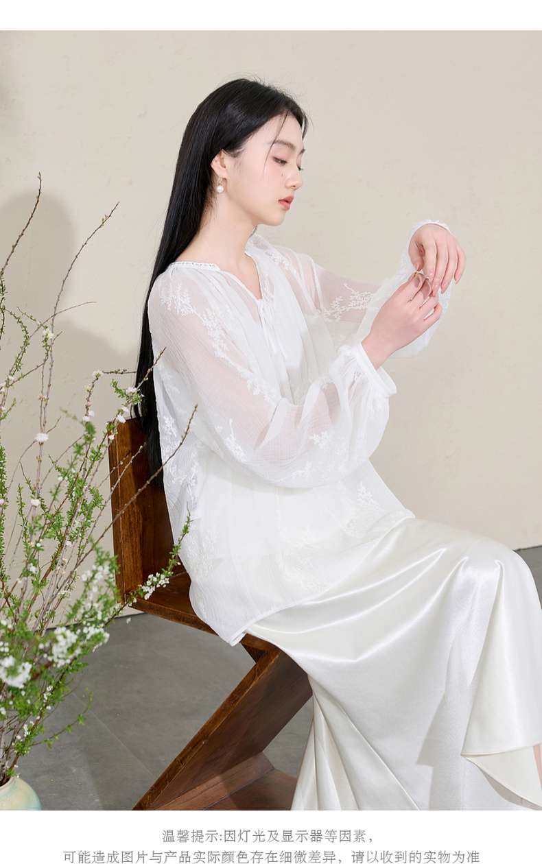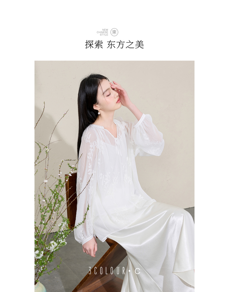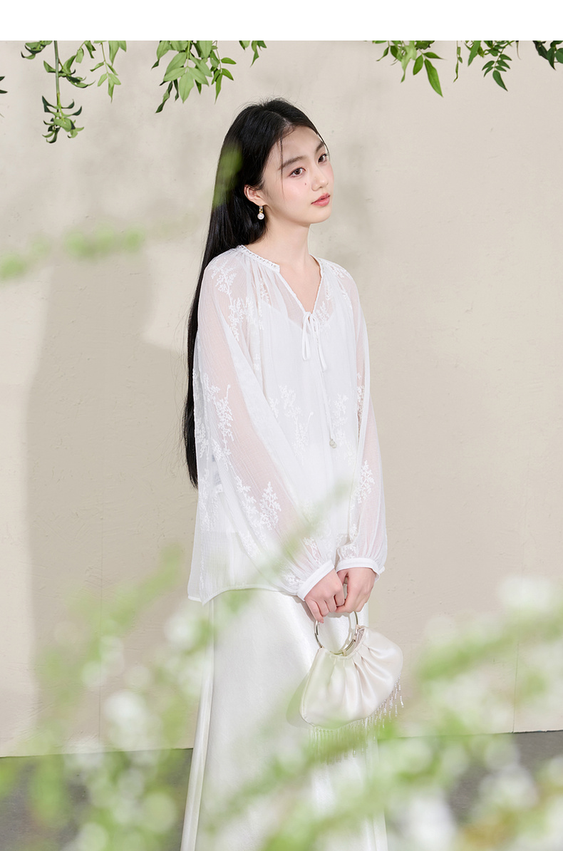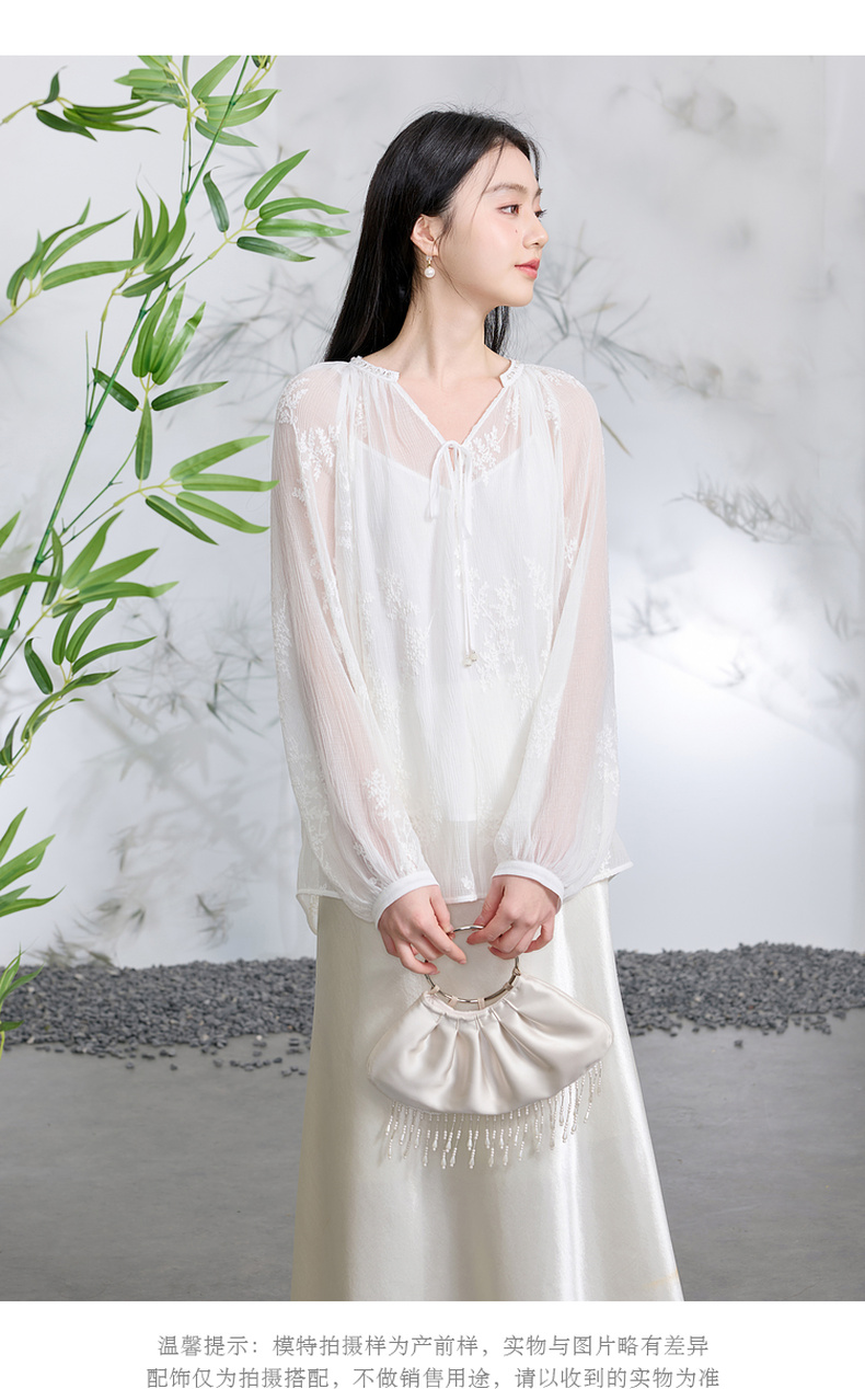 三彩【素影浮光】2026春季新款中式绣花V领衬衣小衫长袖宽松C