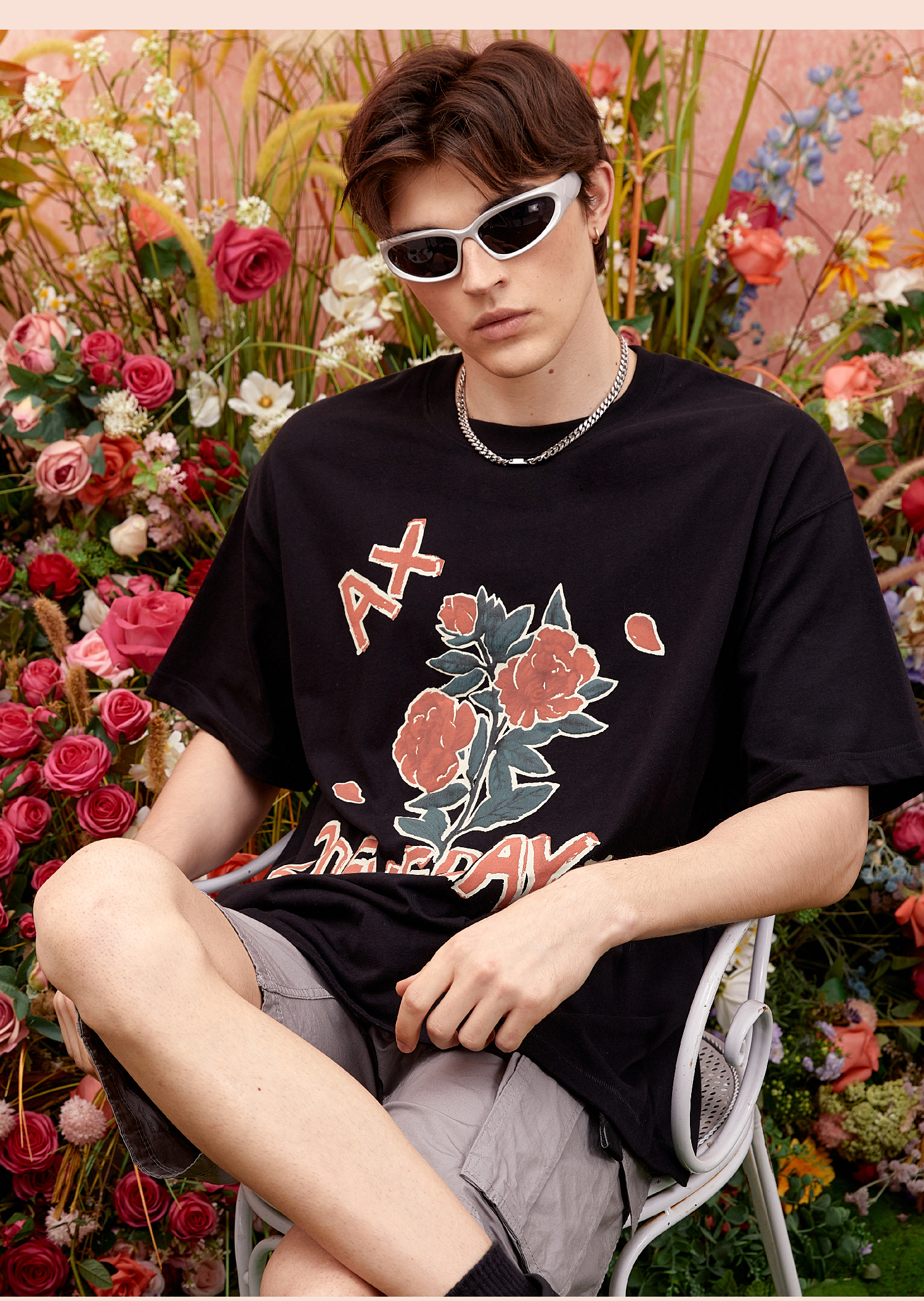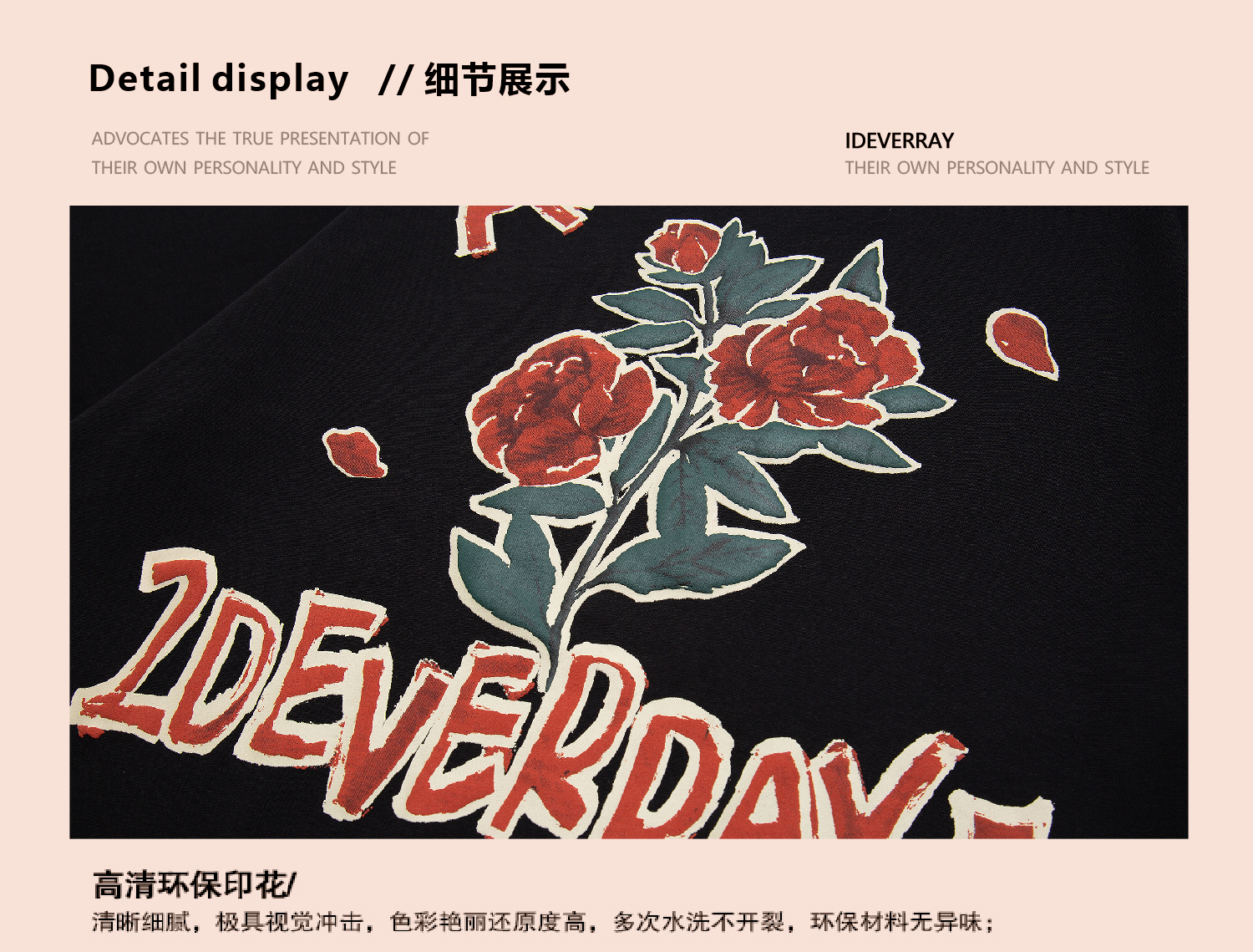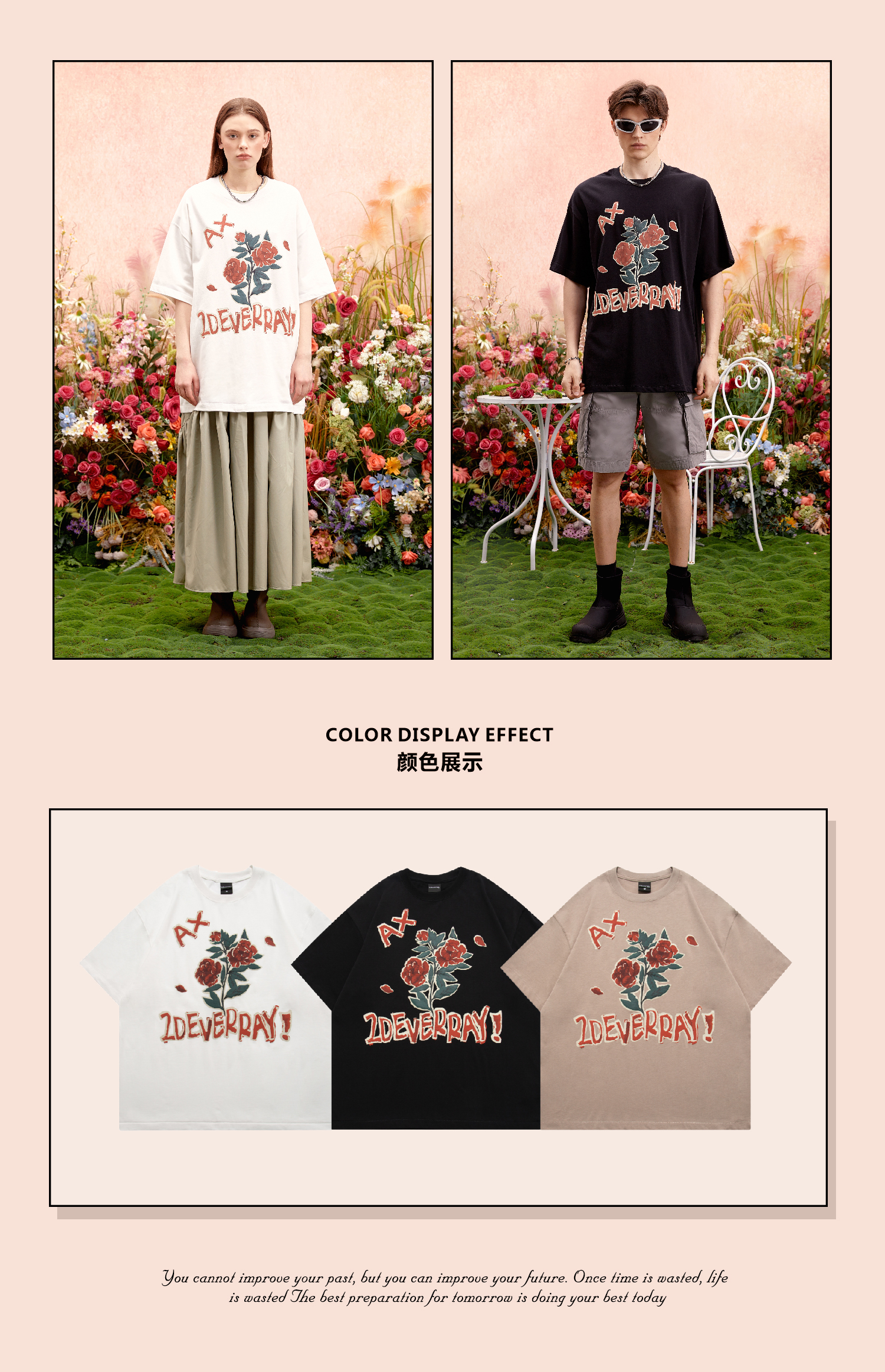 IDEVERRAY品牌夏季美式复古玫瑰花瓣印花短袖宽松休闲情侣衫T恤男21MSL-TM662