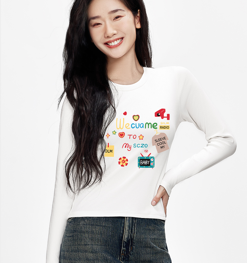 「棉的美学」230g重磅开心花瓣印花长袖T恤女打底衫宽松休闲上衣