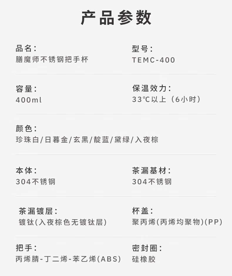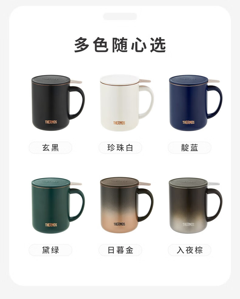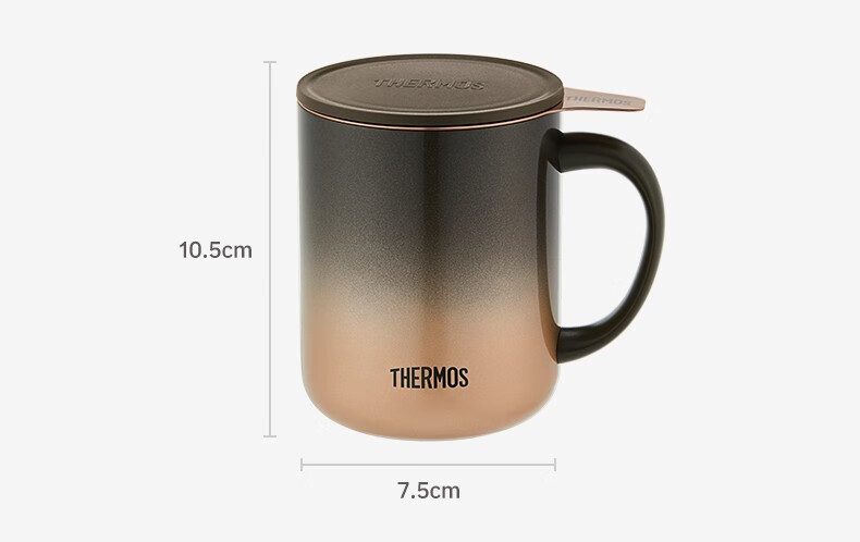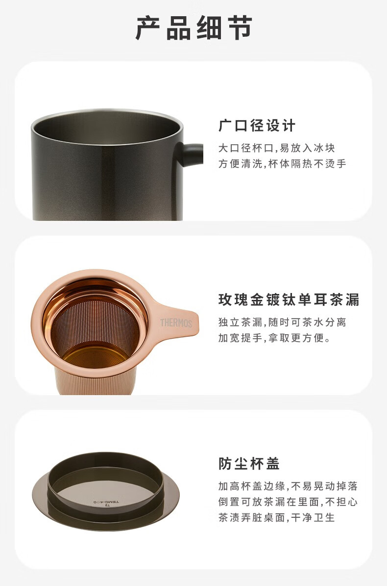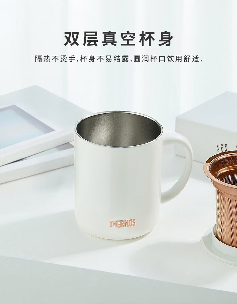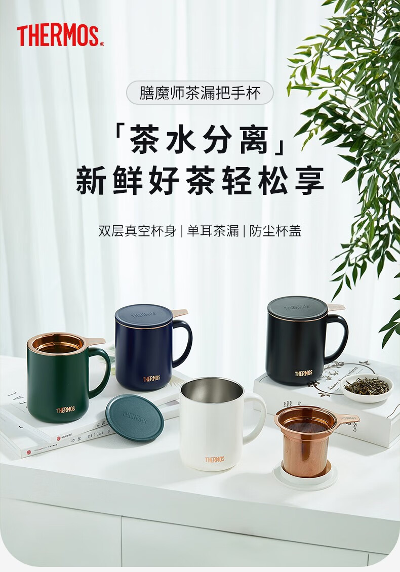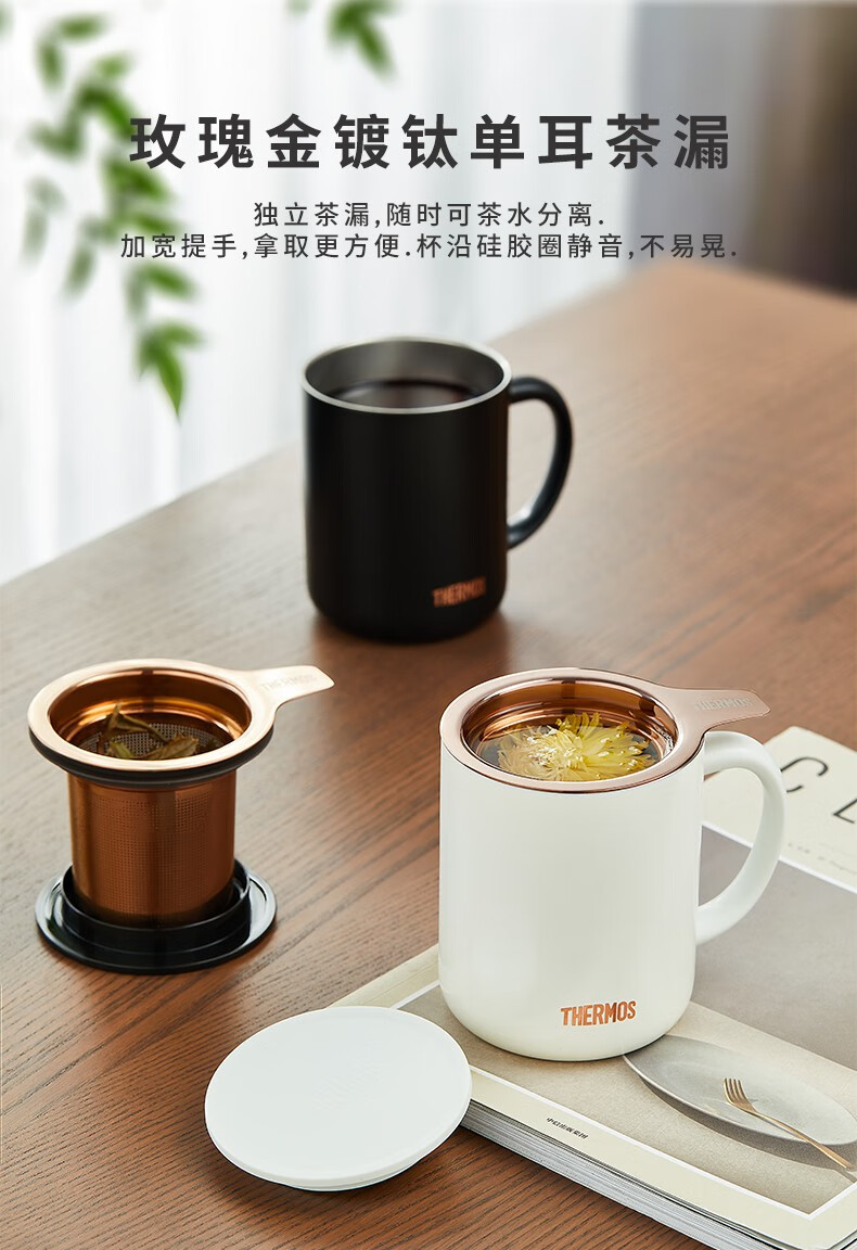 膳魔师(THERMOS)不锈钢茶漏把手杯商务办公保温咖啡杯泡茶简约马克杯 TEMC-400 玄黑