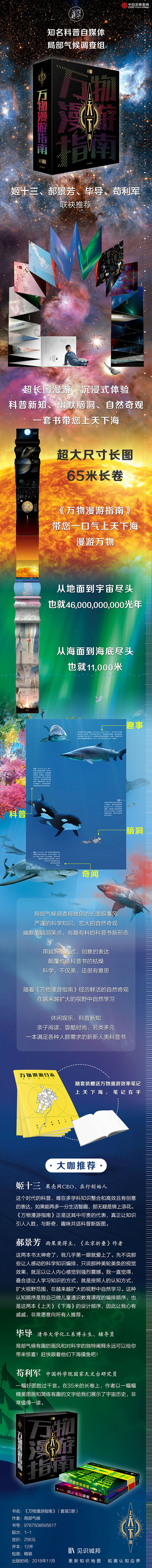 这是一本用一张连续不间断的长图带领读者从地球表面出发进入茫茫宇宙,了解天文学知识的国内原创科普图文书。从地面一飞上天,突破大气层,遨游太空,直到910亿光年外人类可观测的的宇宙尽头。读者在沿途将看到令人惊叹的宇宙奇观,同时通过作者诙谐幽默的图形和文字语言学习到各种新奇的天文学知识。创作团队用8个月时间详细梳理天文知识,征询国家天文台相关专家意见后,通过设计语言将其转换成年轻人感兴趣、看得懂的图文语言。全书采用经折装,展开后为一幅17米的长图(正反面都有内容),表现形式和创作手法新颖独特,体现了国内年轻原创科普创作团队的活力。