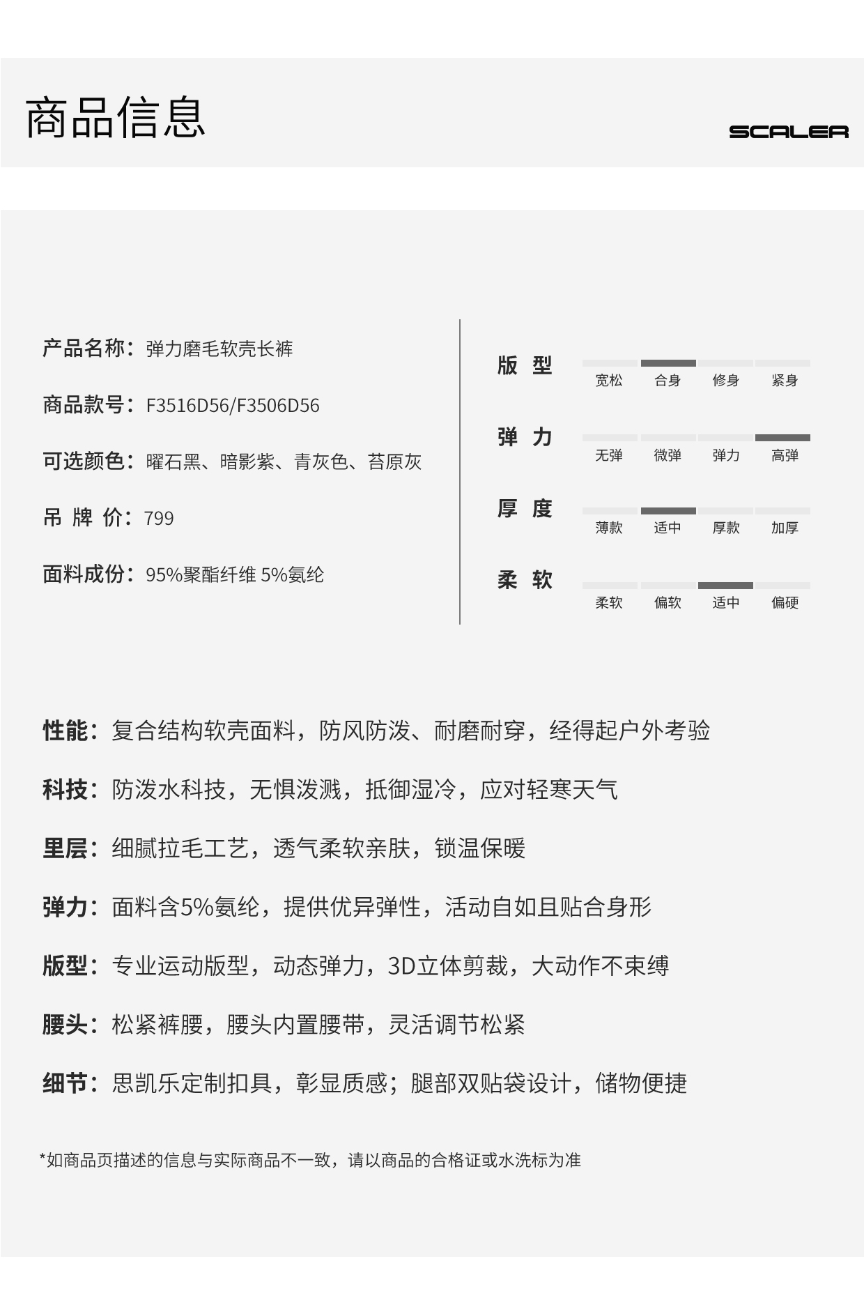 【弹力磨毛软壳长裤】SCALER/思凯乐 男女款防泼水舒适保暖裤子F3516D56