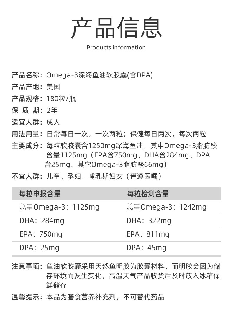 Viva美国进口高纯度rTG深海鱼油DPA天然omega3欧米伽3软胶囊180粒