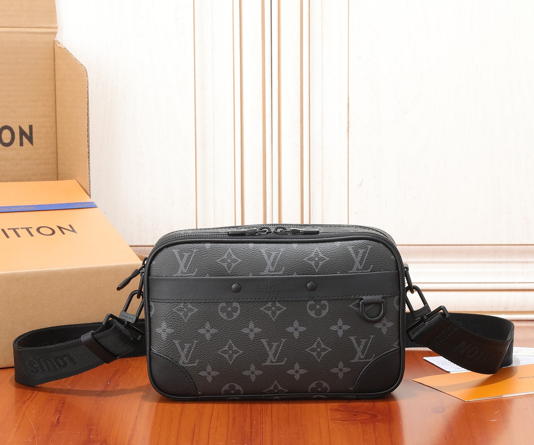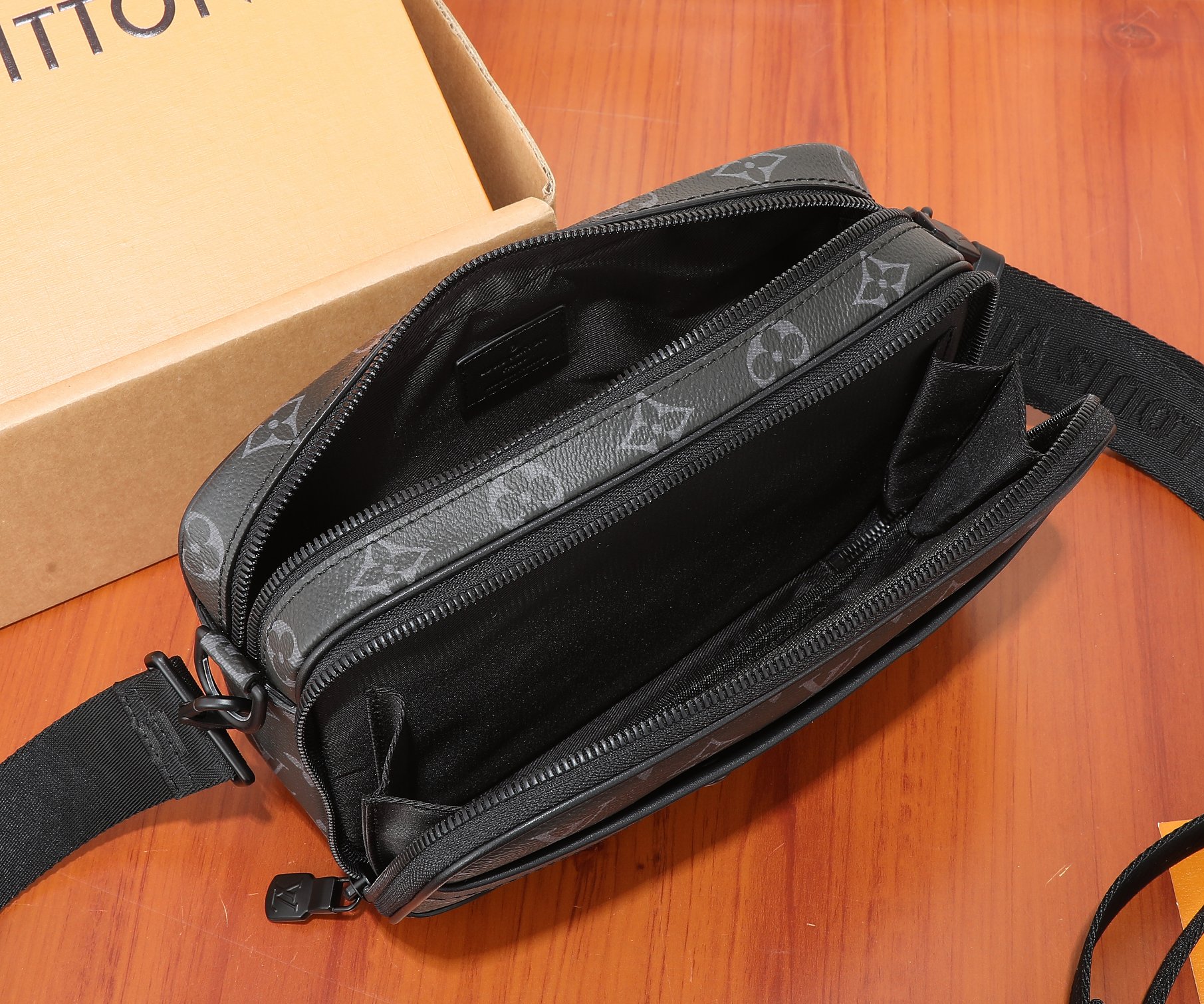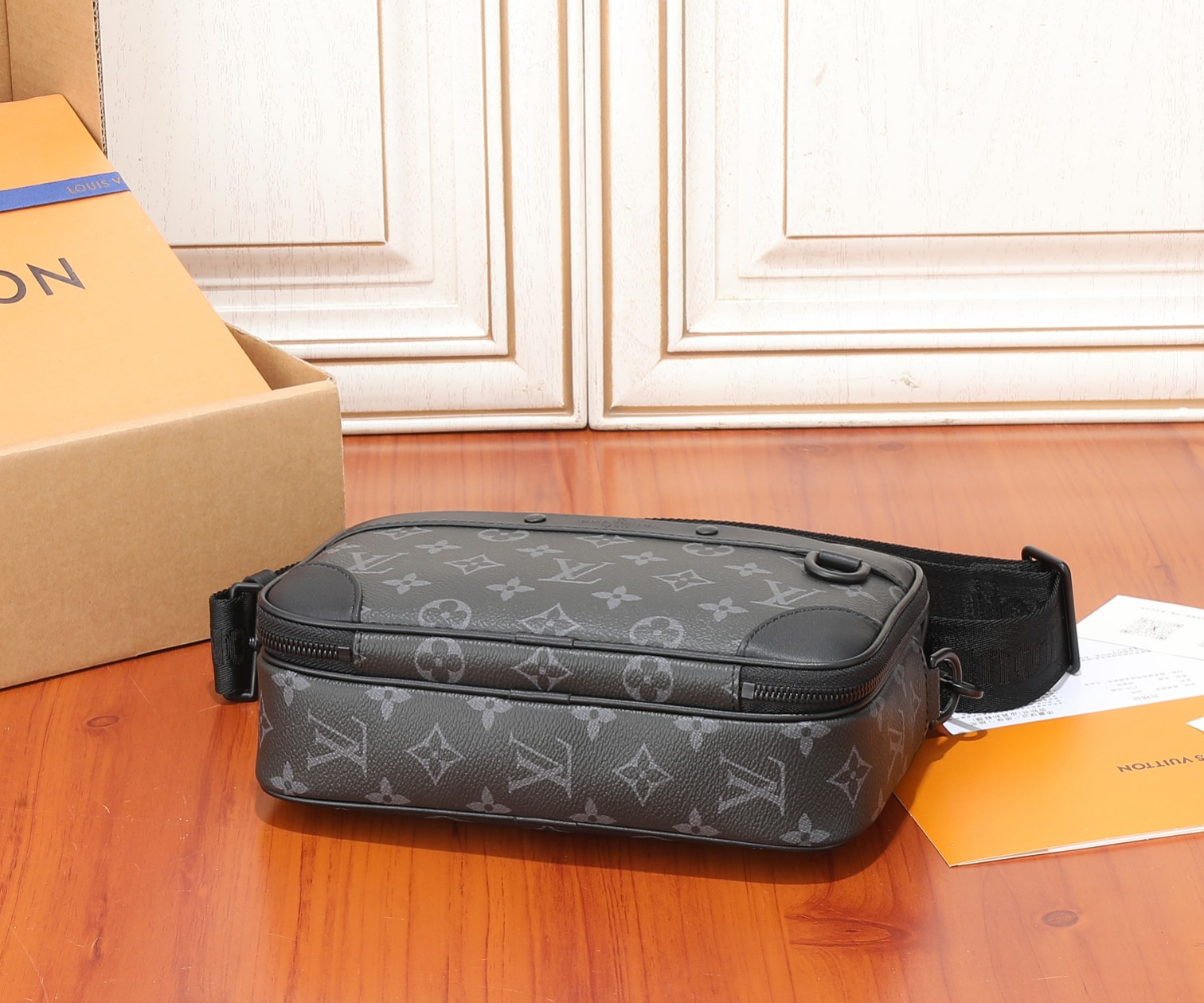 原版开发,全钢五金👏👏 本款 Alpha 邮差包取材 Monogram Eclipse 帆布,以摩登笔触演绎玲珑构型。拉链隔层确保物品安全无虞,前袋铆钉再添品牌印记。Monogram Eclipse 涂层帆布一牛皮革饰边一织物内衬一金属件一硬箱风格加固包角一铆钉一拉链隔层一前贴袋一内贴袋一正面配有 D 形环一肩带:可拆卸,可调节!!