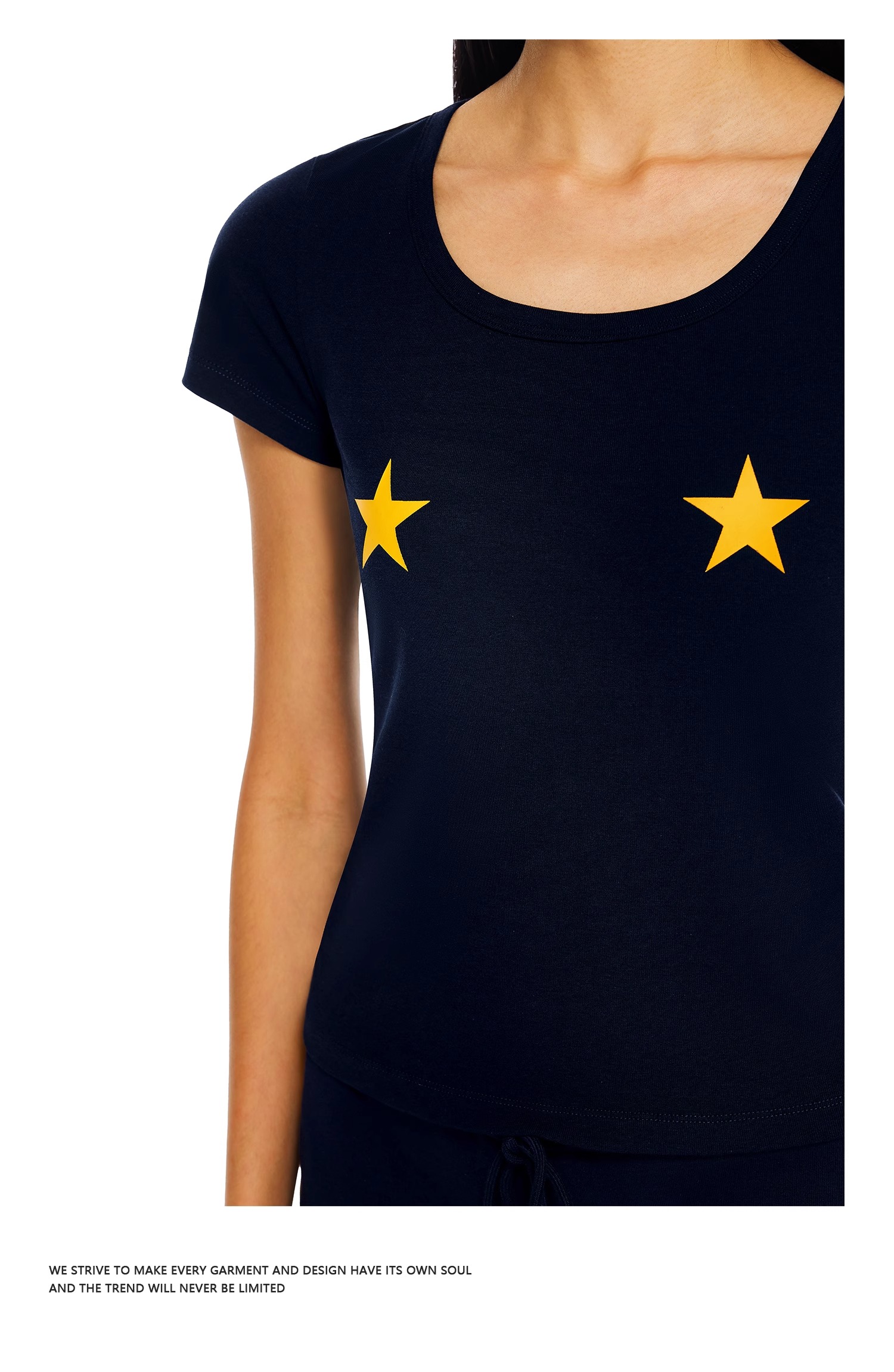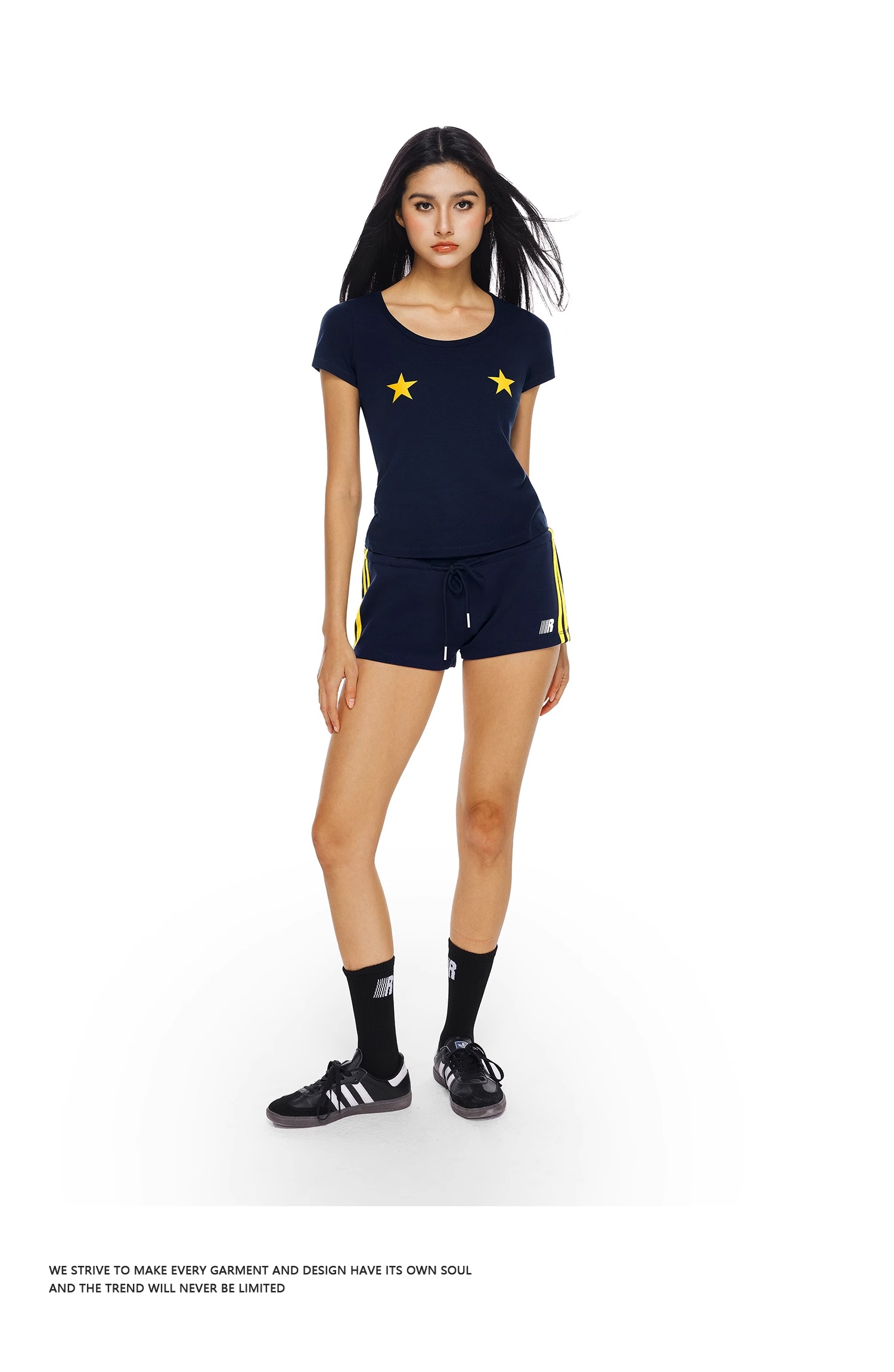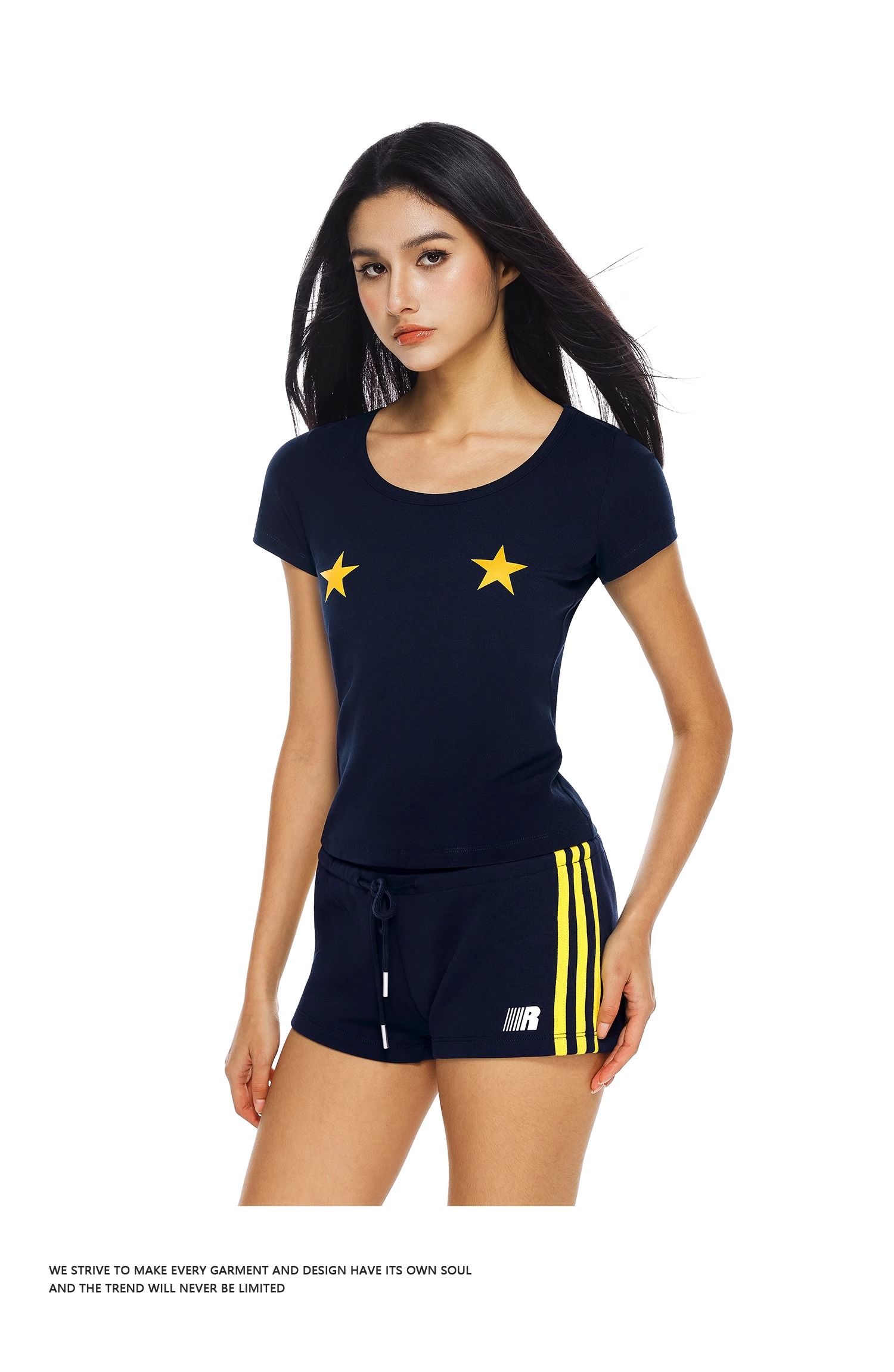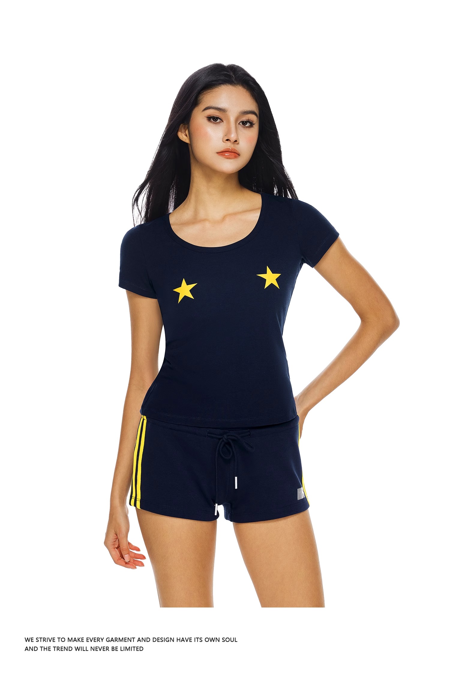 FDR官方店 辣妹星星撞色U领正肩短袖t恤男女夏季修身显瘦上衣