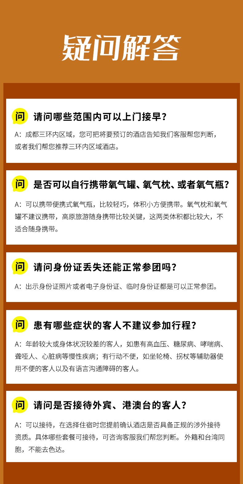 【集合须知】由于早上要从成都各个地方接人到指定地点集合上车出发,淡季(11月-次年4月)小车师傅会在出发前1-1.5小时开始接人,旺季(5月-10月)/节假日会在出发前2-2.5小时开始接人,故部分客人会提前1小时左右到达出发集合地点,请耐心等待,敬请谅解。