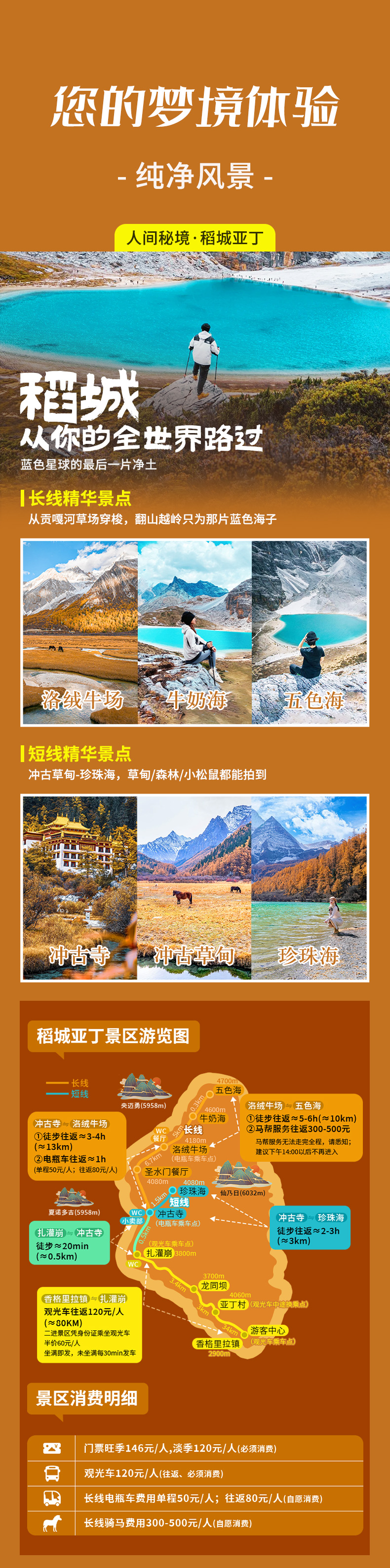 注:亚丁景区贡嘎措至牛奶海、五色海区域,因冬季道路结冰等安全原因,2025年11月24日—2026年4月15日期间实施封闭管理;长线封闭期间,请游玩短线,且景区门票价格调整为120元/人。