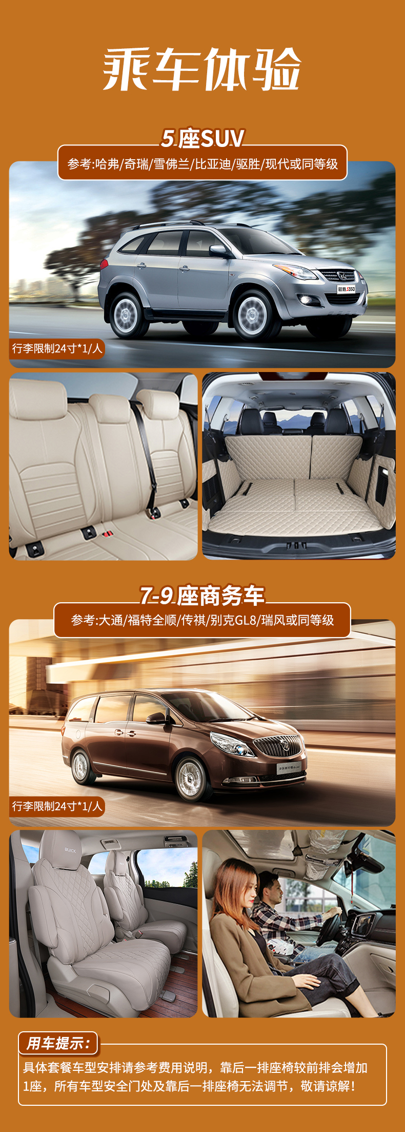 注:车型不支持指定,根据人数调派车型,保证一人一正座(行车座位须每天轮流换座,不指定安排座位,如您有特殊需求,可在团上自行协调,敬请谅解)。