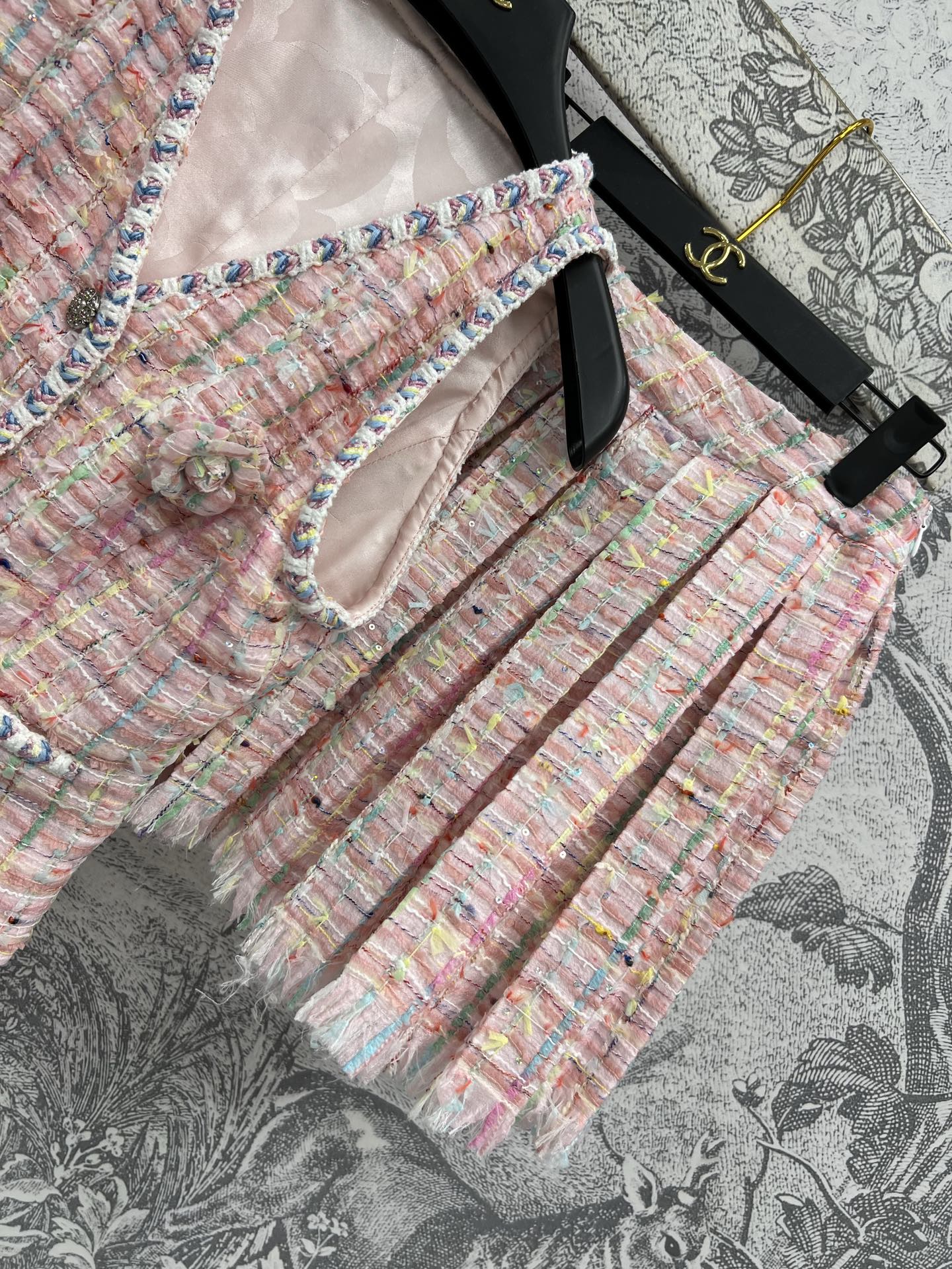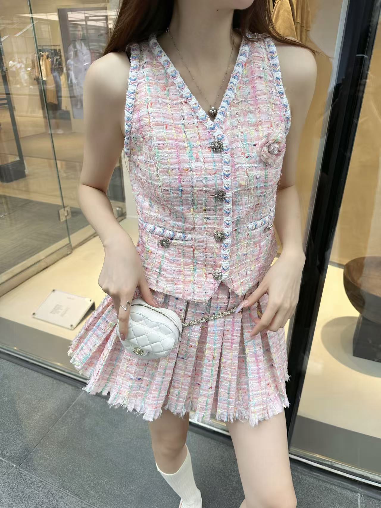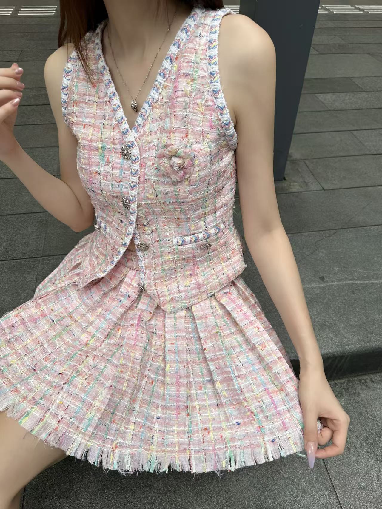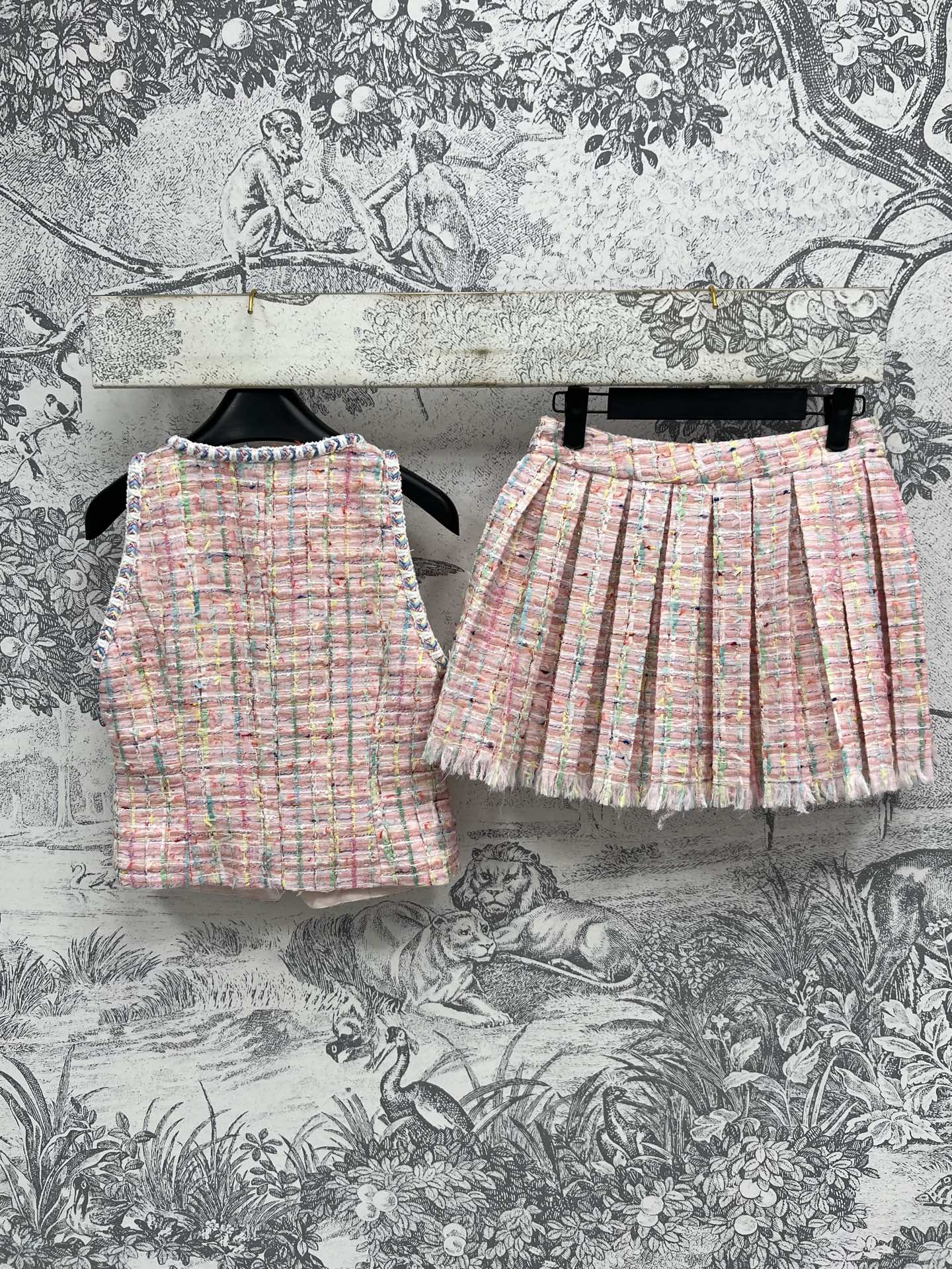 小香风 25春夏新款 彩色编织粗花呢套装 V领马甲+百褶短裙