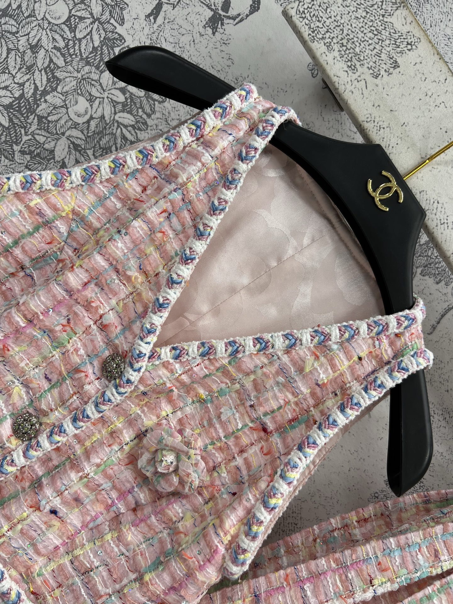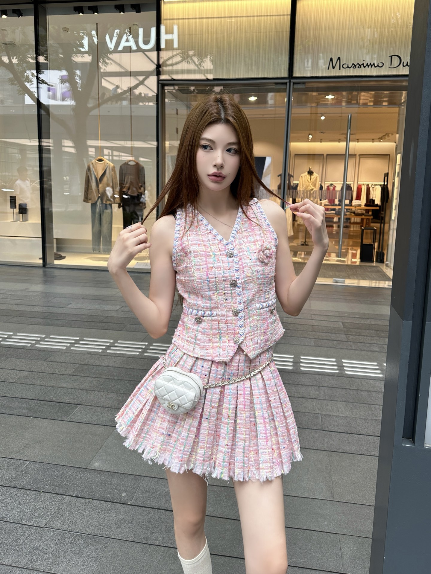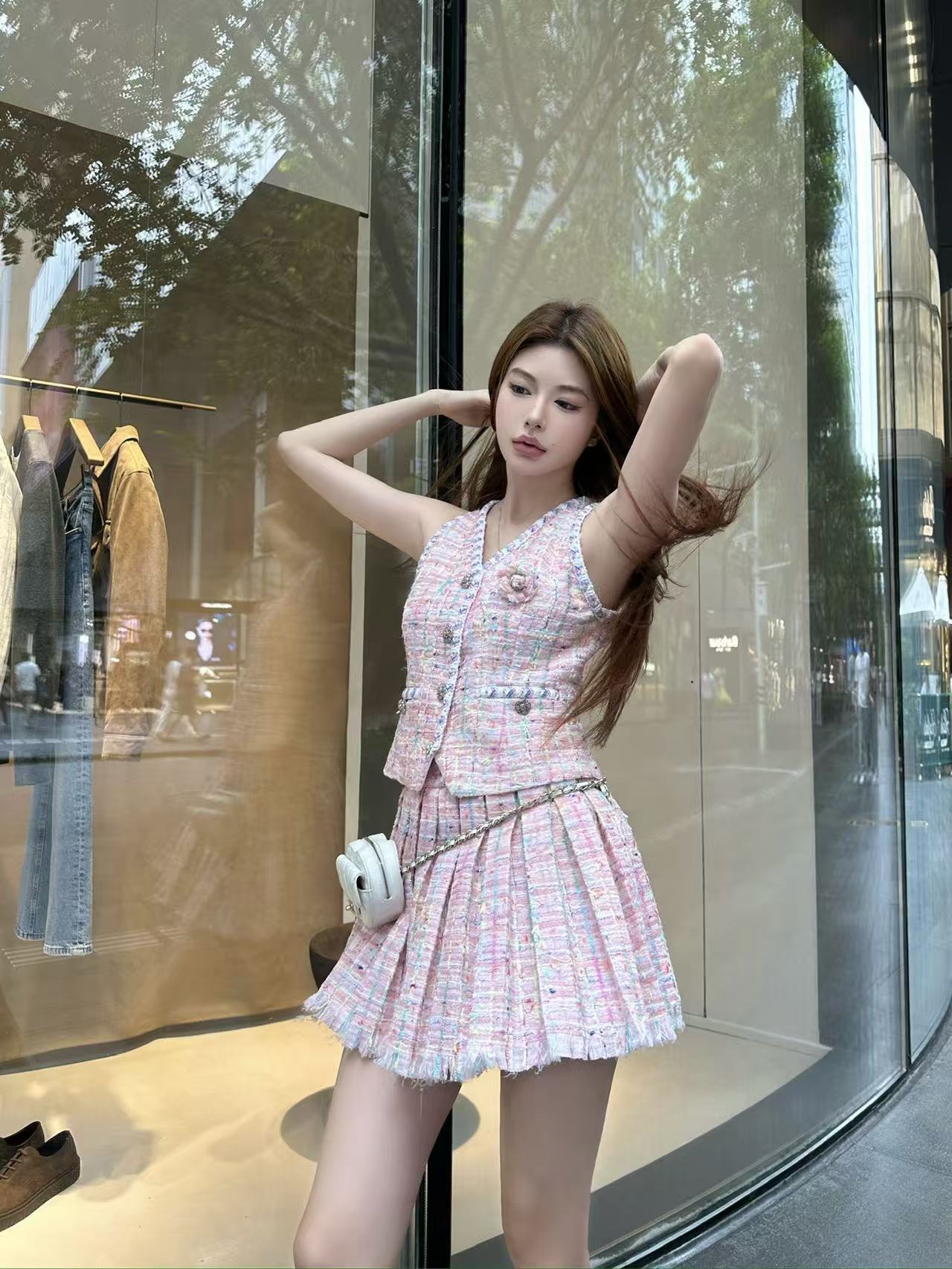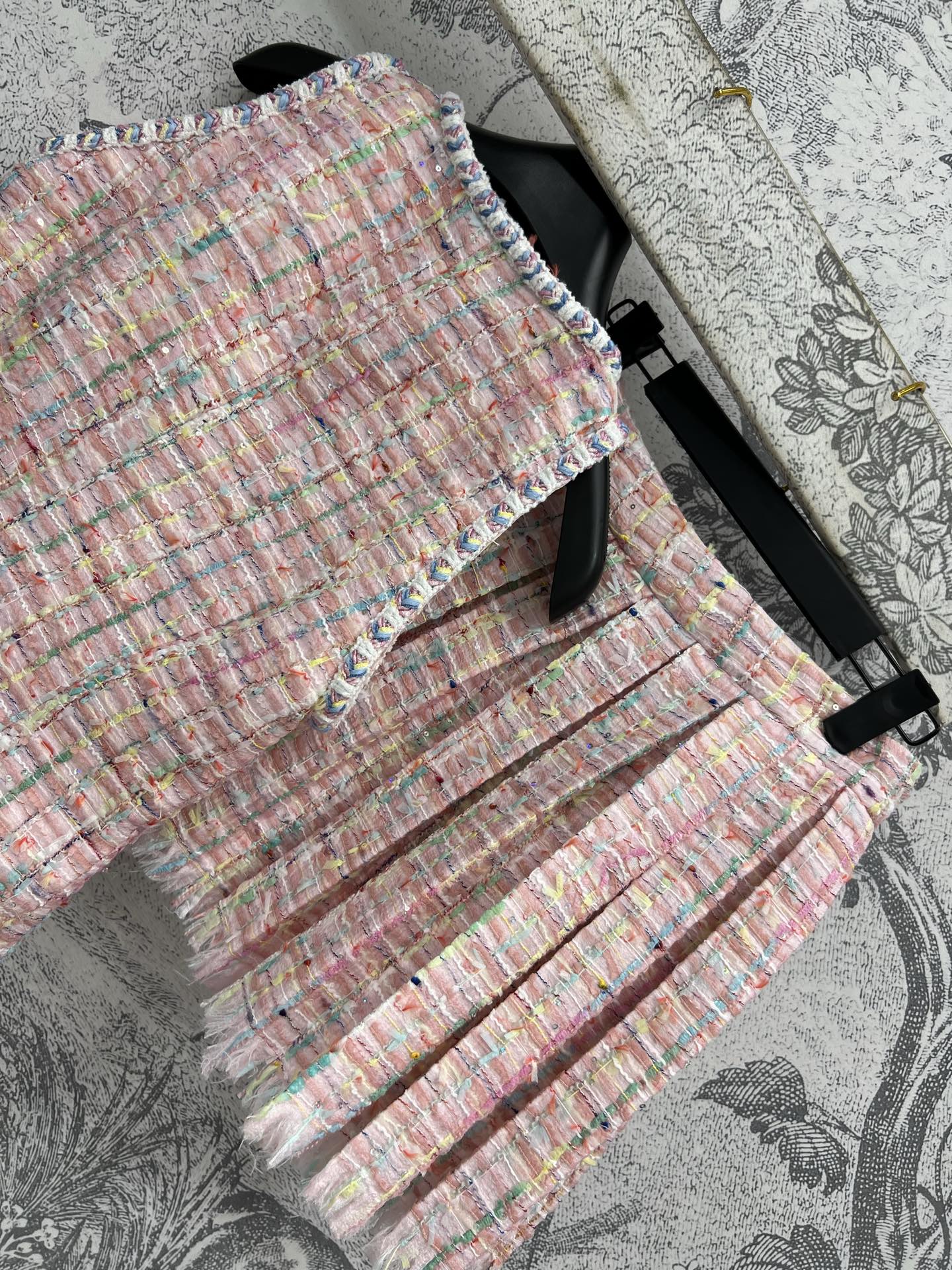 小香风 25春夏新款 彩色编织粗花呢套装 V领马甲+百褶短裙